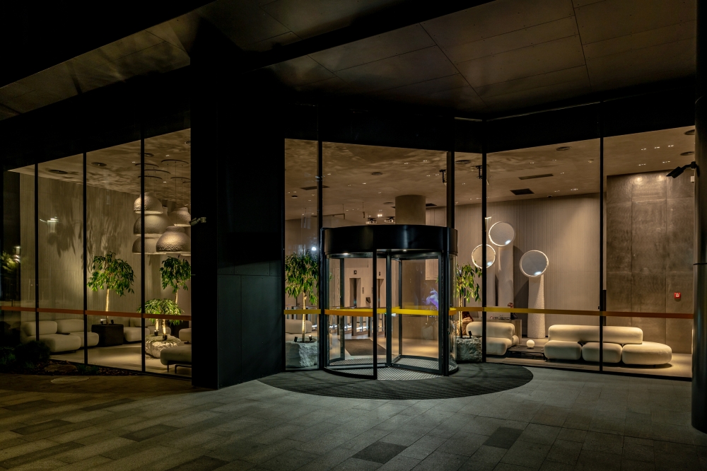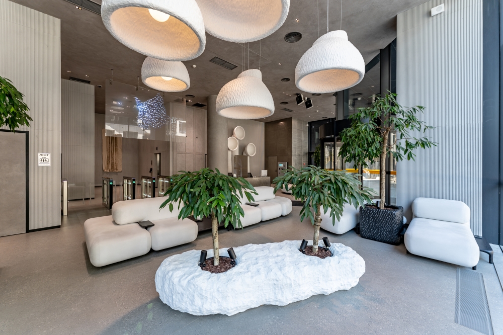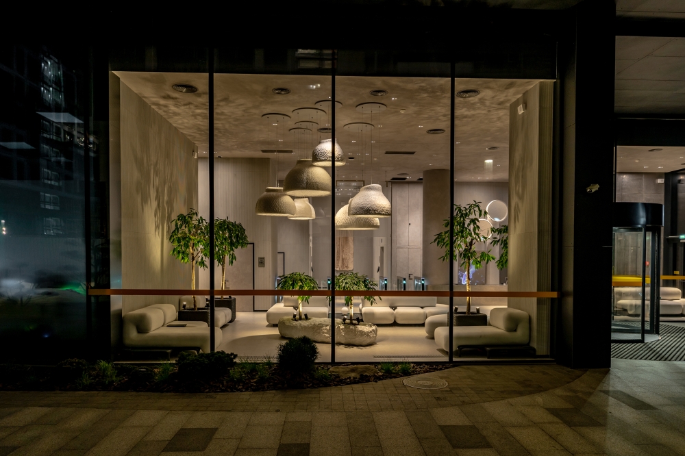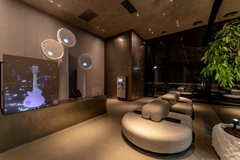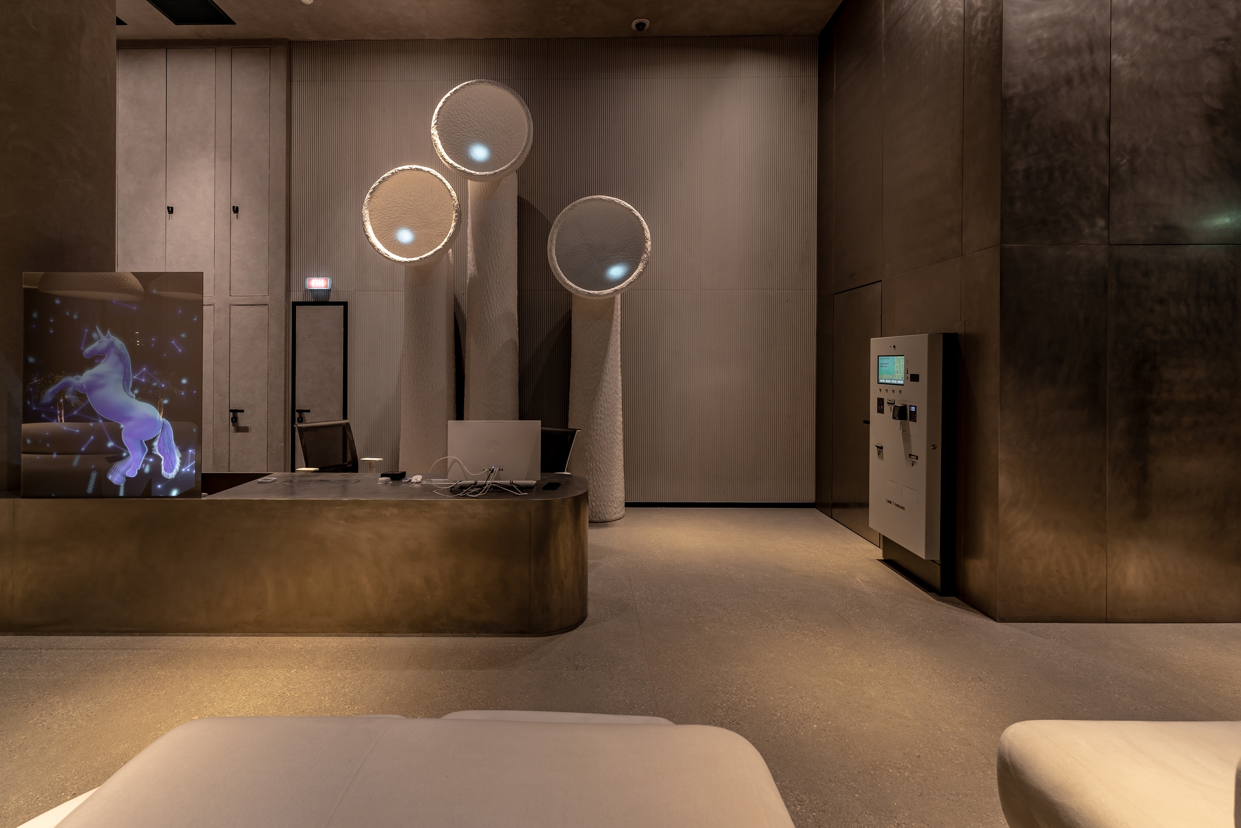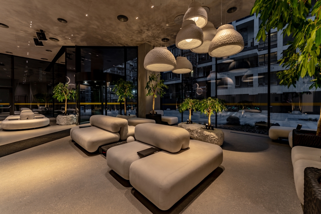 For the holographic custom screen near the front desk, we designed and implemented digital moving avatars that reflect the values of Unit City. And for the floor lamps, we made not just a 3D mapping projection, but with special sensors of the latest generation of Lidar and with custom software from Expolight, we turned them into the behavior of a digital animal, thus symbolizing the futuristic and innovative nature of the park.