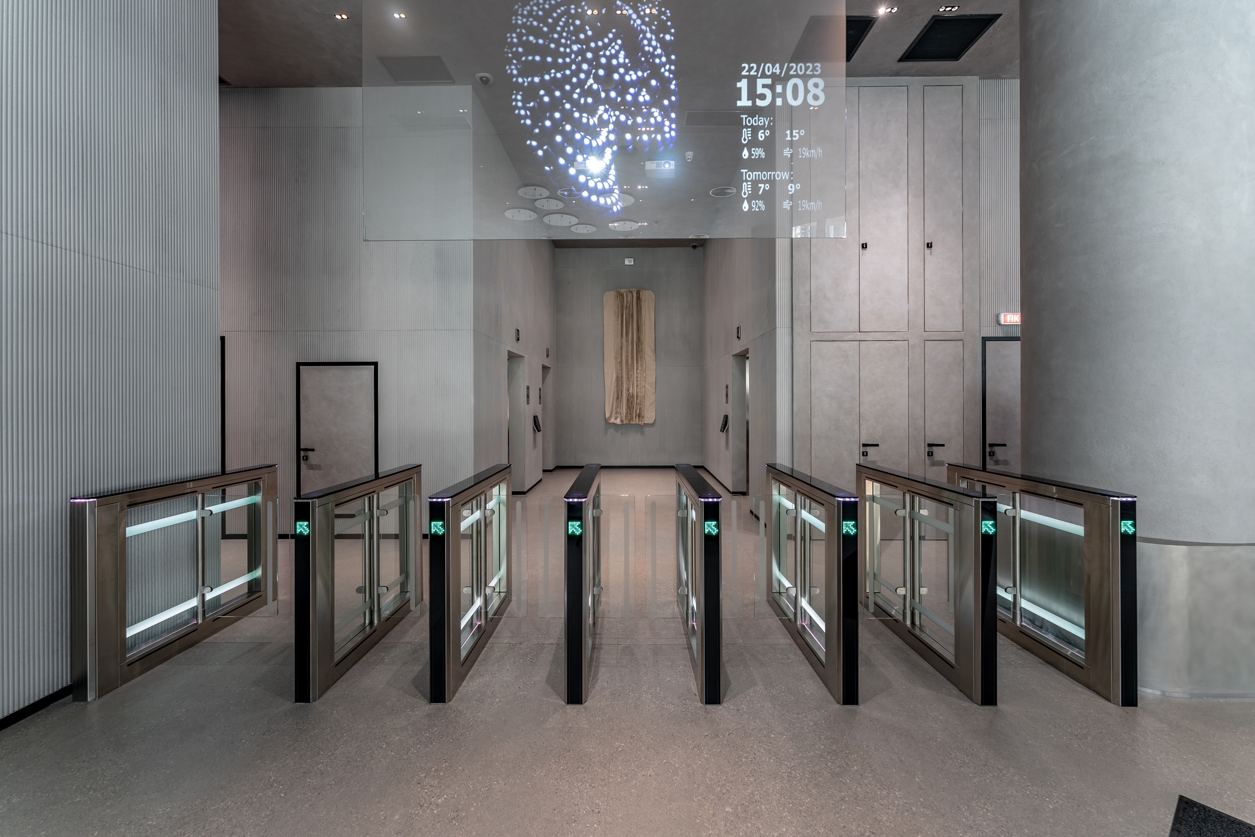 To do this, we created a transparent glass screen with a digital holographic sculpture above the passage area, which displays in real time every 10 minutes various visual images based on Big Data, to which we carefully selected a symbolic meaning and name. The screen is also supplemented with convenient widgets for guests (time, date, weather, etc.).