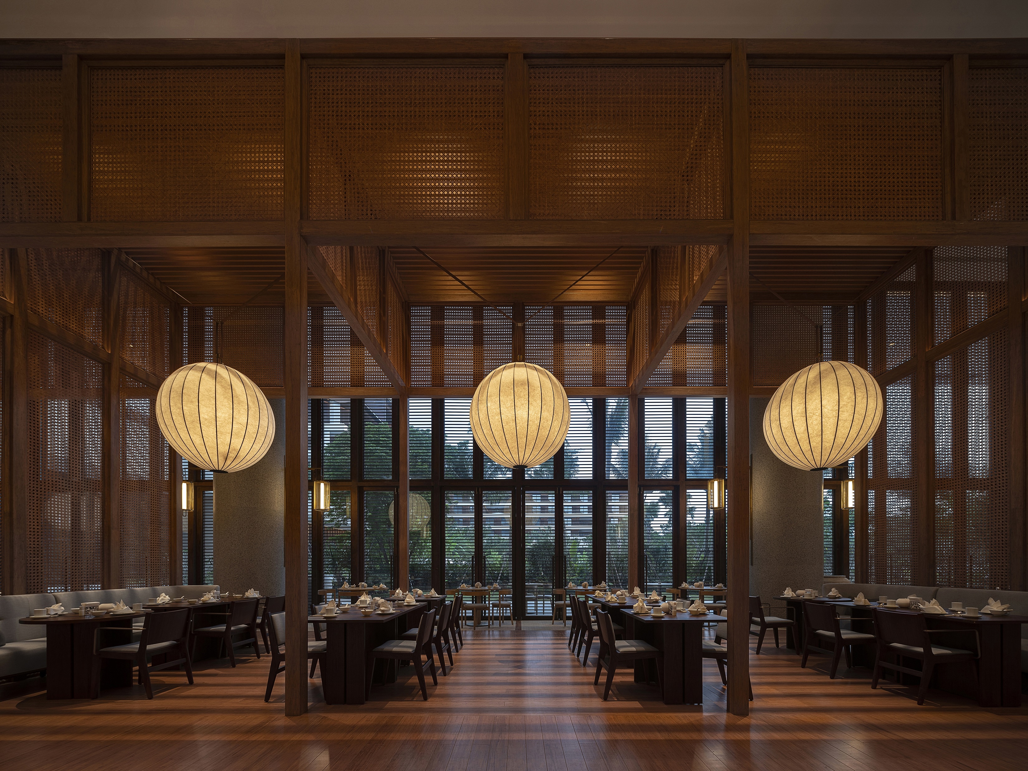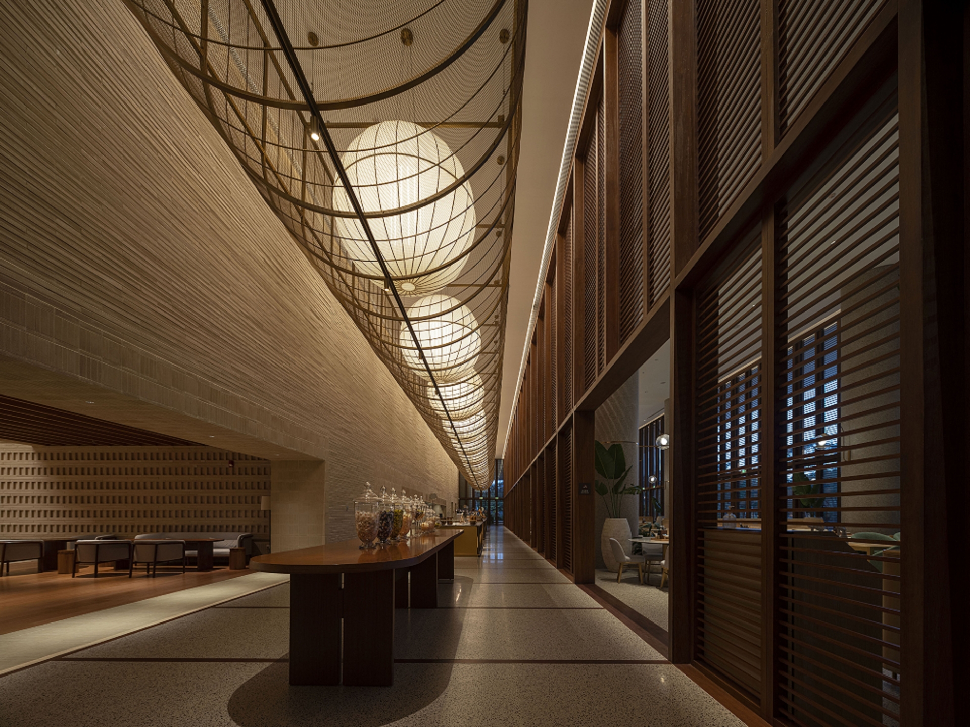 The elements of fishing nets and lanterns are turned into a big pendant light and became the visual center of all-day dinning. Integrated paper pendant lights provide a comfortable ambient light and accent lights provide necessary brightness for the long table. It achieves the function and aesthetic requirements.