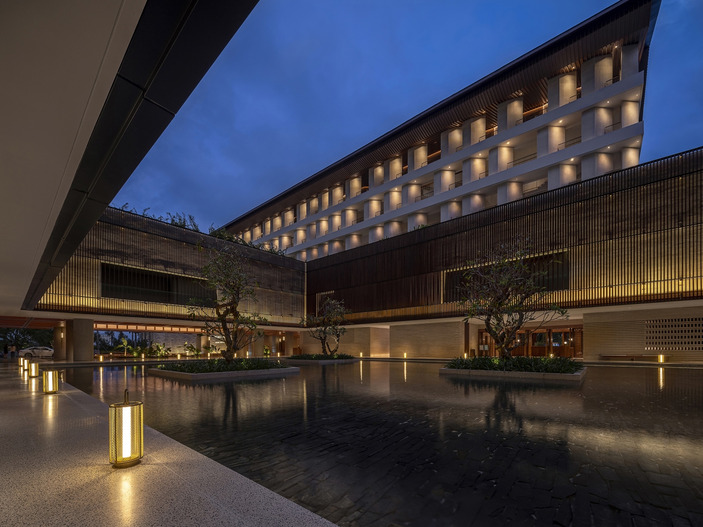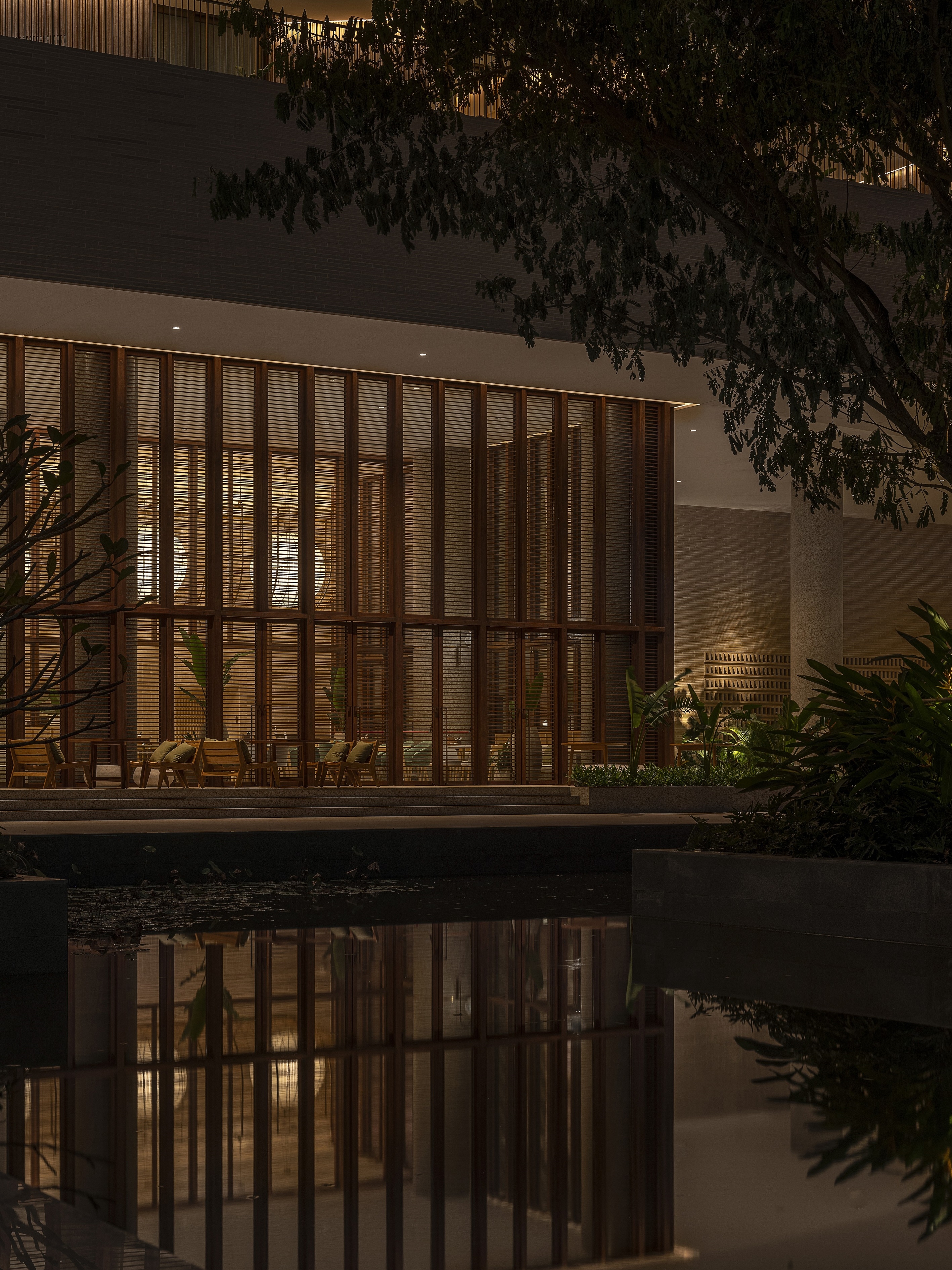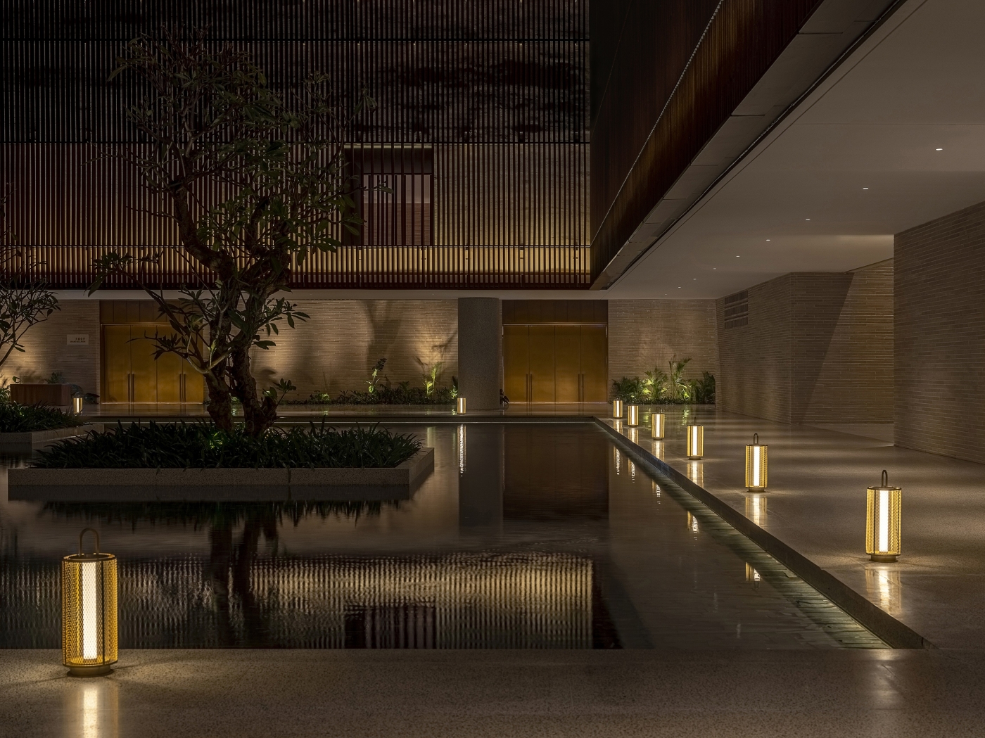 In the Water Courtyard, downlights are used to provide a low-level ambient light environment with subtle rhythm. In-ground up-lights are used to light the plants and to create vivid images by shadows on the wall. The decorative lanterns are arranged in rhythm. Three lighting elements are used to enhance the vertical vision. The reflecting pool becomes a background to reflect the different image of sky and the building façade from day to night.