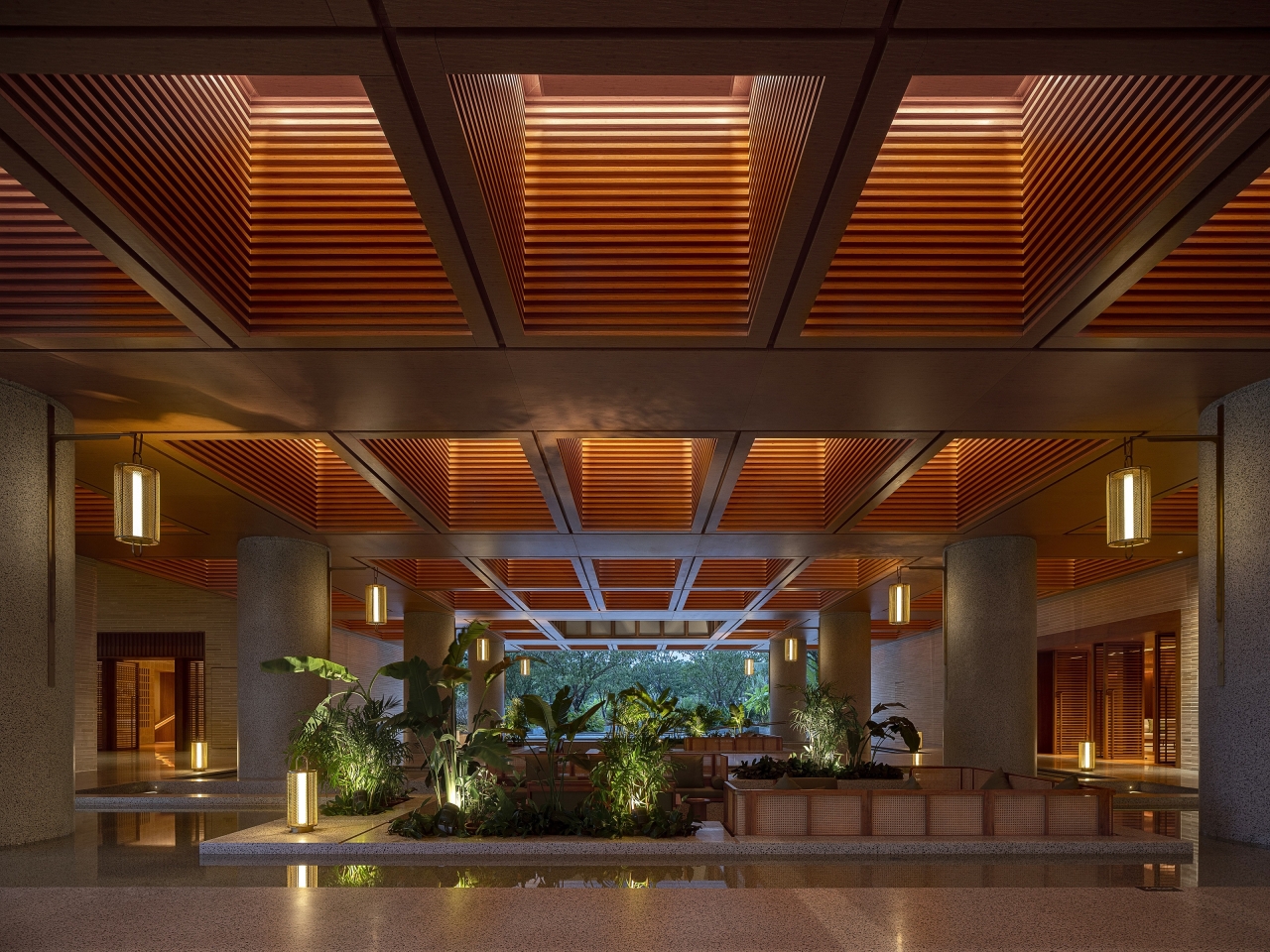 The 'light box' with dimming system in the lobby represents the concept of paper lantern. During nighttime, the brightness of the paper lantern will be controlled appropriately. Even and soft light are supposed to produce a relax atmosphere and to express sincere welcome to all guests while they stay in this space.