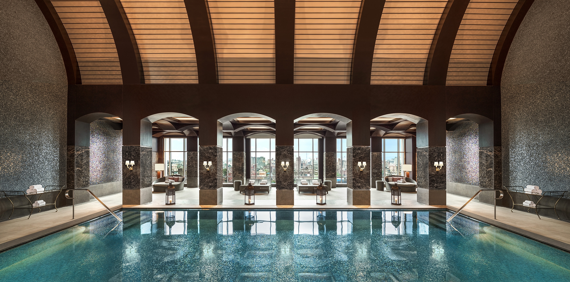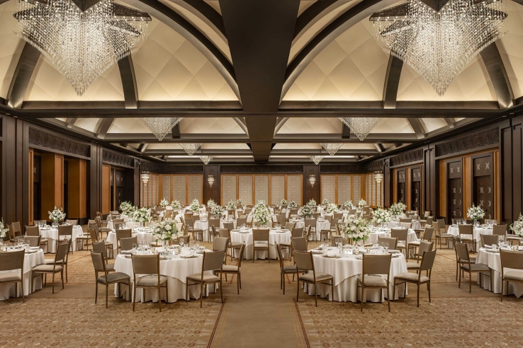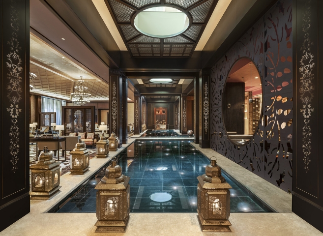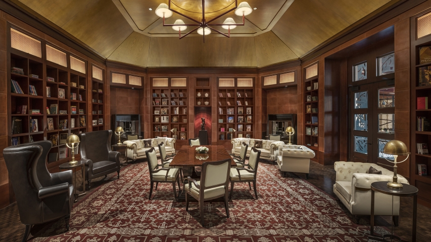 Contemporary elegance and flexibility are key and can be experienced throughout. Upon entering the Hotel Lobby, guests are met with an intricately designed interior, including a detailed ceiling enhanced by perimeter uplighting and anchored by an opulent, custom, 250,000-piece crystal chandelier. Localized lamps and simplified overhead lighting provide intimacy at furniture groupings and private seating areas. In the grand ballroom, a subtle uplight enhances the textured wood ceiling, crystal chandeliers adorn the room, and small downlights provide intimacy. Lavish decorative chandeliers decorate the multiple dining options. At the world-class spa, a glowing vaulted ceiling illuminates the swimming pool, while decorative sconces and table lamps provide an intimate atmosphere. In the Library, integrated lighting within detailed millwork creates a soft glowing atmosphere while a traditional shaded chandelier anchors the space, with localized lamps at informal seating groups.
