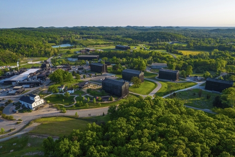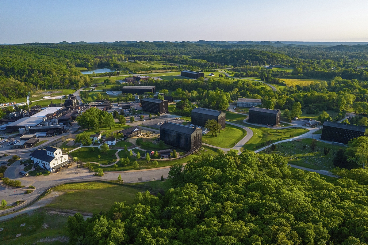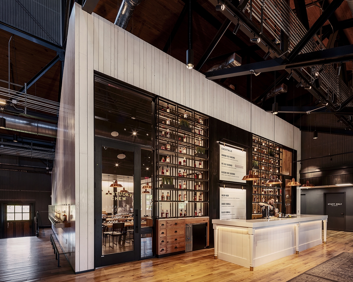 Cohesive design across the 400-acre site was inspired by the warm copper stills, the colors of bourbon, the charred wood of the barrel-aging rickhouses, the original family homestead and Bluegrass country backdrop.