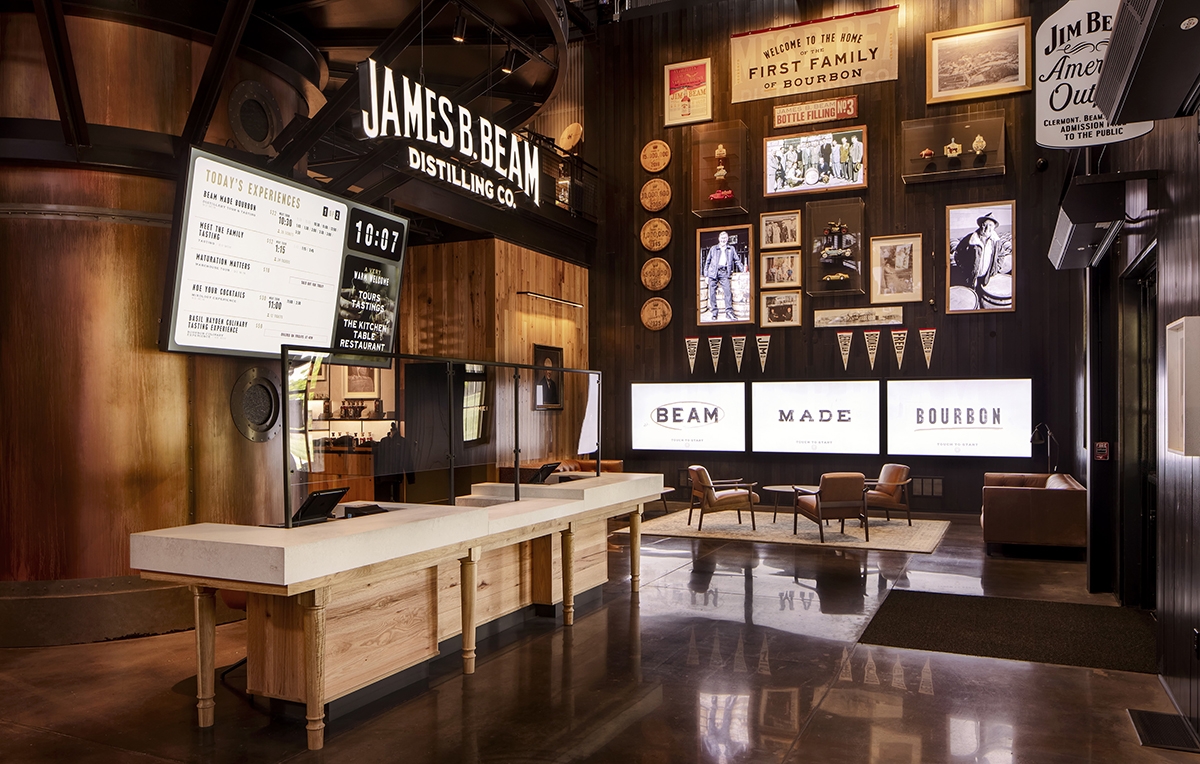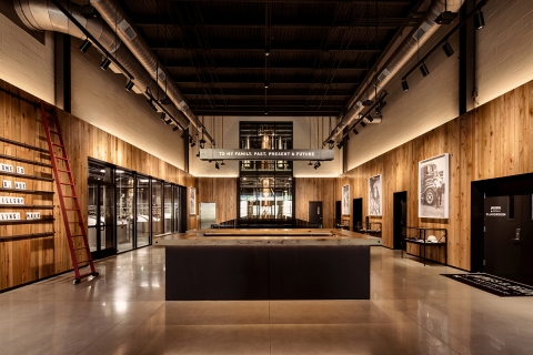 The campus-wide renovation begins with a multistoried edifice serving as tour hub for bourbon tasting and education. Inside, reception areas blend artifacts with dynamic digital content, retail merchandise, tasting bars, and classrooms.