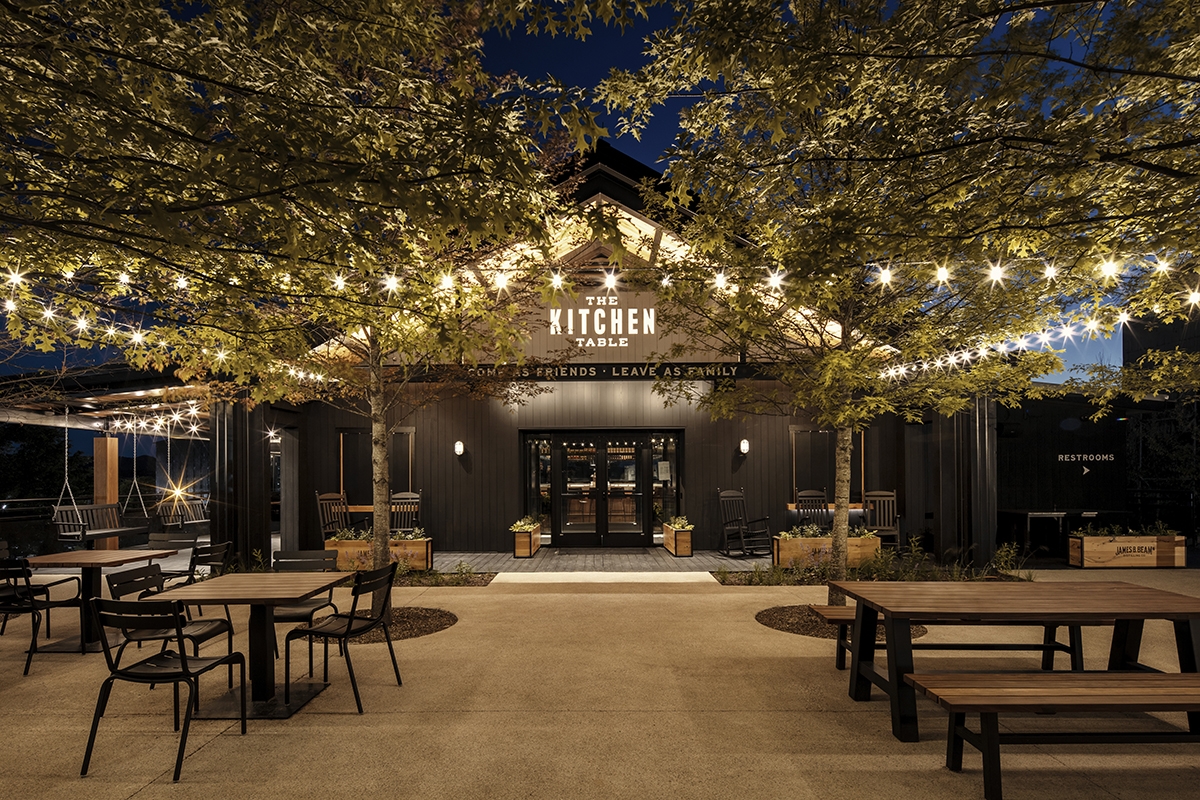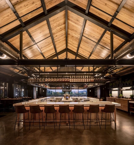 A plaza opens to an A-frame building housing an extensive bar, tables and serveries for an elevated dining experience.