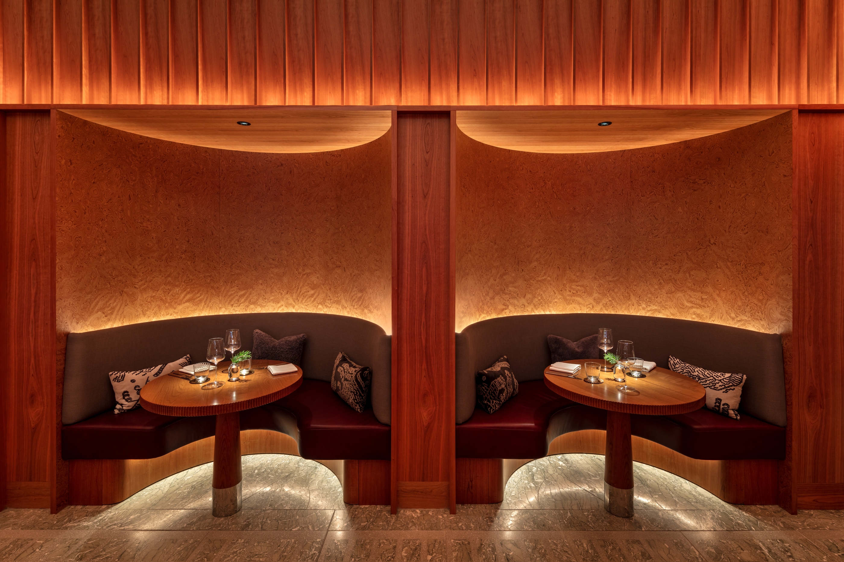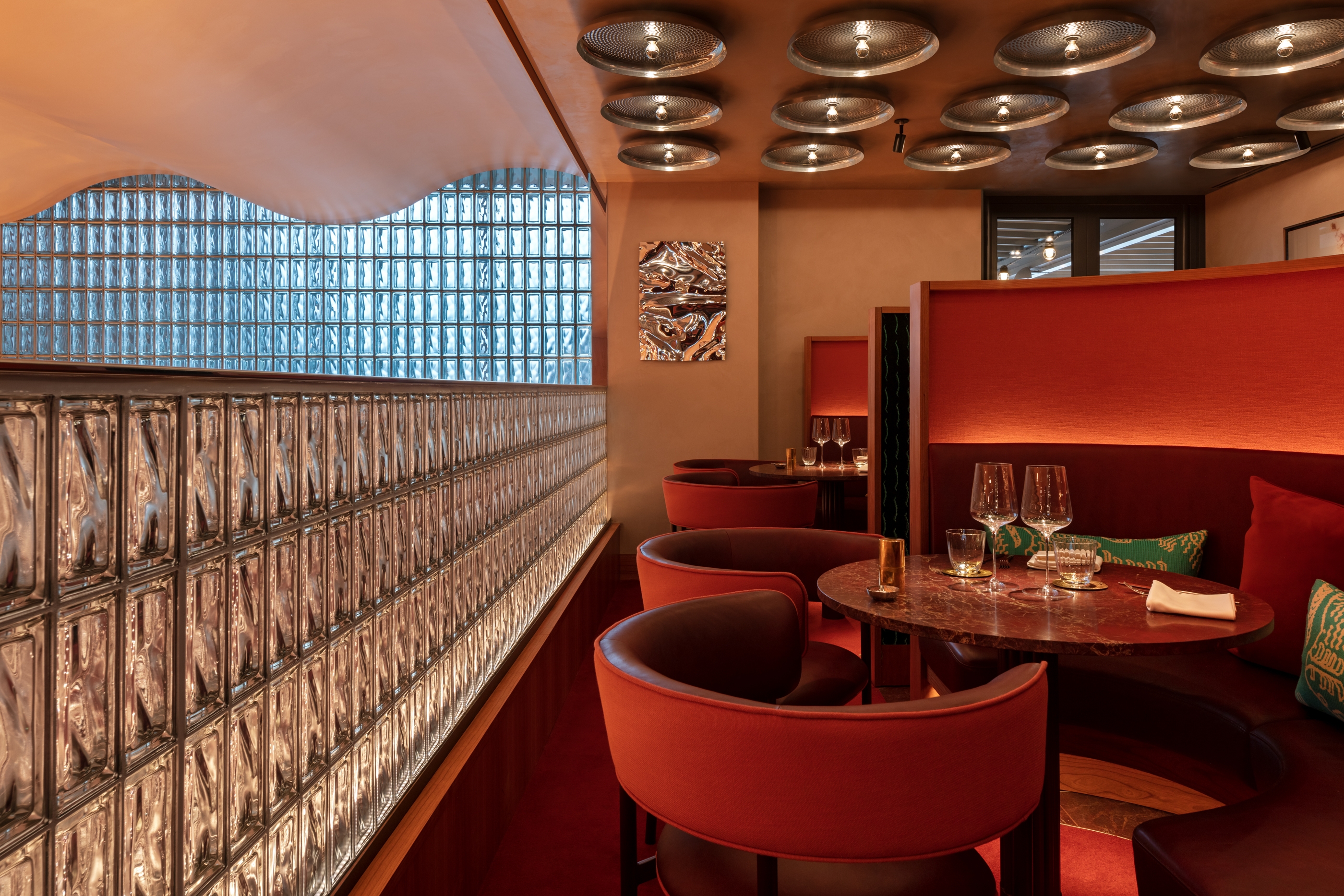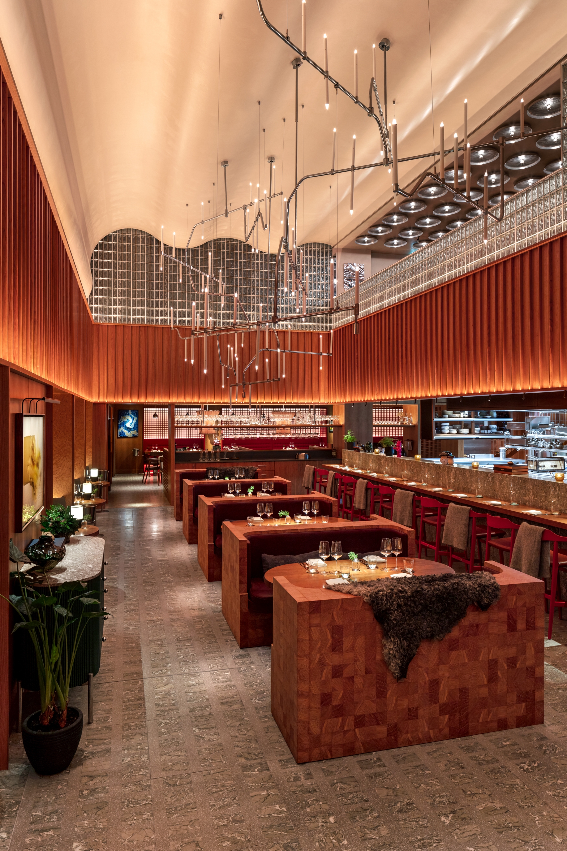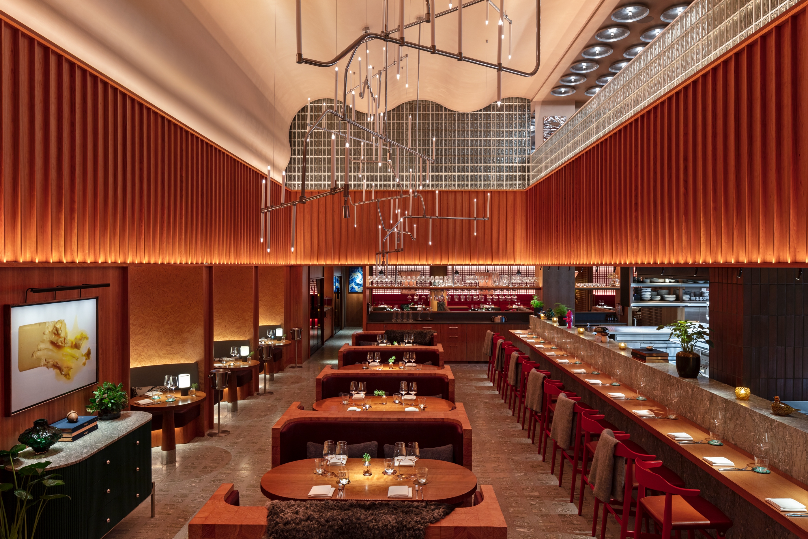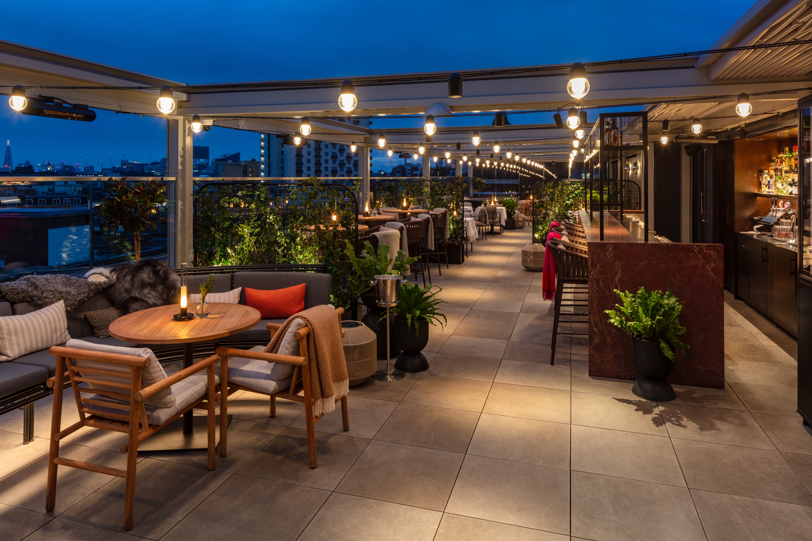 Sustainability ApproachGuest experience and dramatic focus were prerequisite to the design, this ambition went hand in hand with reducing wattage for sustainability, allowing selectivity over what features were lit and to what intensity. This made the scheme not only comfortable but also efficient, precise optics for feature lighting allows lighting to be contained to the tables or features without spill light, reducing wattage required to build theatre in the space. Lighting control allowed us to dramatically lower lighting levels through the day from an appropriately balanced day scene to a low and dramatic ambience in the evening, ensuring features are never over lit, and energy is minimised through considerate control. The bespoke chandelier, bespoke mezzanine sconces and bespoke terrace festoon system were all designed with sustainability, all parts are replaceable on site and manufactured in the UK.