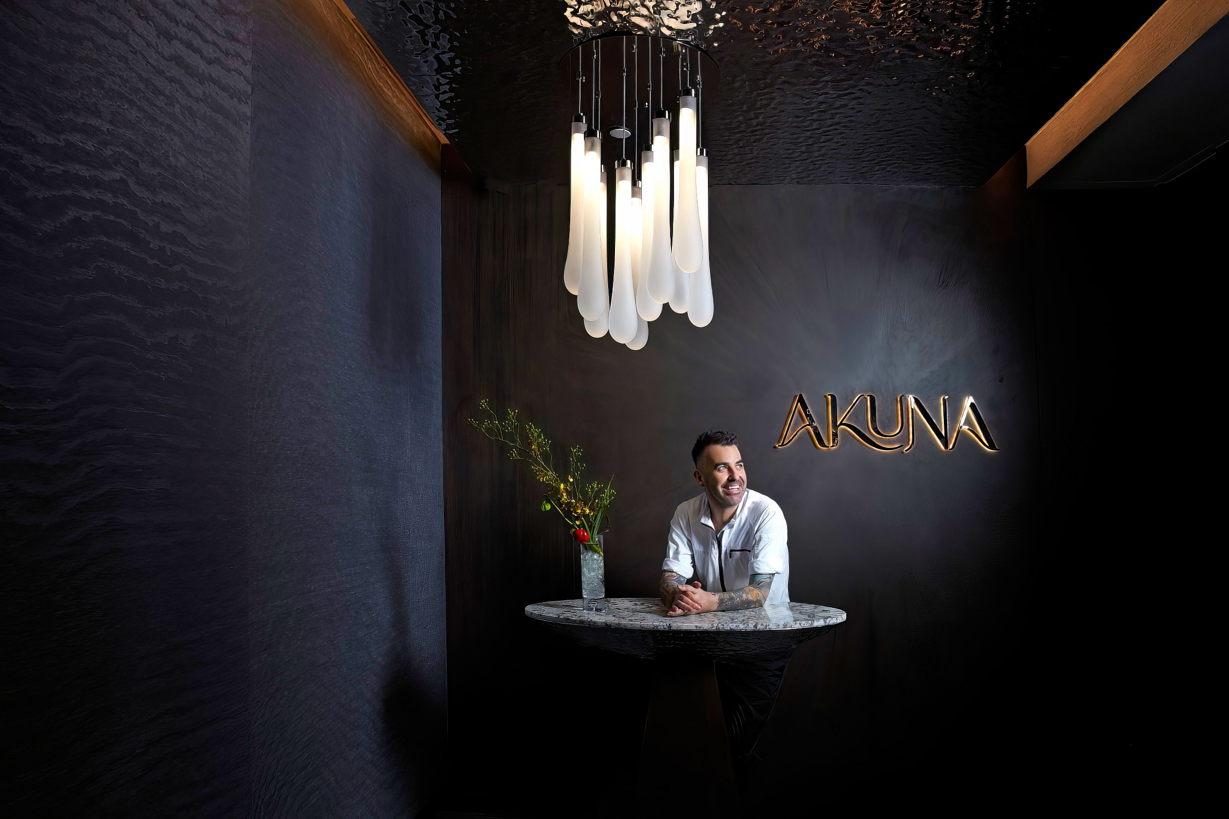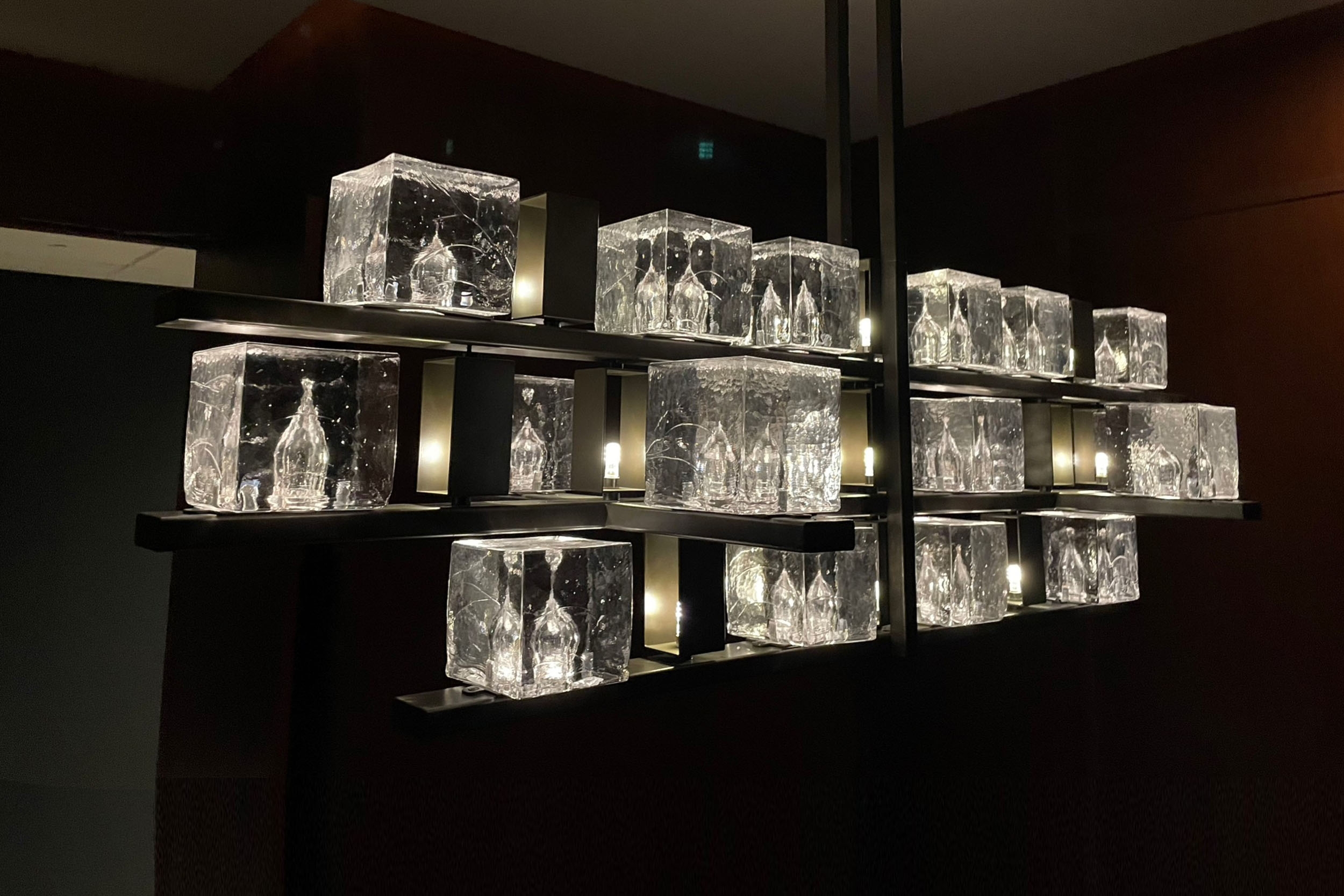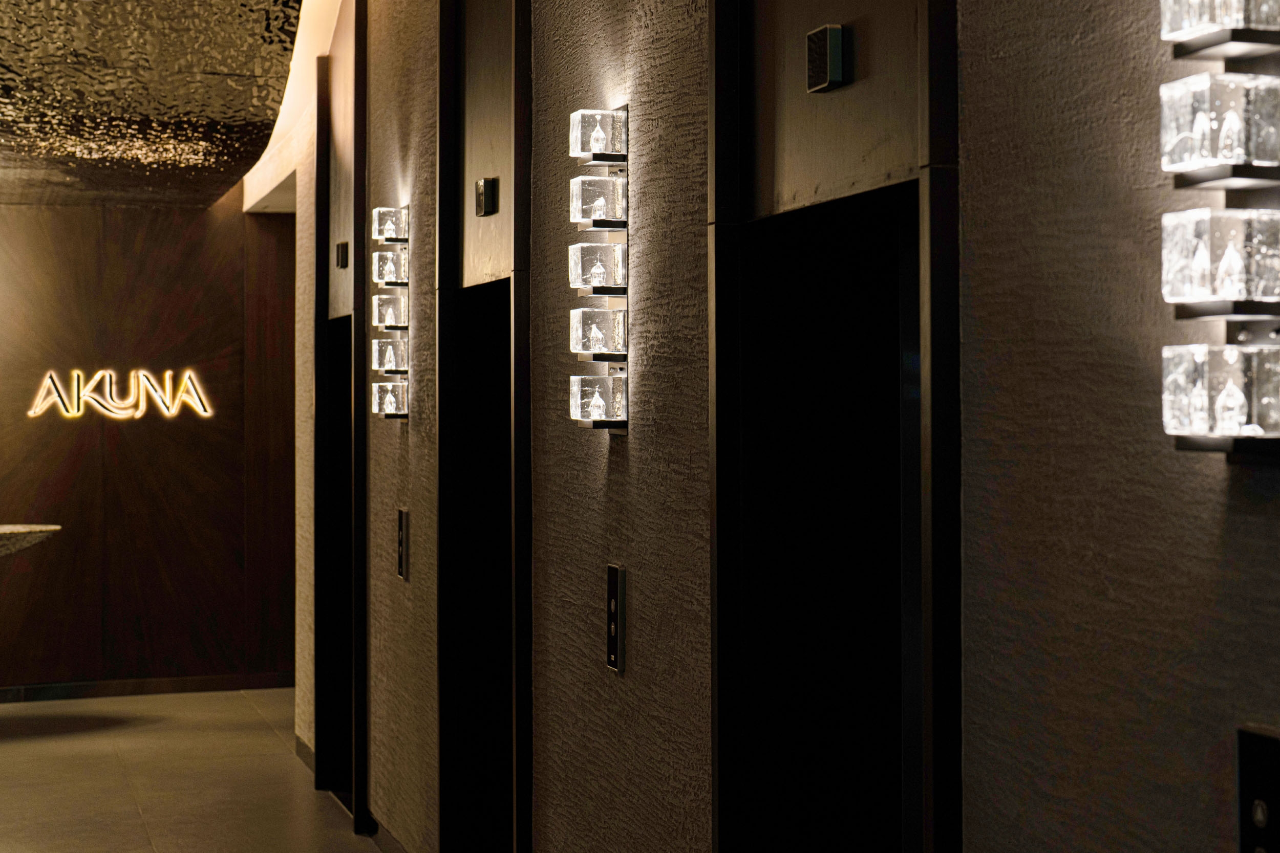 Entry DescriptionThe bar name Akuna takes inspiration from the Australian Aboriginal term that means "flowing water”.Our design concept revolves around the 3 fundamental states of water: solid, liquid, and gas. The journey starts with the sconces "on the rocks" for lift lobby, featuring the solid ice state apparently melting under the light. Moving into the private room, we have incorporated the ice elements into a chandelier form integrating dimmable down lighting to enhance illumination over the dining table. Following the concept, 10 illuminated oversized drops at the counter represents the liquid state.