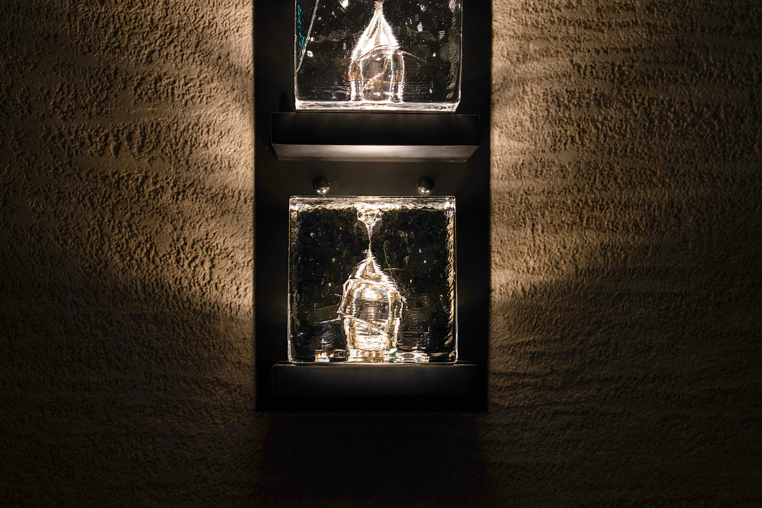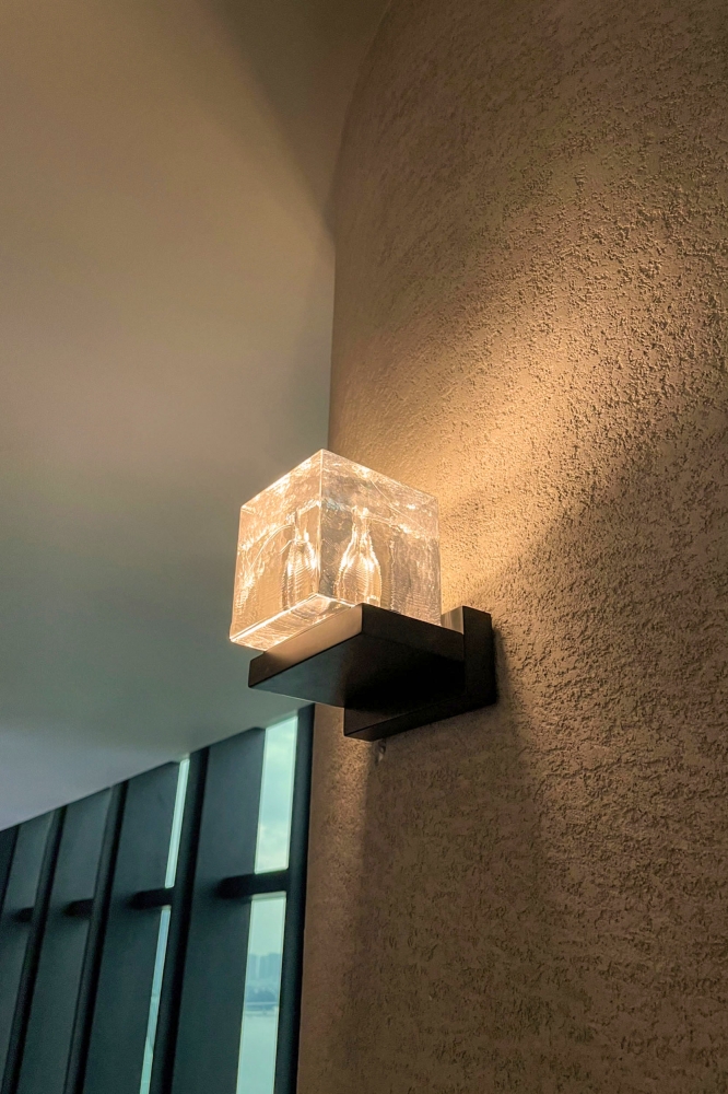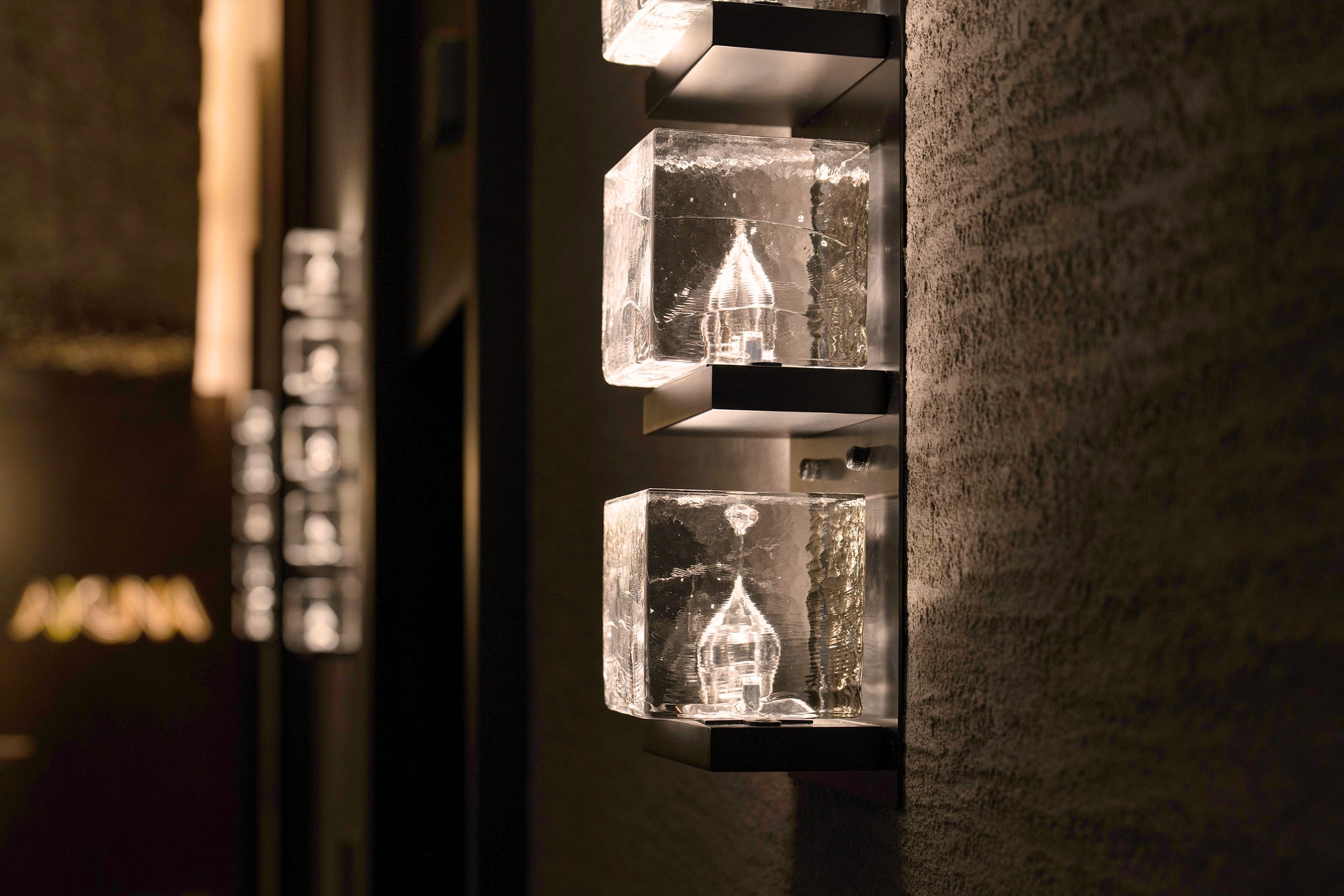 Entry DescriptionThe bar name Akuna takes inspiration from the Australian Aboriginal term that means "flowing water”.Our design concept revolves around the 3 fundamental states of water: solid, liquid, and gas. The journey starts with the sconces "on the rocks" for lift lobby, featuring the solid ice state apparently melting under the light. Moving into the private room, we have incorporated the ice elements into a chandelier form integrating dimmable down lighting to enhance illumination over the dining table. Following the concept, 10 illuminated oversized drops at the counter represents the liquid state.