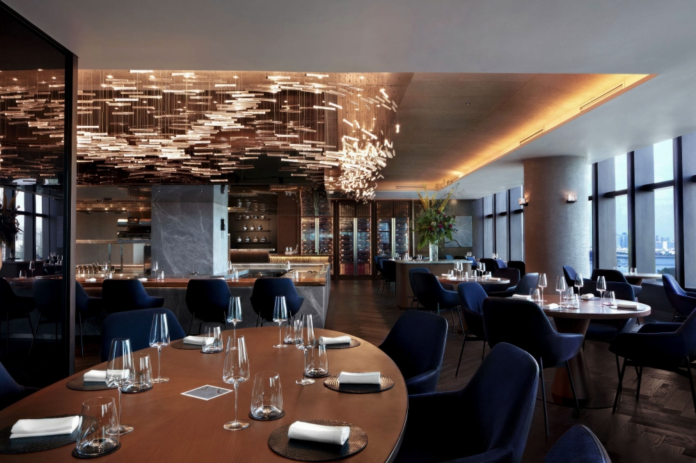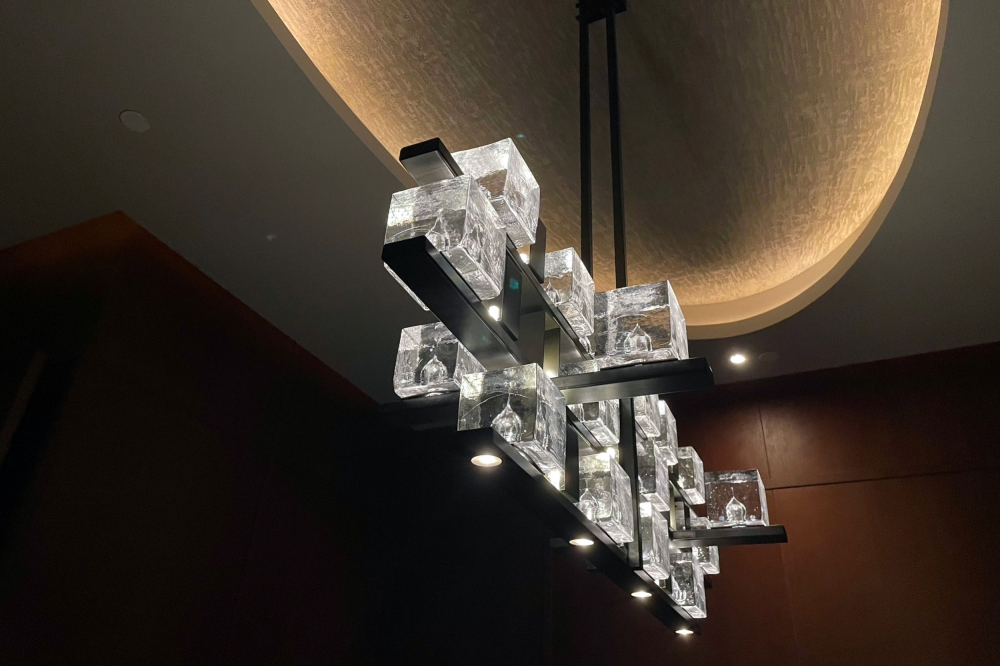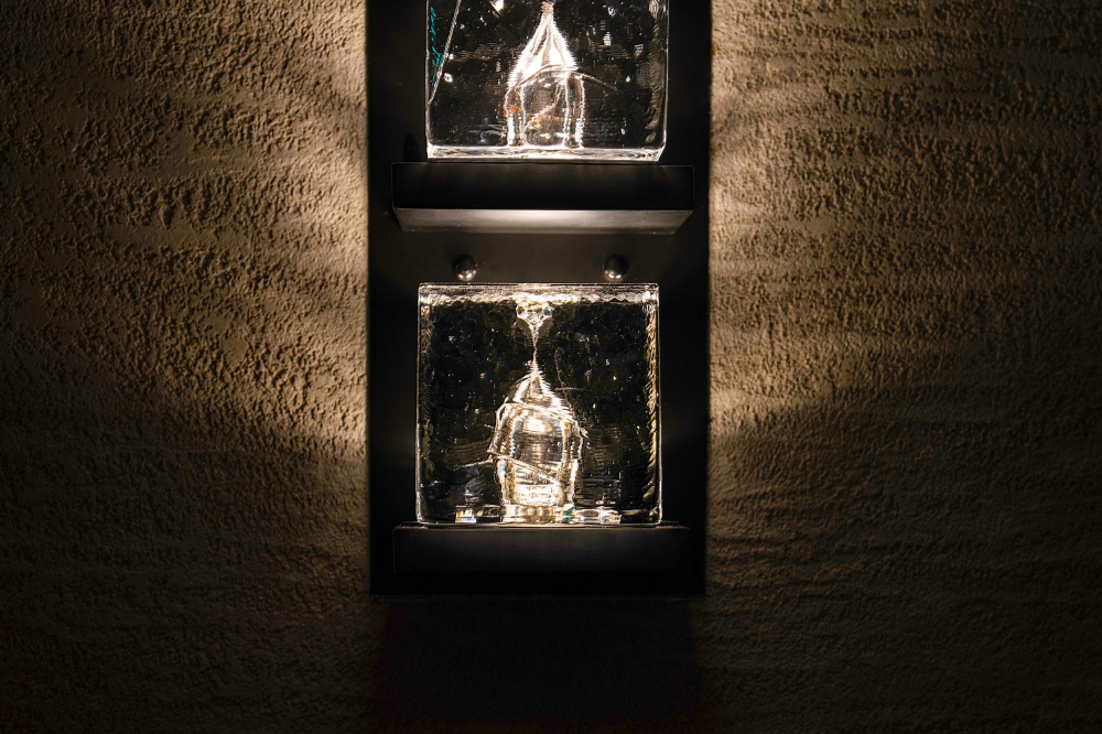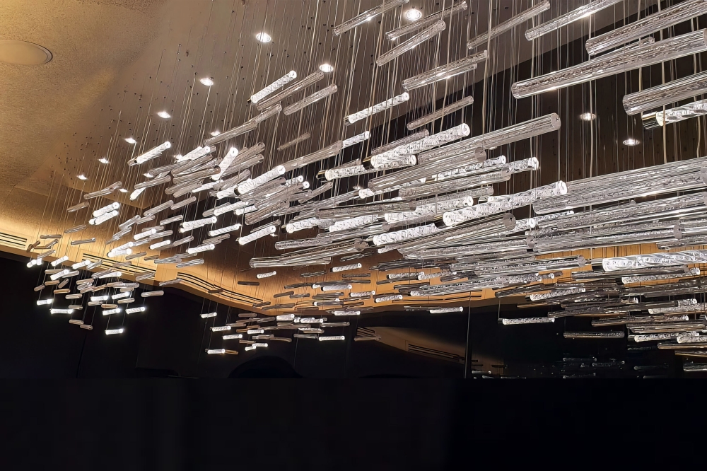 The Akuna bar then is wrapped by the sculptural chandelier entitled "Waves" and symbolize the water splash to represent the gaseous state.The chandelier hug the Chef table and is the prominent feature of the dining room .Consisting of 300 pieces of our signature twisted Murano glass tubes with silver oxidized soul illuminated from within with customized LED fittings and 800 pieces of straight glass tubes which refract lights from the spotlights positioned above to create ambient light for the dining room.The silver oxidized particles or "soul" as we call it represent the reflection of the moon and stars seen from the crashing waves. The glasses are suspended from a large U-shaped canopy housing 75 narrow beam spotlights and meticulously arranged to bring mind the crescendo of the wave.