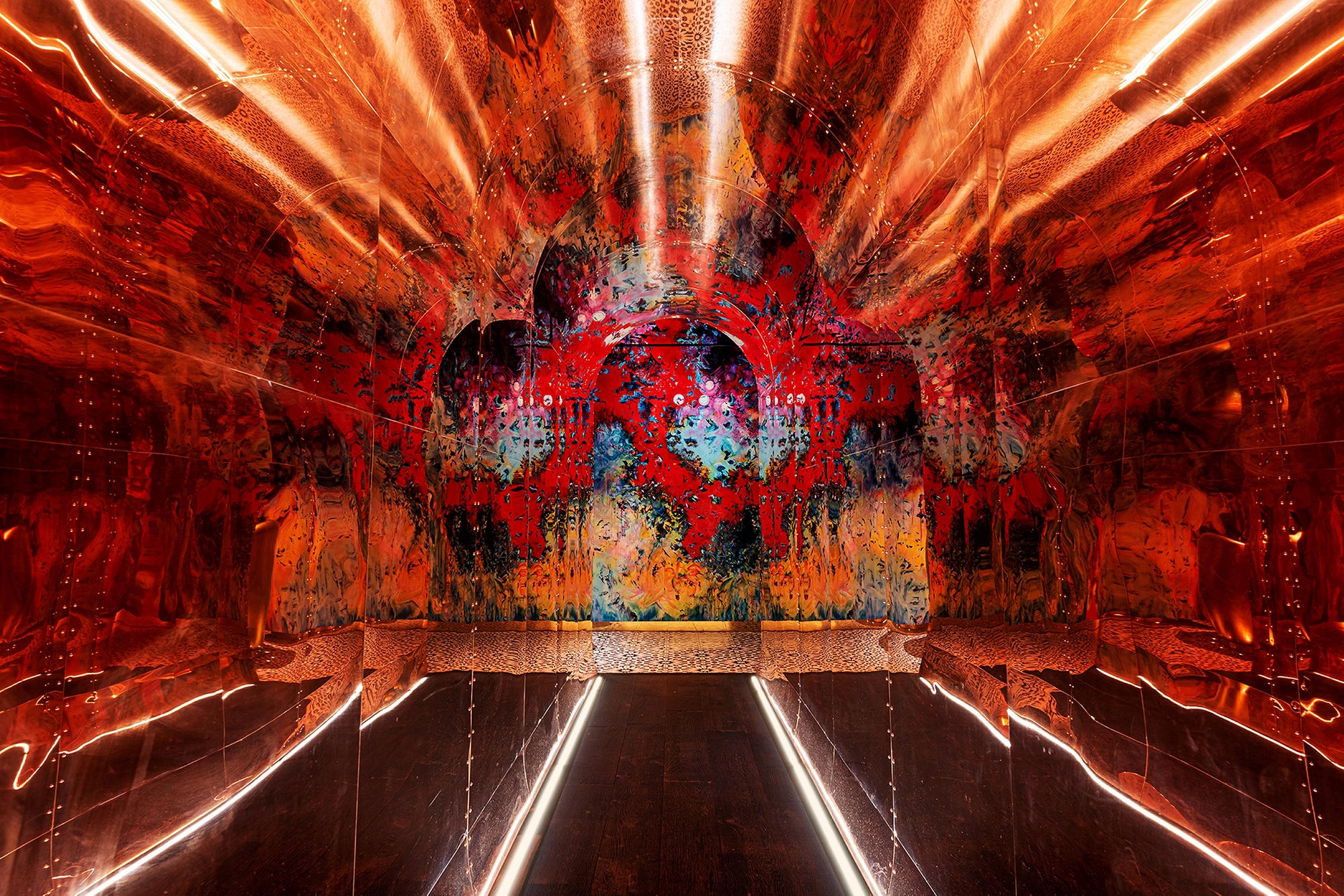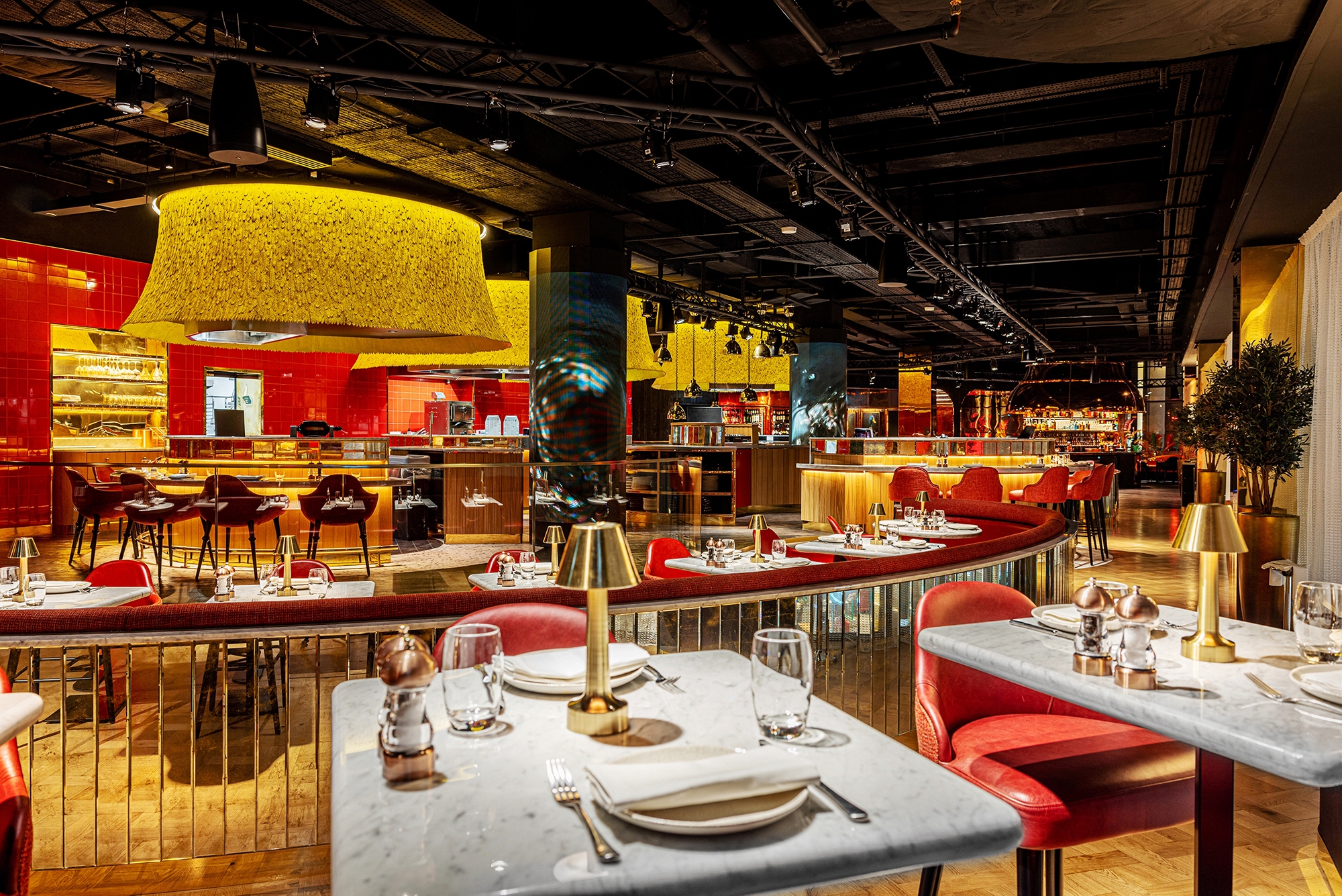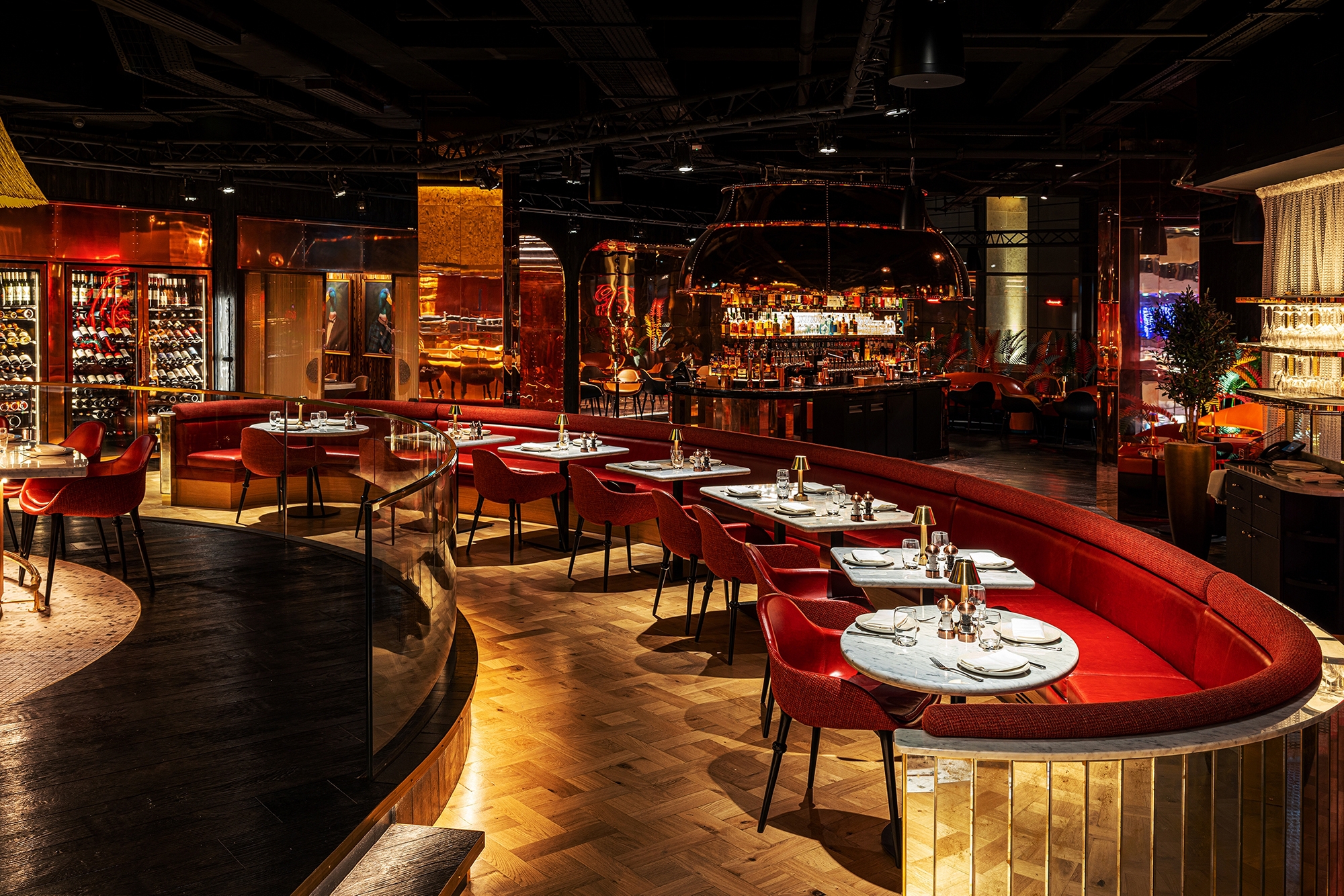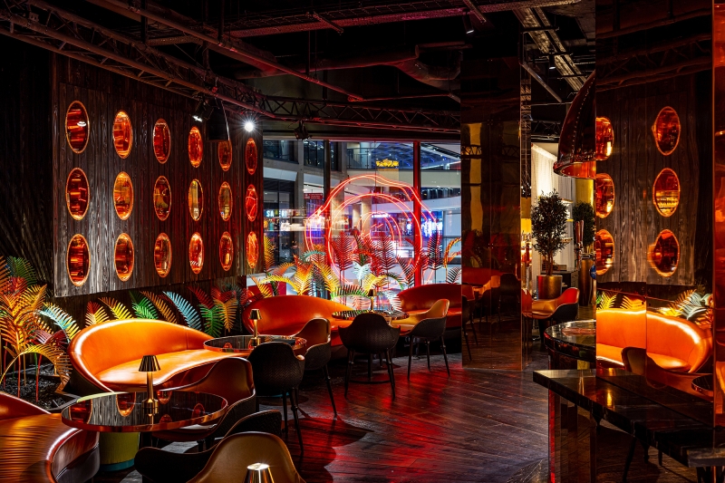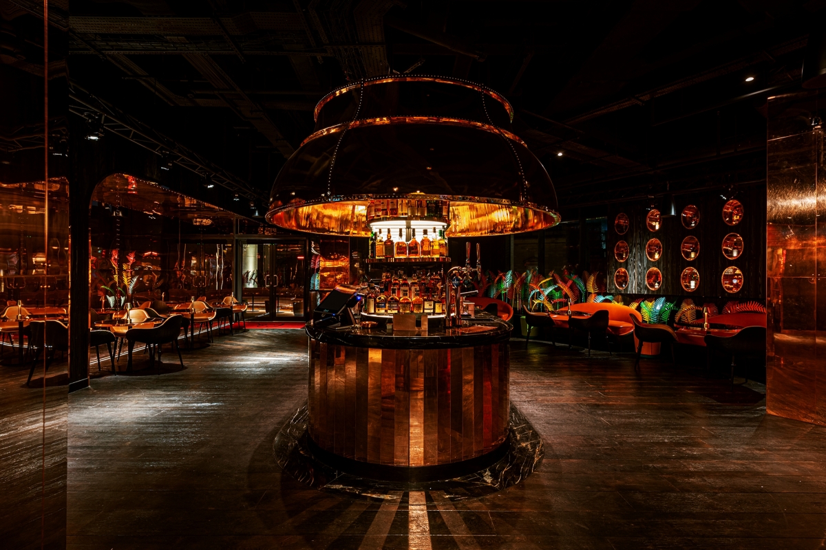 Integrated linear LED is tucked within concealed detailing throughout and is particularly effective around the live kitchen / dining stations, which are all presented on an elevated stage platform, floated with light. Flat panel LED lighting is integrated into the bar and service station shelving to create sparkle through the bottles and glassware. At the open bar, this is all reflected inside a giant, polished whiskey still canopy above.