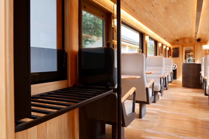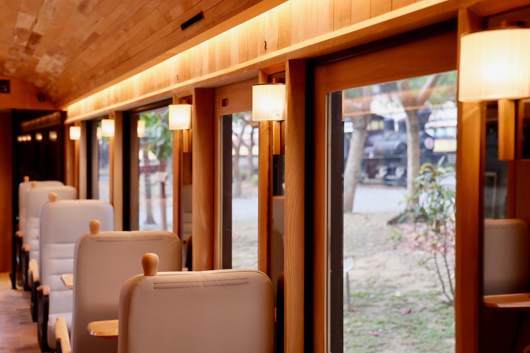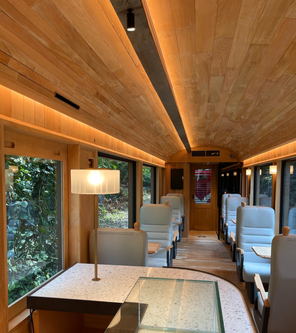 The interior lighting of the carriages mostly utilizes indirect LED linear lighting seamlessly integrated within interior details which brings out the beautiful warm tone of the cypress wood and creates a cozy environment. It minimizes the direct impact on the passengers' vision and creates a relaxing atmosphere and comfortable sensory travel experience.
