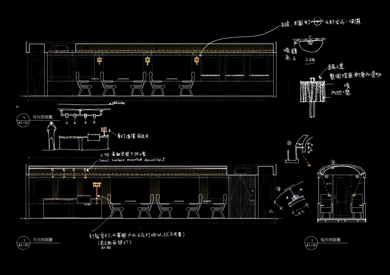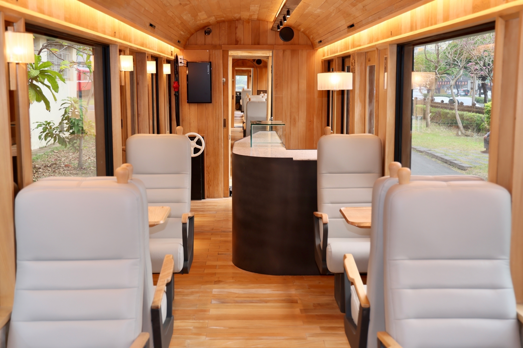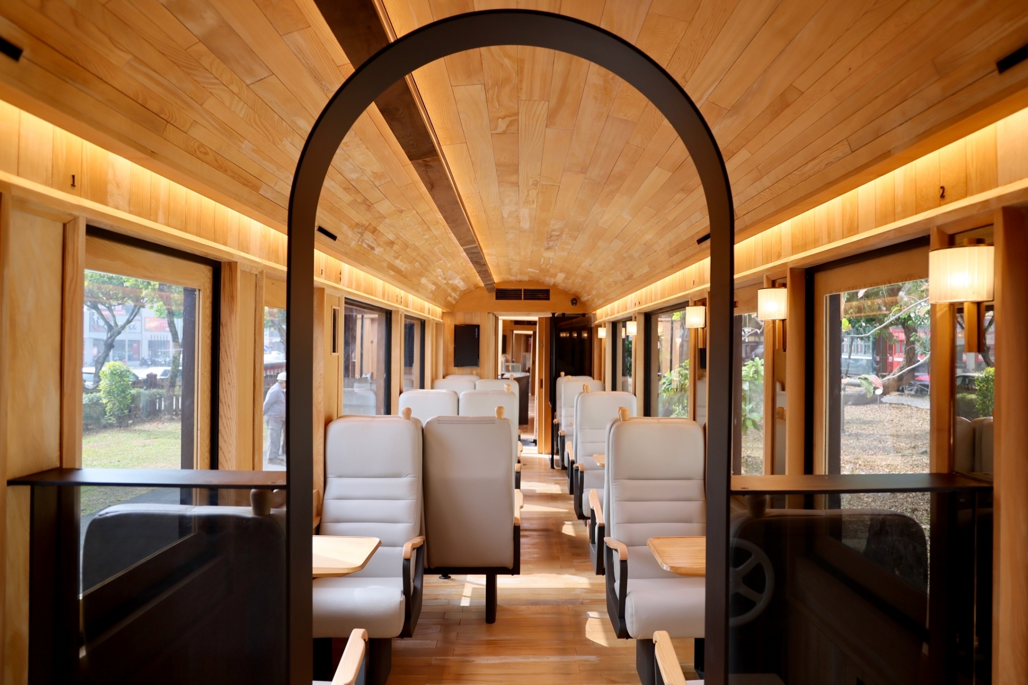 The interior lighting of the carriages mostly utilizes indirect LED linear lighting seamlessly integrated within interior details which brings out the beautiful warm tone of the cypress wood and creates a cozy environment. It minimizes the direct impact on the passengers' vision and creates a relaxing atmosphere and comfortable sensory travel experience.