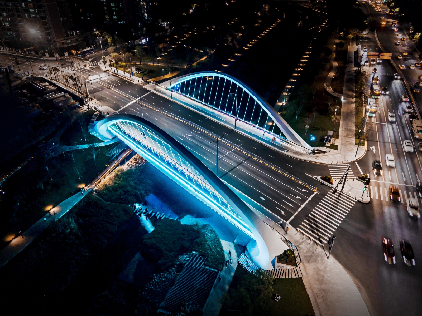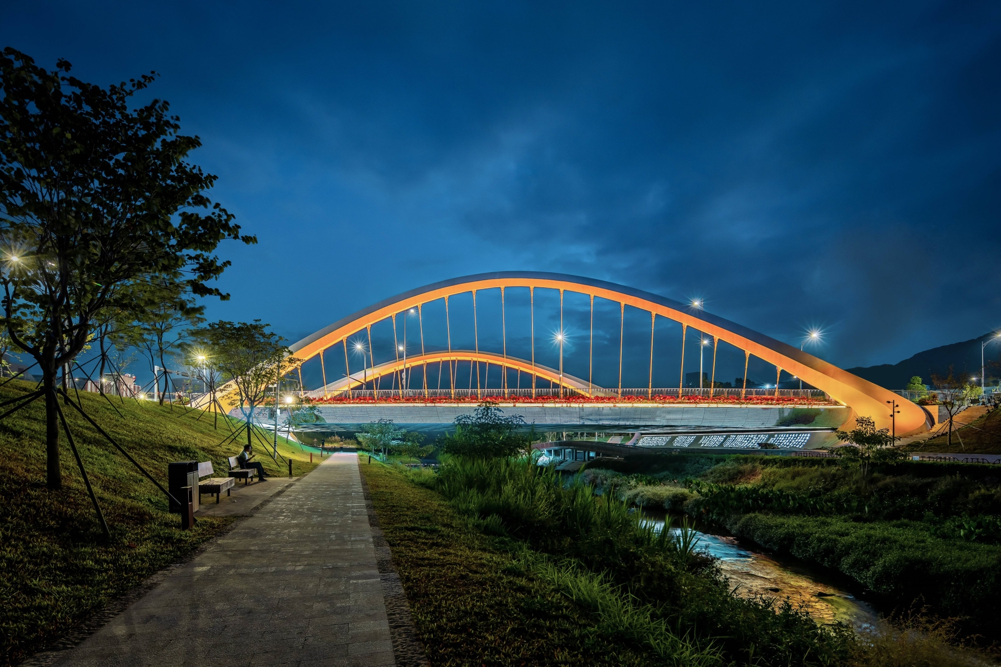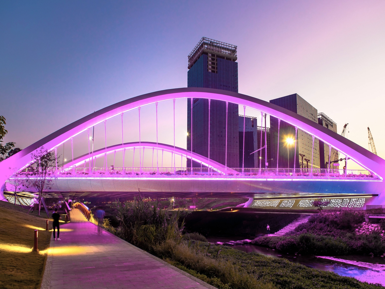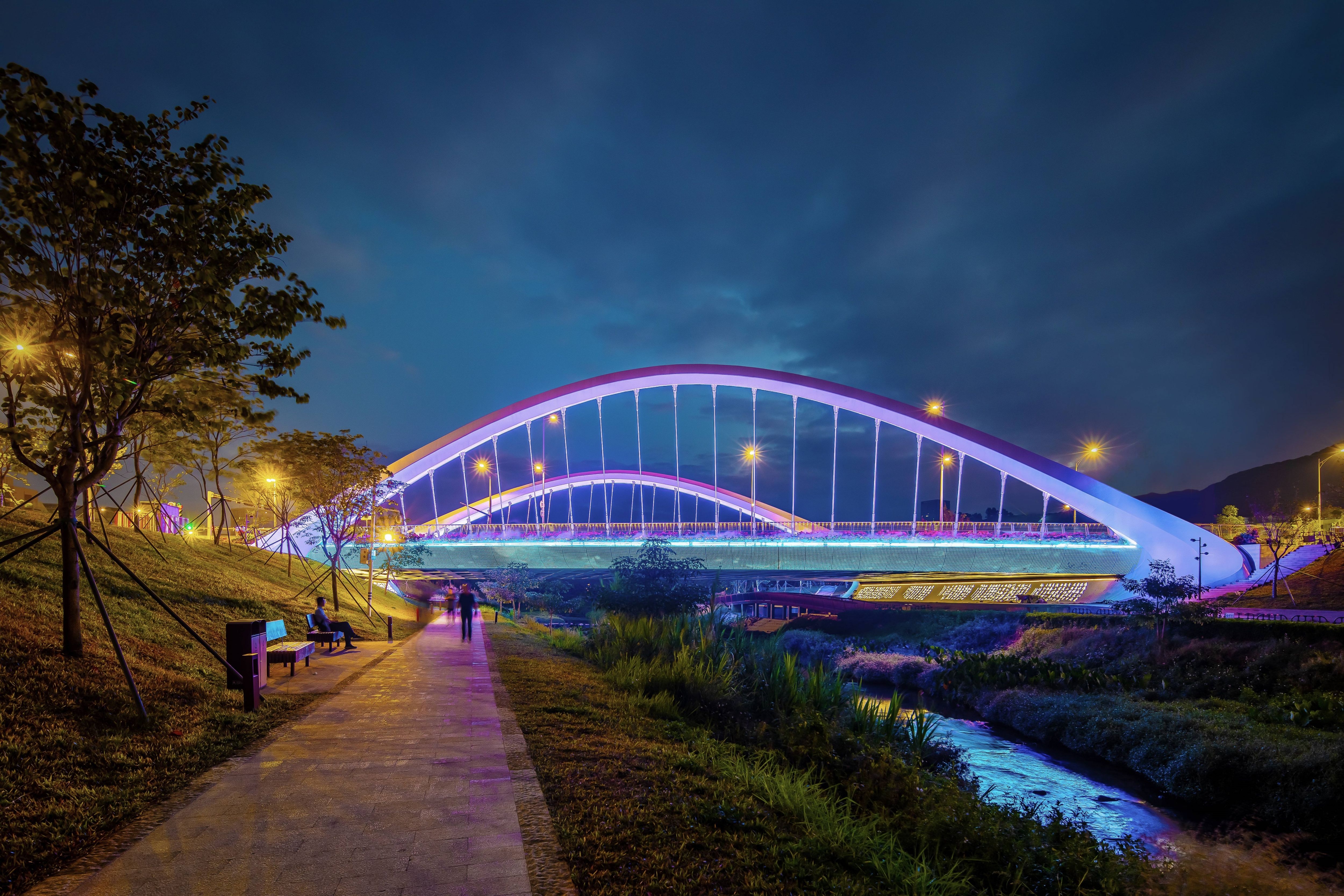 The dynamic point lights on both sides of the bridge produce a dreamlike feeling of watching a video, adding to the magnificence of the Dasha River Ecological Corridor and extending the splendor of the nightscape in Shenzhen Talent Park. The intensity of the light blends well with the environment, echoing the idea of harmonious coexistence between humanity and nature and creating a unique, beautiful, and alluring scene.