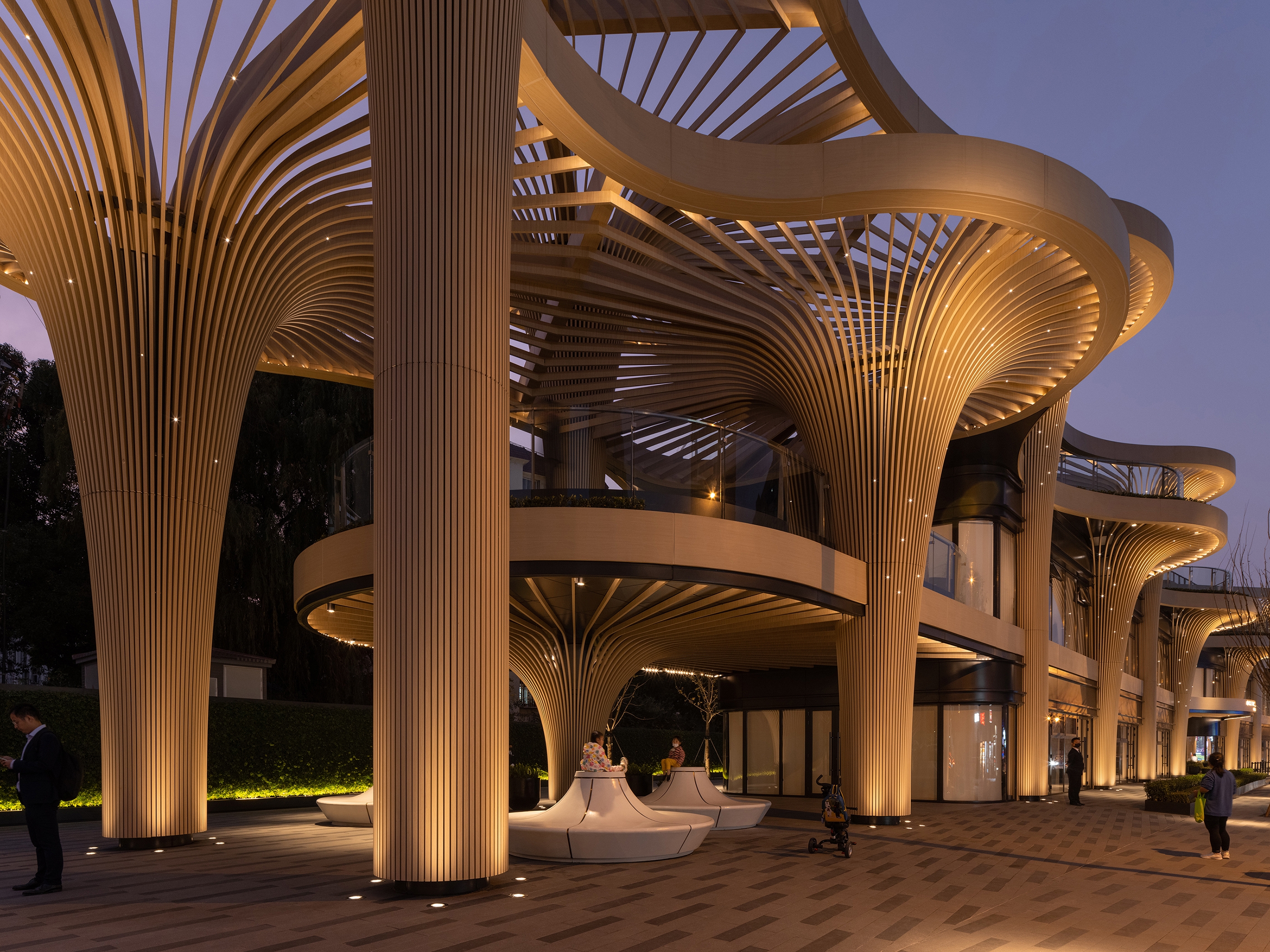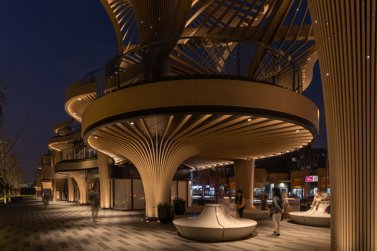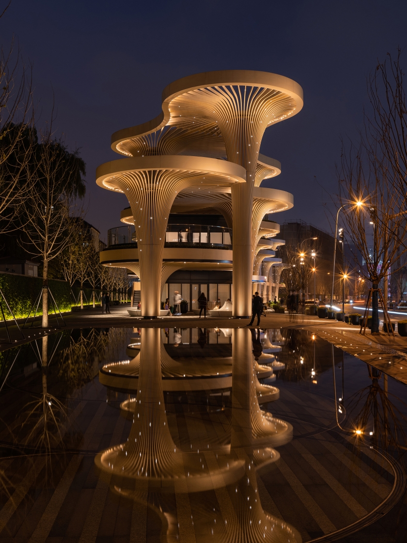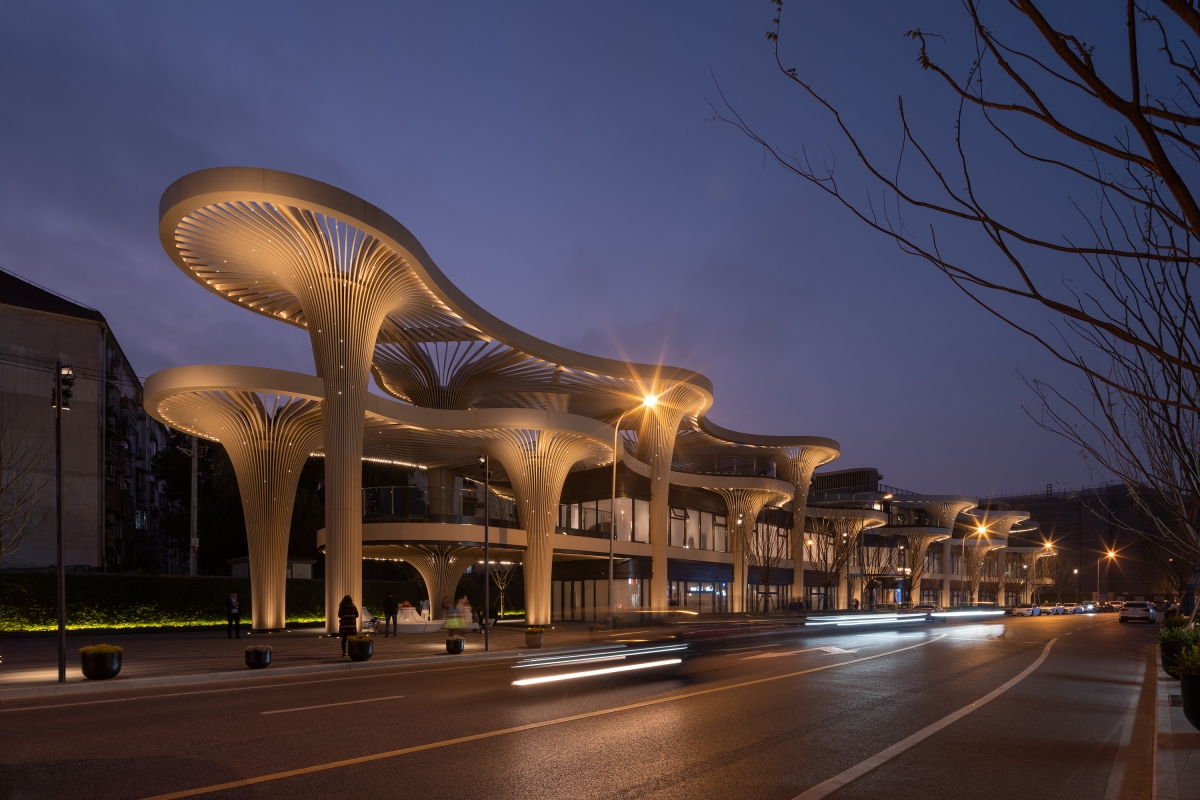 The architecture was inspired by the forests of Shanghai, creating a sheltered canopy of trees with modular market stalls below. The designers used a variety of different lighting systems to express the rich layers of the top, outline, roots and details of the building. However, the only outward light comes from starlight spots on the surface of the grille, which do slow and gentle breathing under the control of a dimming system. The mushroom umbrella is setted up down lights to soften the boundary between the building and the street. After the market is opened to the public, it is like a small living room under the elevated level, where people gather to rest and wait. The landscape lighting is controlled to match the architecture, The reflection effect of the water feature is used to enrich the image of the night.