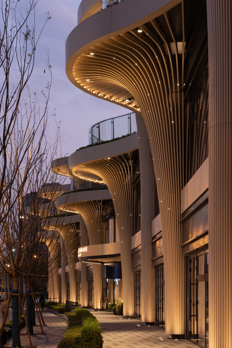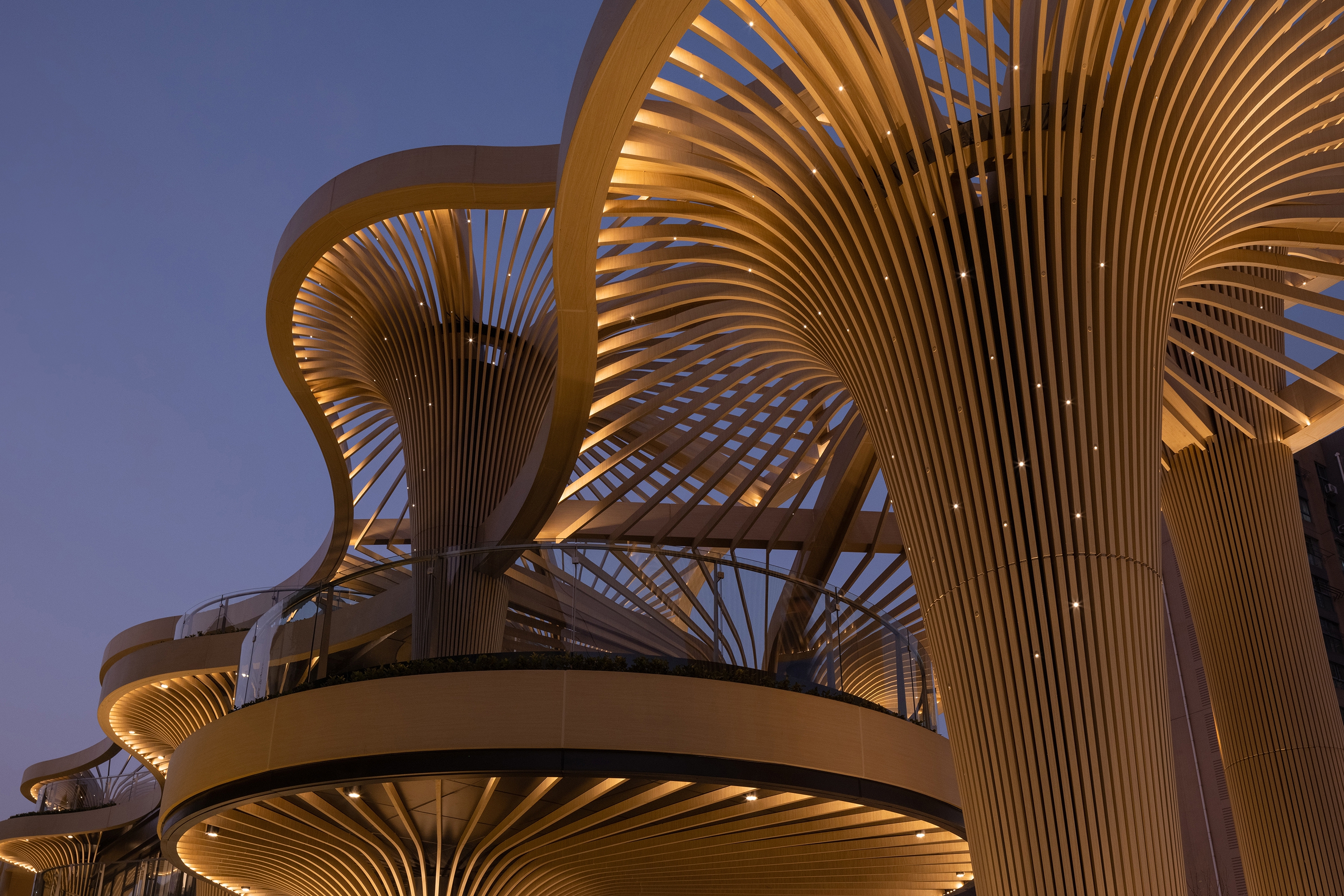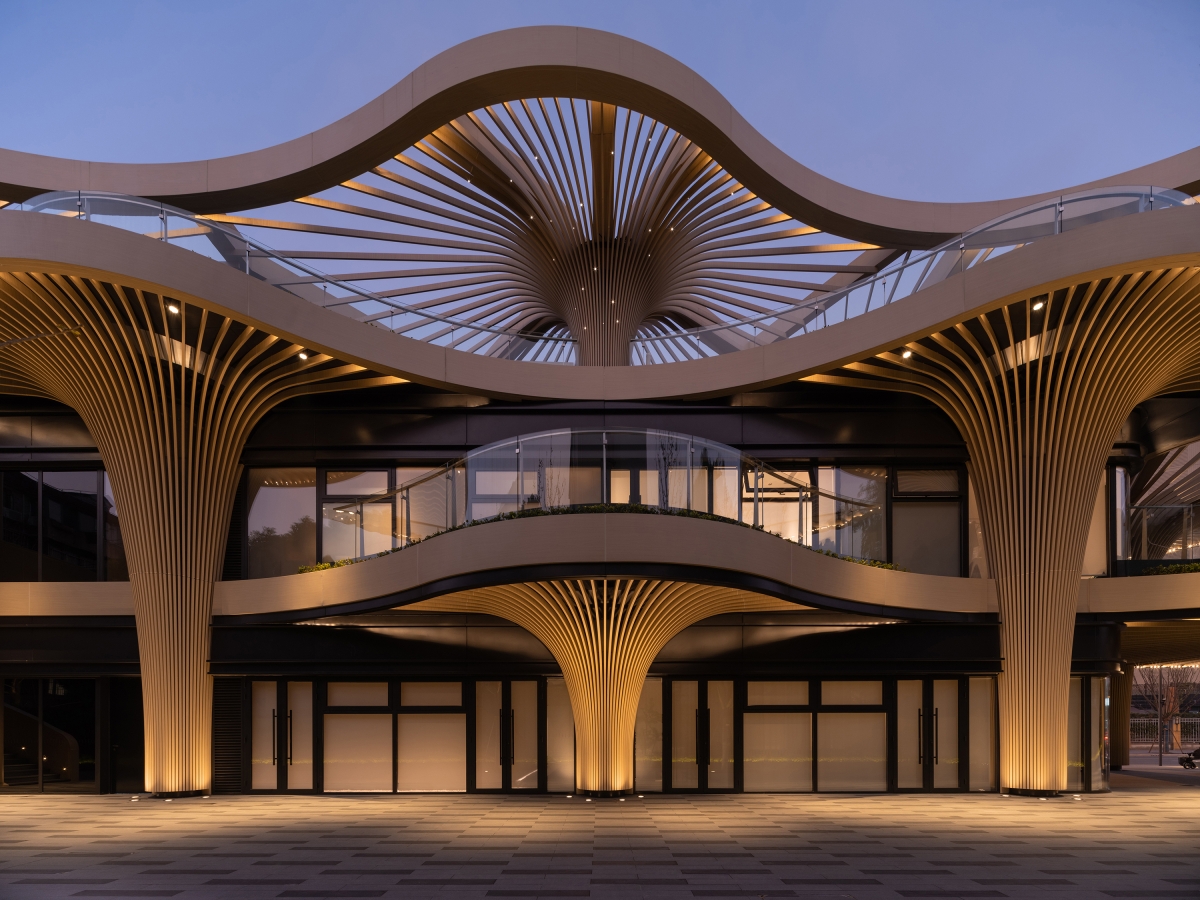 The architecture was inspired by the forests of Shanghai, creating a sheltered canopy of trees with modular market stalls below. The designers used a variety of different lighting systems to express the rich layers of the top, outline, roots and details of the building. However, the only outward light comes from starlight spots on the surface of the grille, which do slow and gentle breathing under the control of a dimming system. The mushroom umbrella is setted up down lights to soften the boundary between the building and the street. After the market is opened to the public, it is like a small living room under the elevated level, where people gather to rest and wait. The landscape lighting is controlled to match the architecture, The reflection effect of the water feature is used to enrich the image of the night.