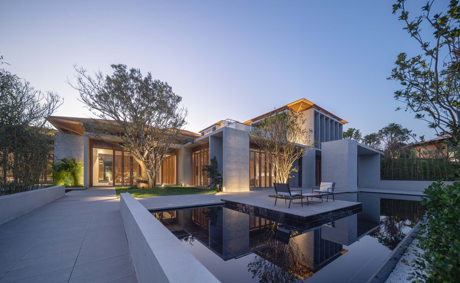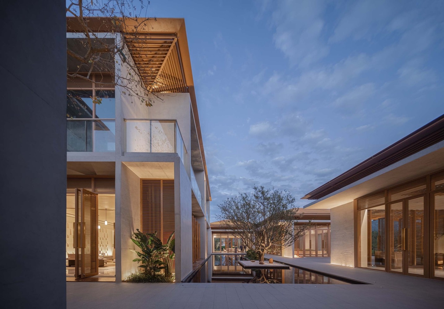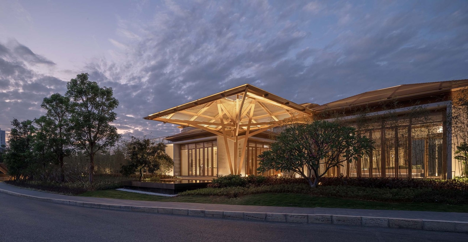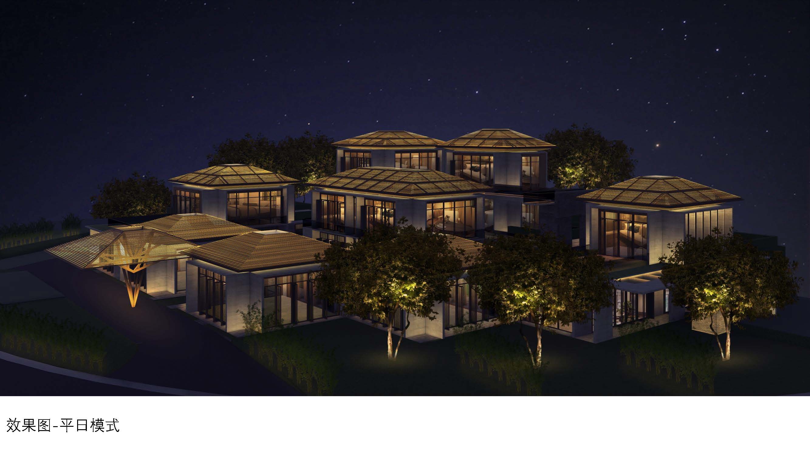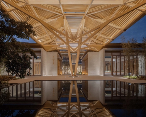 The lighting design follows the concept of "Confucian Zen living and bamboo weaving construction," aiming for a restrained and delicate effect. By choosing to install lighting fixtures inside the architectural lattice, soft and multi-level light and shadow penetrate through the lattice, creating a visual image reminiscent of bamboo lanterns. This design shapes the lighting experience with a guiding, welcoming, and cozy atmosphere. The final lighting effect not only attracts attention but also seamlessly blends into the surrounding mountains, creating a serene and dim natural environment.