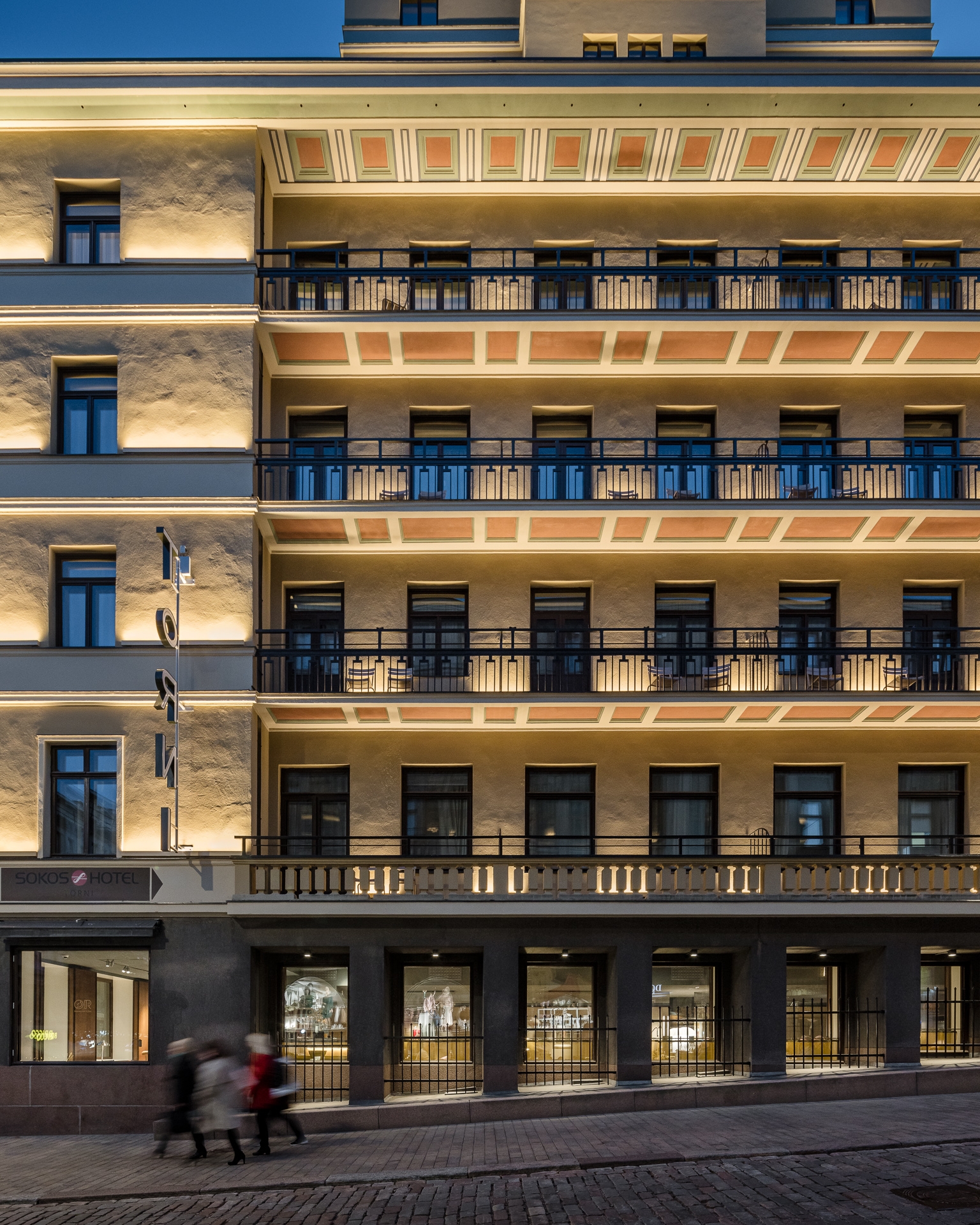 The building's central location and architectural and cultural historical significance required special attention. The result is a visible entity in the streetscape of the dark times of Helsinki's core, and it not only brings out the marvelous building but also lights up the surrounding street spaces for hotel guests and people passing by.