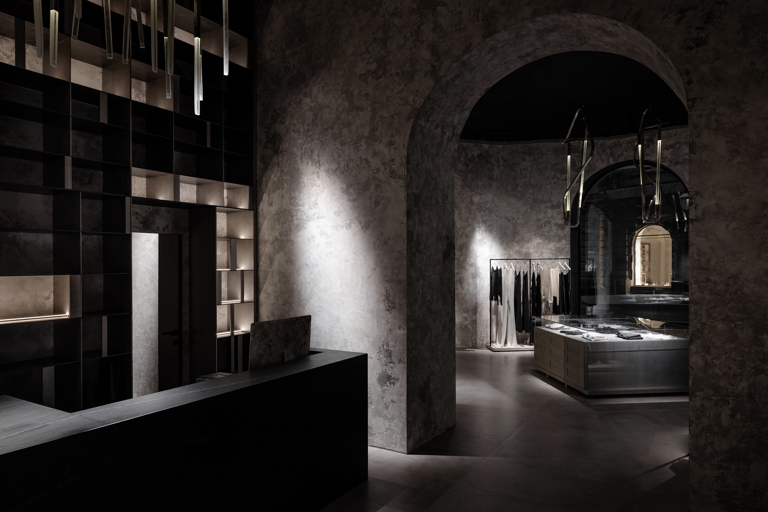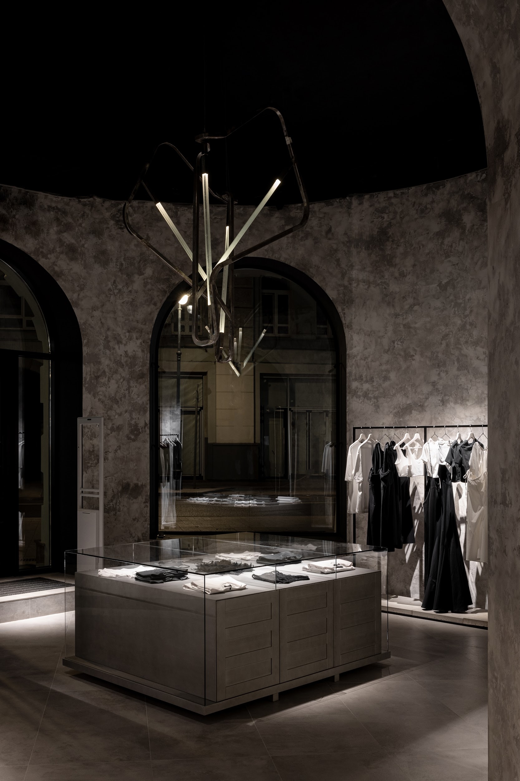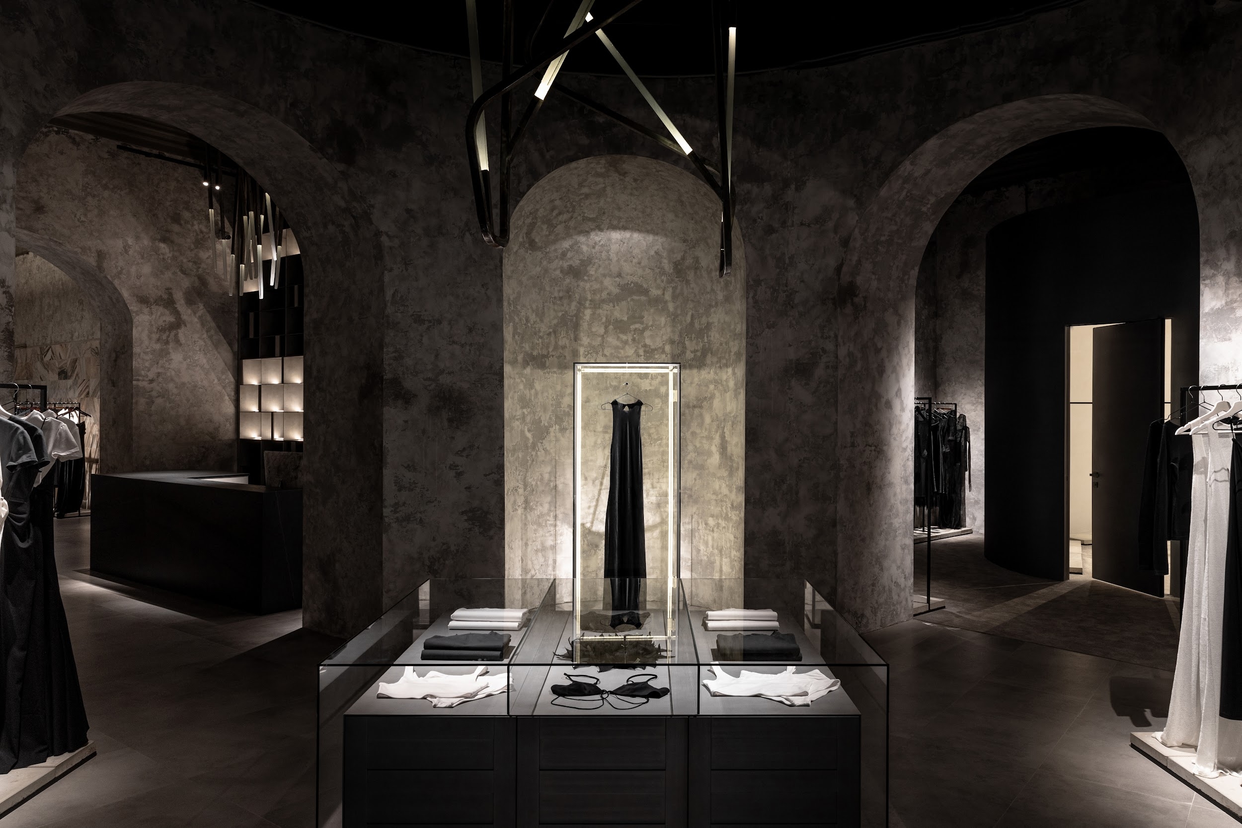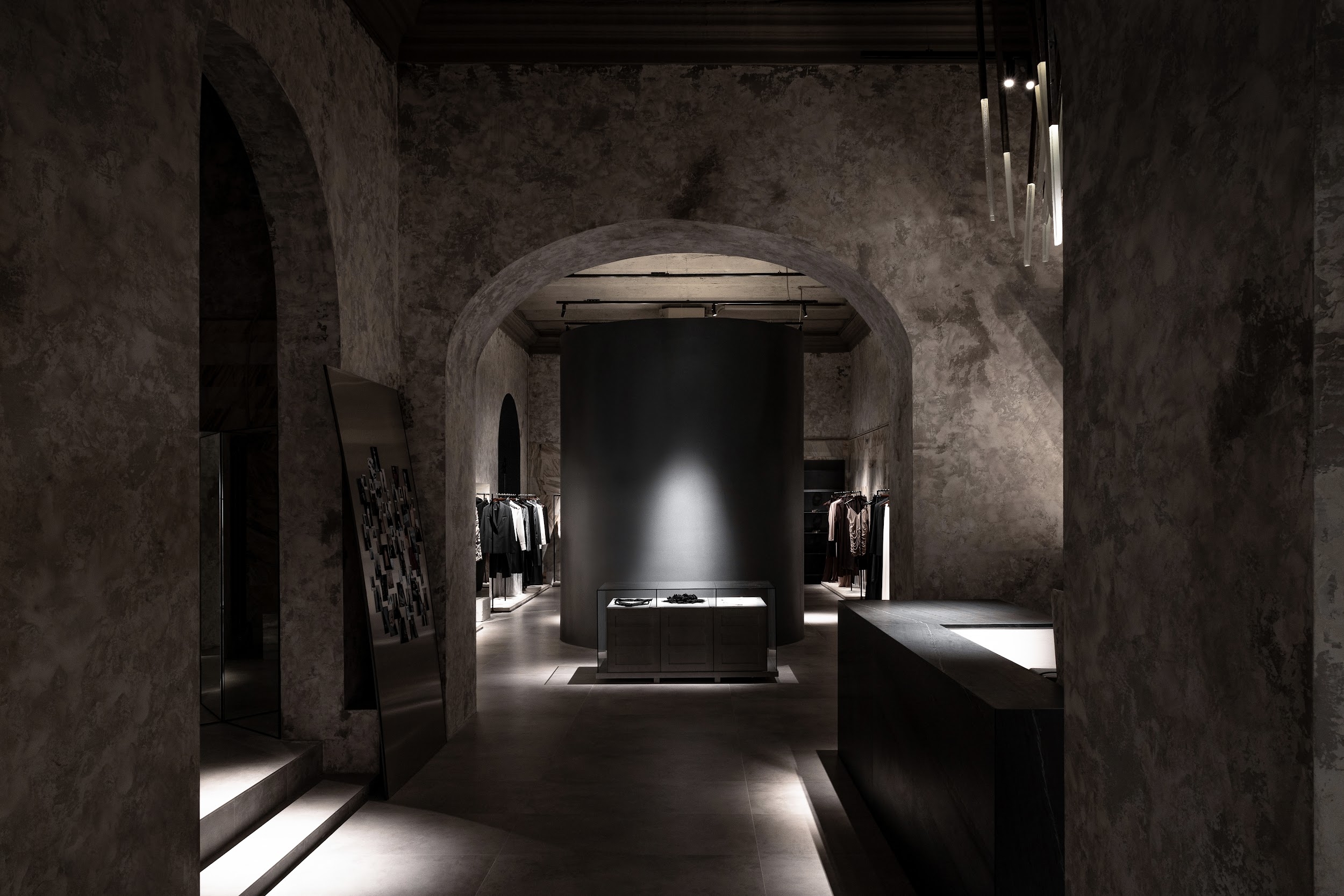 The lighting has to create the most aesthetic and atmospheric space. It was important not only to highlight elegant clothes but also to emphasize the unique architecture. Nuanced lighting and low brightness allow you to see things well, and at the same time provide relaxation and comfort. Rays sliding along the walls touch clothing or appear behind it in order to show the viewer where to go or look. Against this backdrop, the shadows in the arches reveal an architectural change of form. All architectural volumes are read in contrast between the halls.