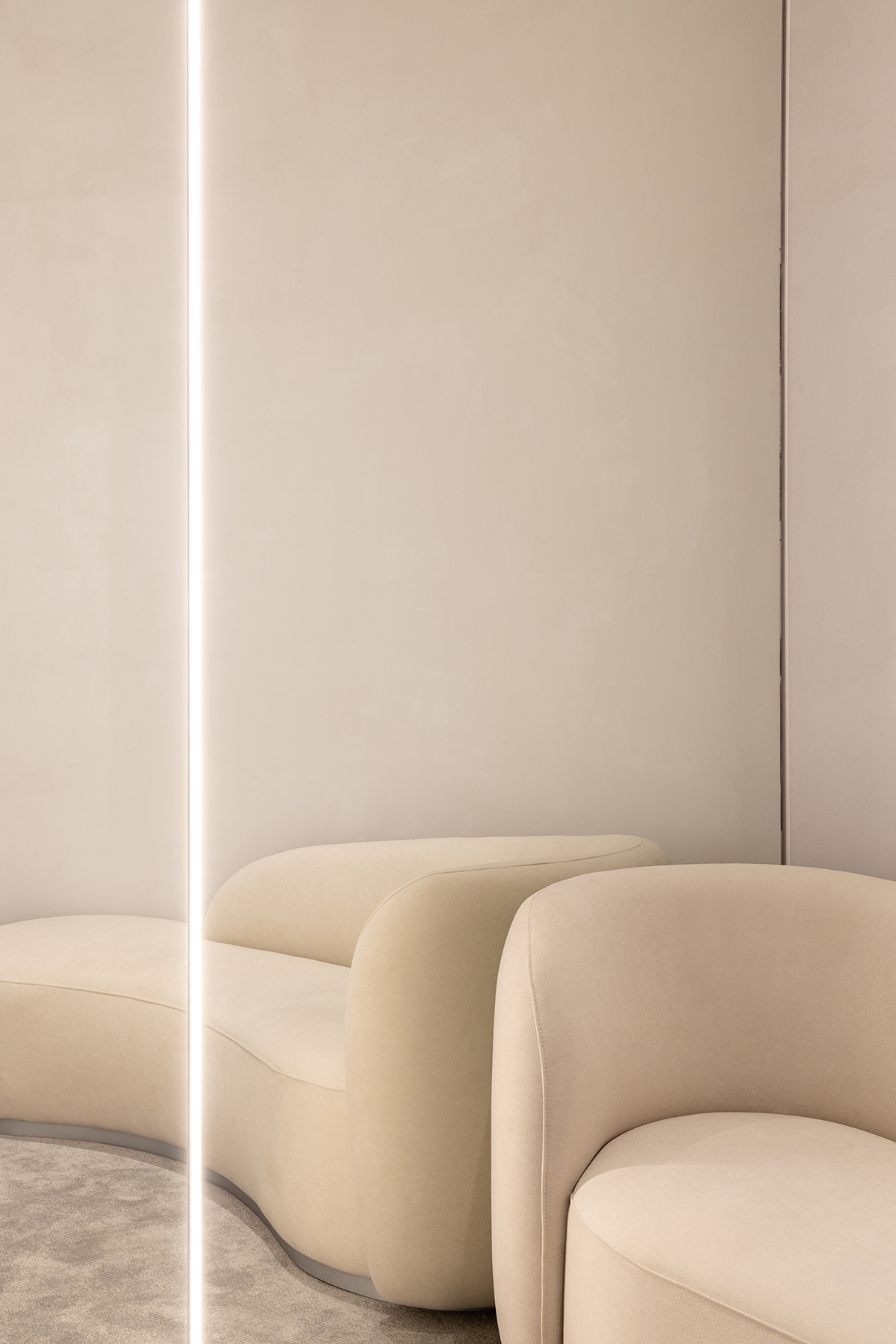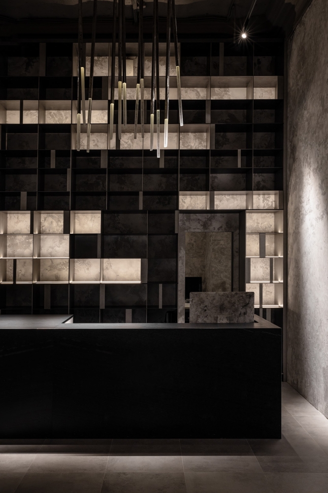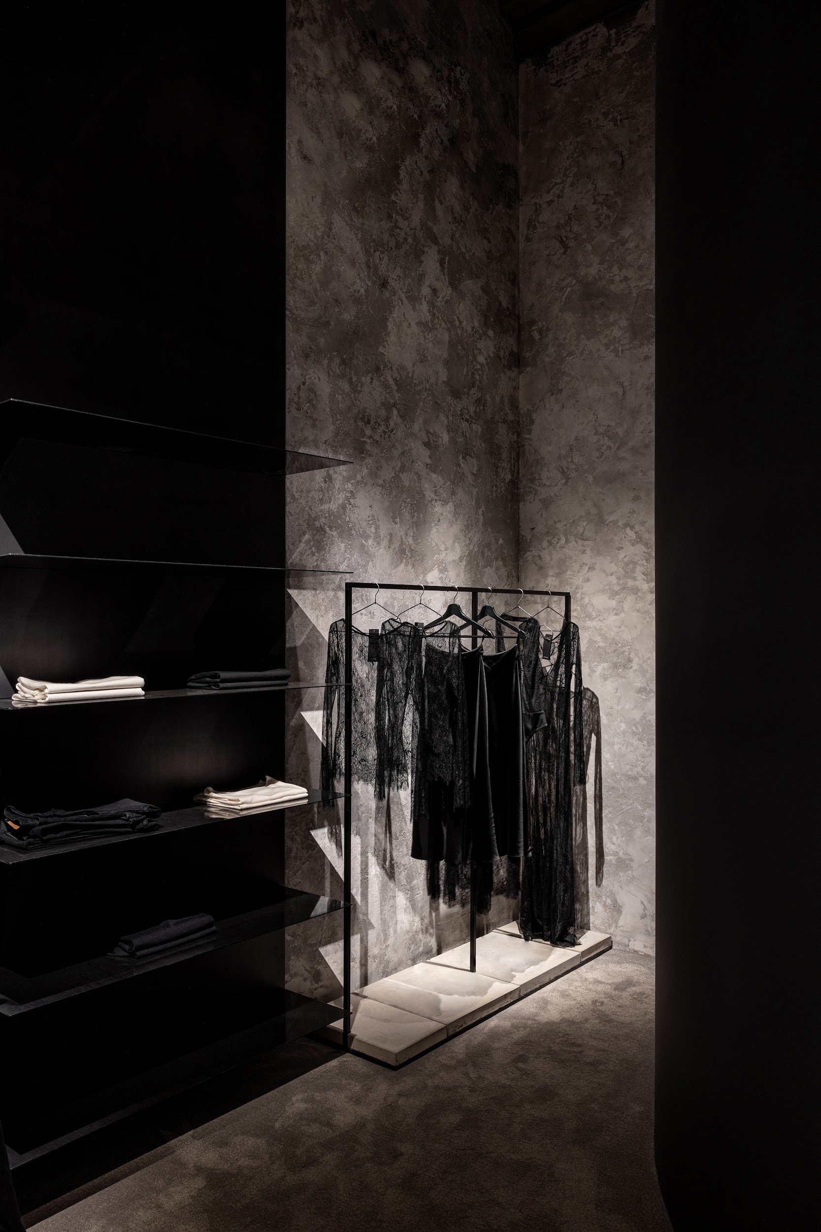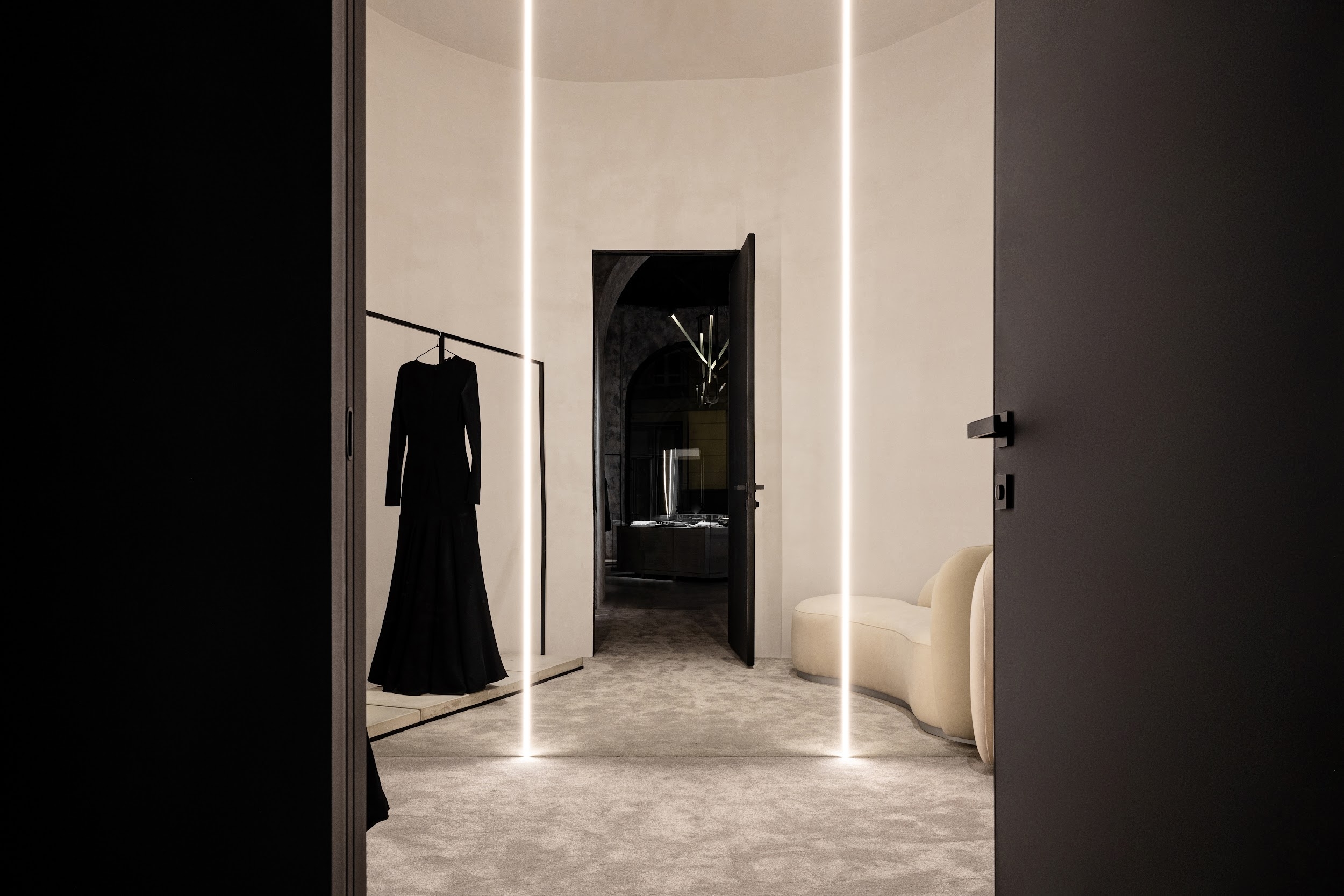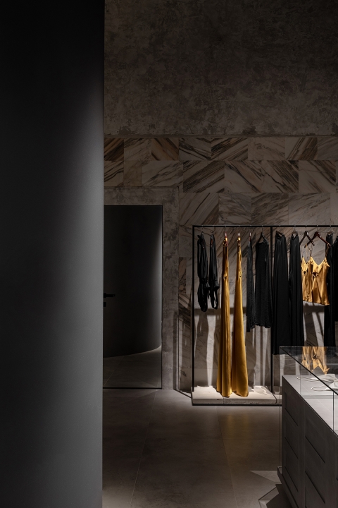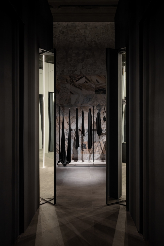 The lighting has to create the most aesthetic and atmospheric space. It was important not only to highlight elegant clothes but also to emphasize the unique architecture. Nuanced lighting and low brightness allow you to see things well, and at the same time provide relaxation and comfort. Rays sliding along the walls touch clothing or appear behind it in order to show the viewer where to go or look. Against this backdrop, the shadows in the arches reveal an architectural change of form. All architectural volumes are read in contrast between the halls.