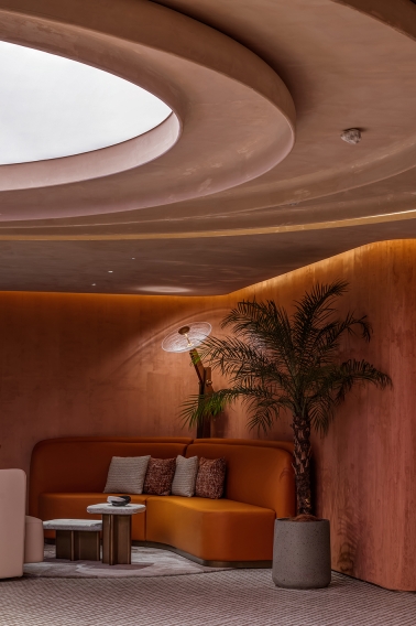 The barrisol ceiling in the reception constructs a space filled with futurism, which is offset against the feature wall accentuated by the light trough. Enhanced by lighting design, these two key elements strengthen the interior design theme and create inviting atmosphere.