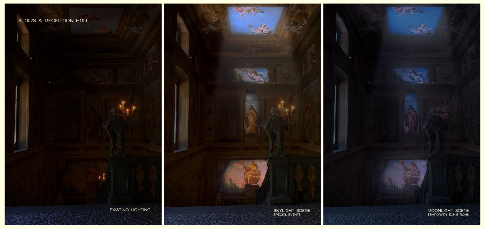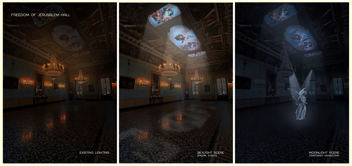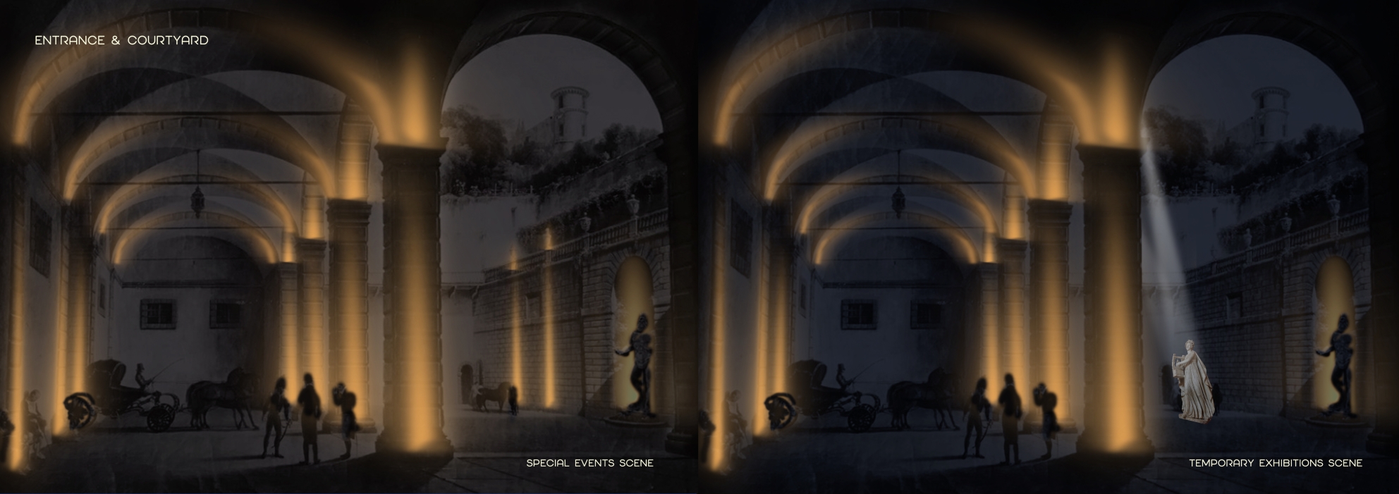 Each space with possibilities to exhibit any masterpieces has 2 separate lighting scenarios: one is for the ordinary visit, another one is for the temporary exhibition.