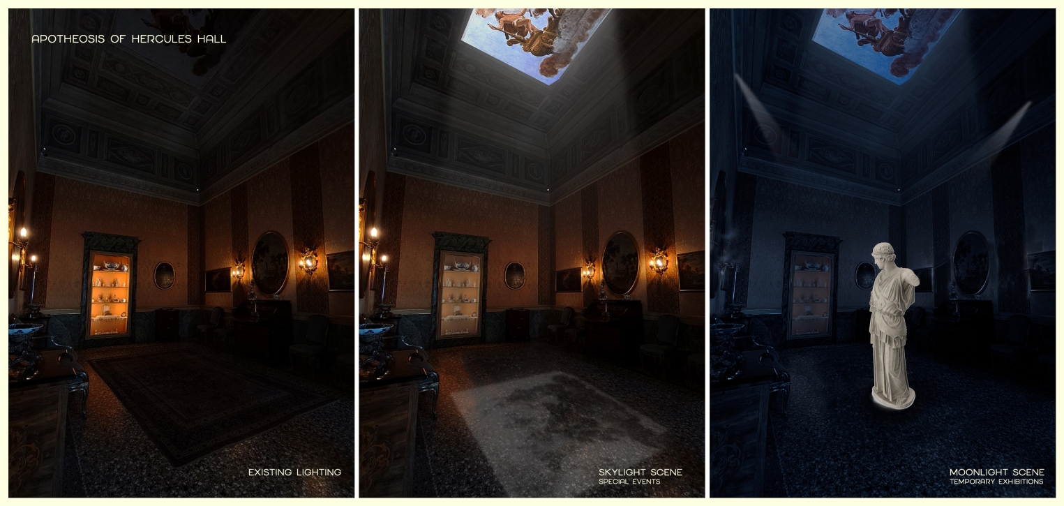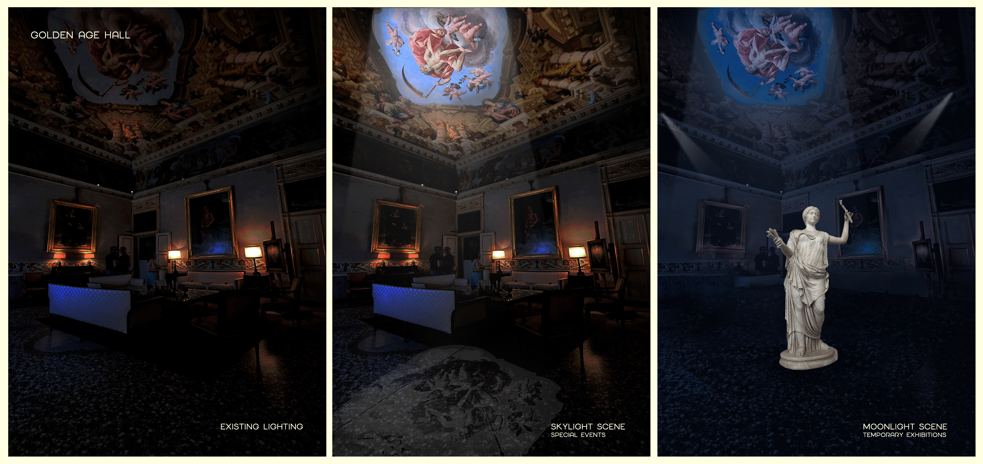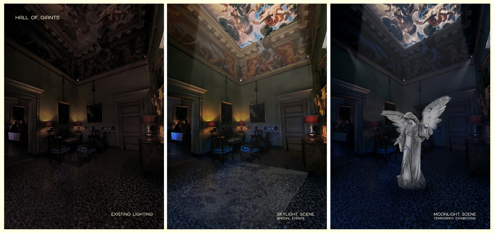 Each space with possibilities to exhibit any masterpieces has 2 separate lighting scenarios: one is for the ordinary visit, another one is for the temporary exhibition.
