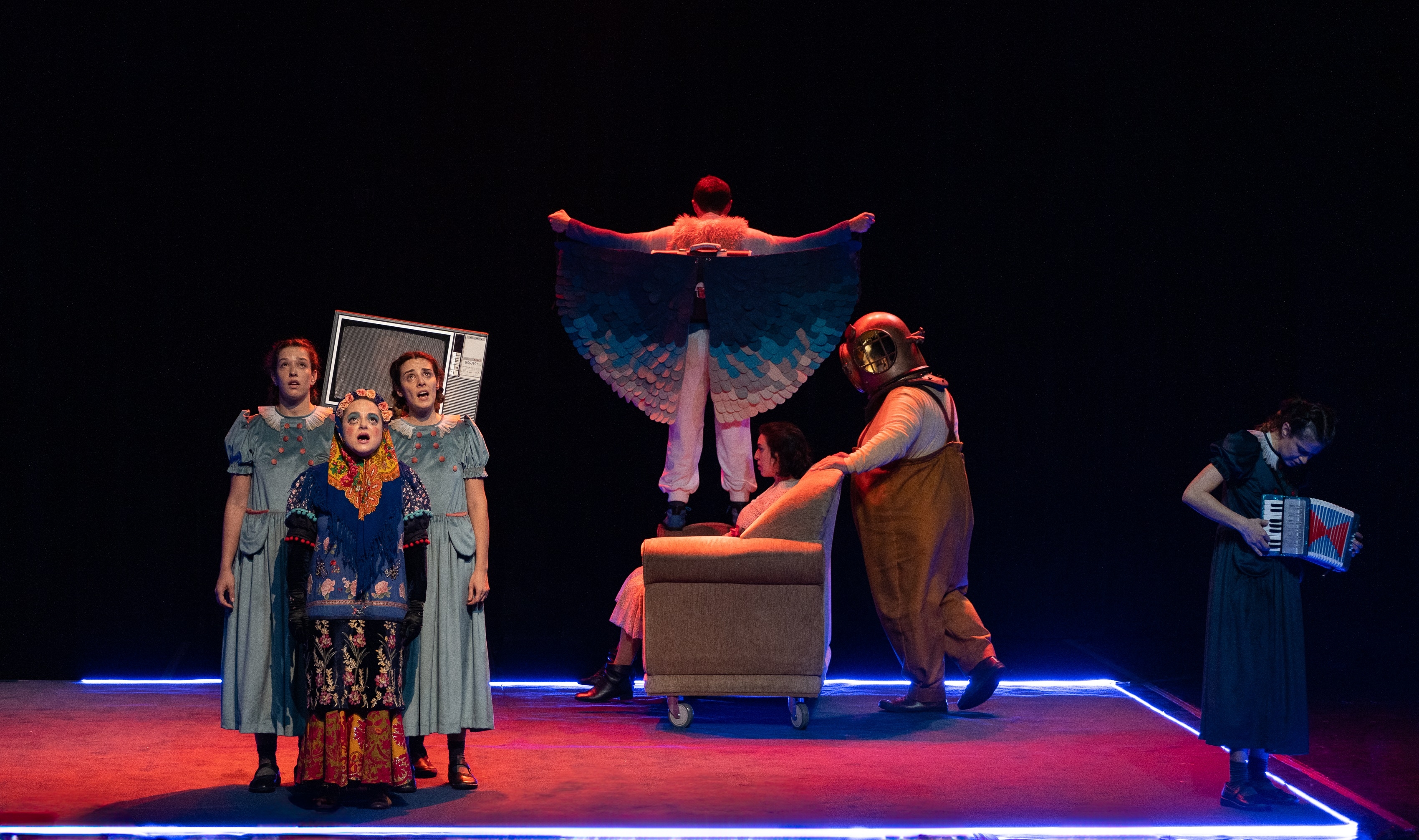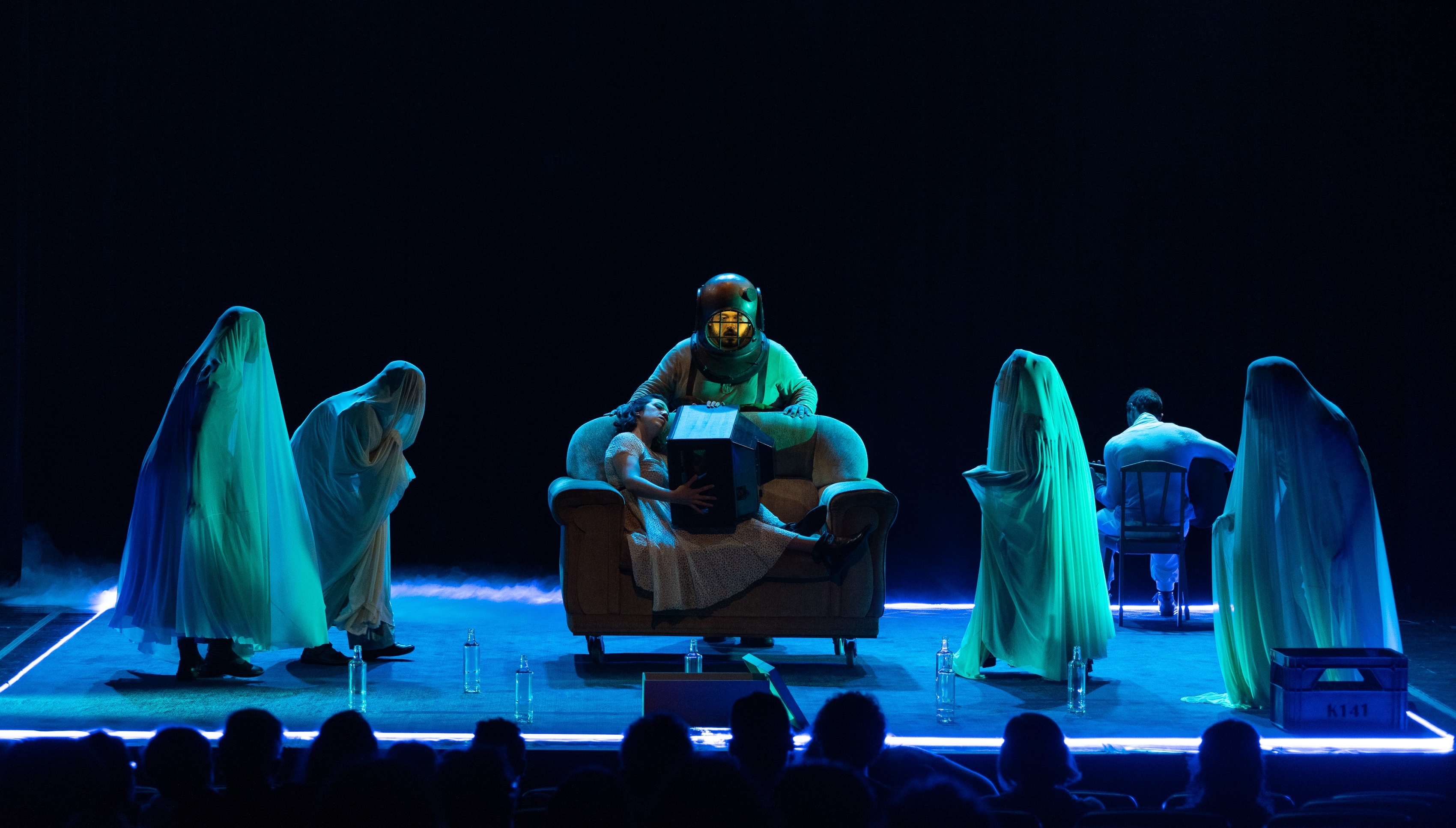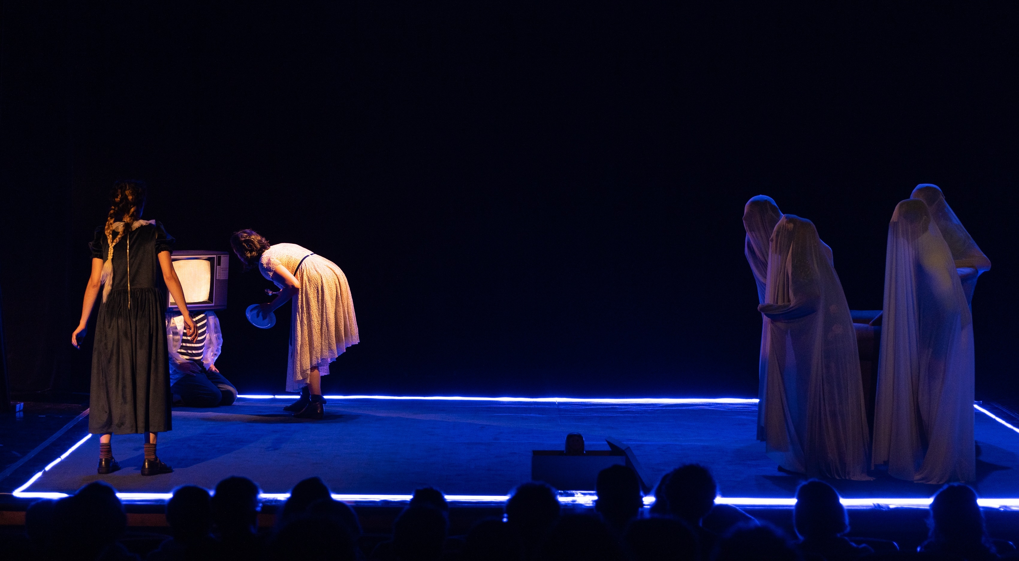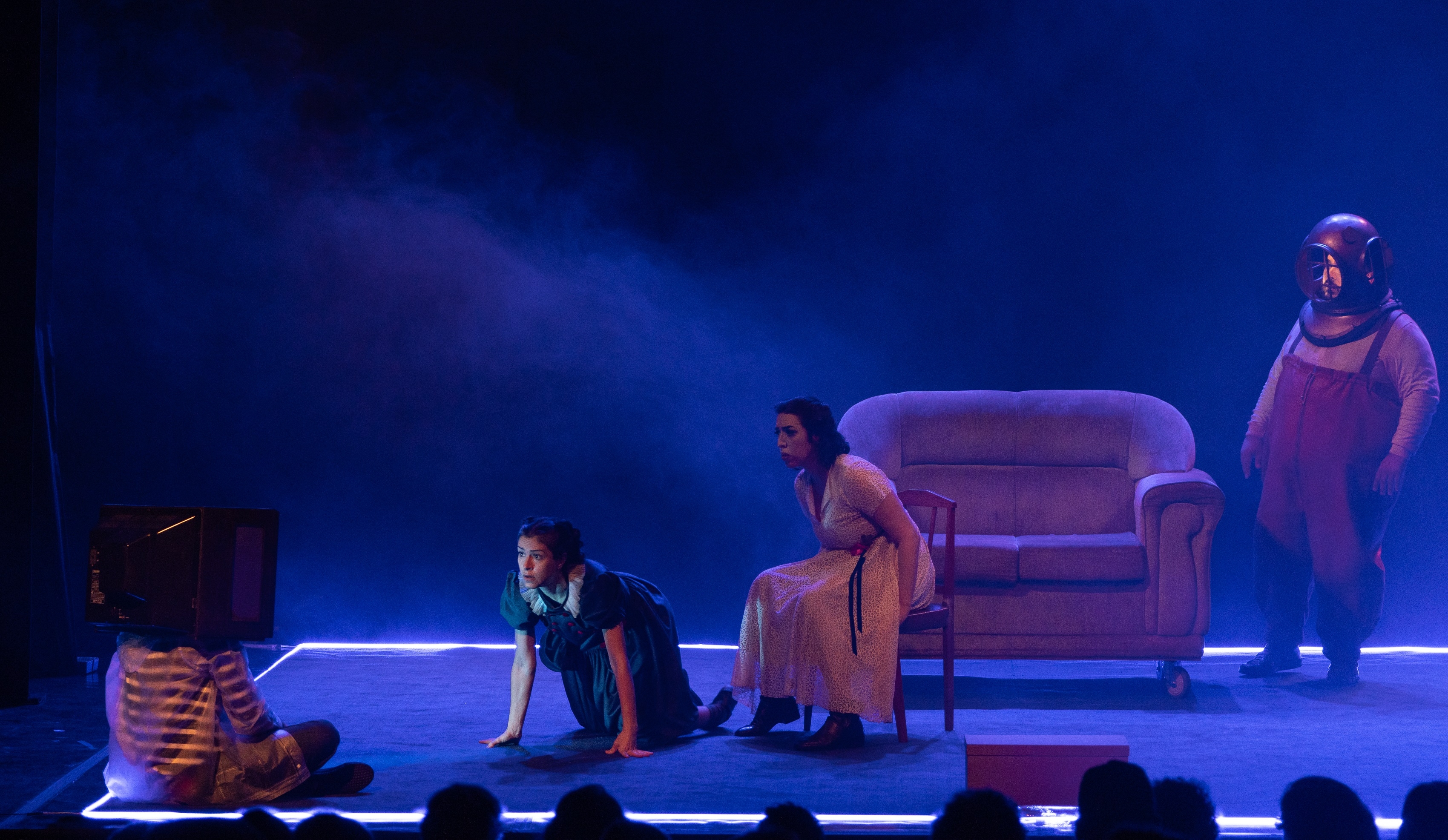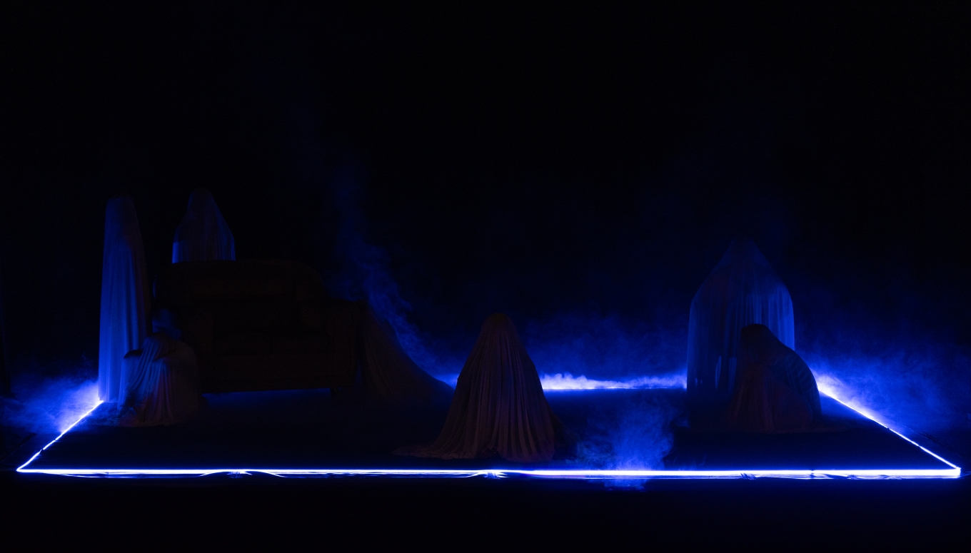 The initial staging requirement was that everything should take place within a rectangular area of 6mx5m. To create the atmosphere of an aquarium, the entire area was surrounded with blue neon LED strip. The lighting design project required careful choices: a carpet covered the entire stage area. Without filters, the light would make the set just an old and realistic house. It was necessary to make it fantastic and ghostly. For this purpose, the meticulous selection of filters included shades of white, blue, green, and amber.