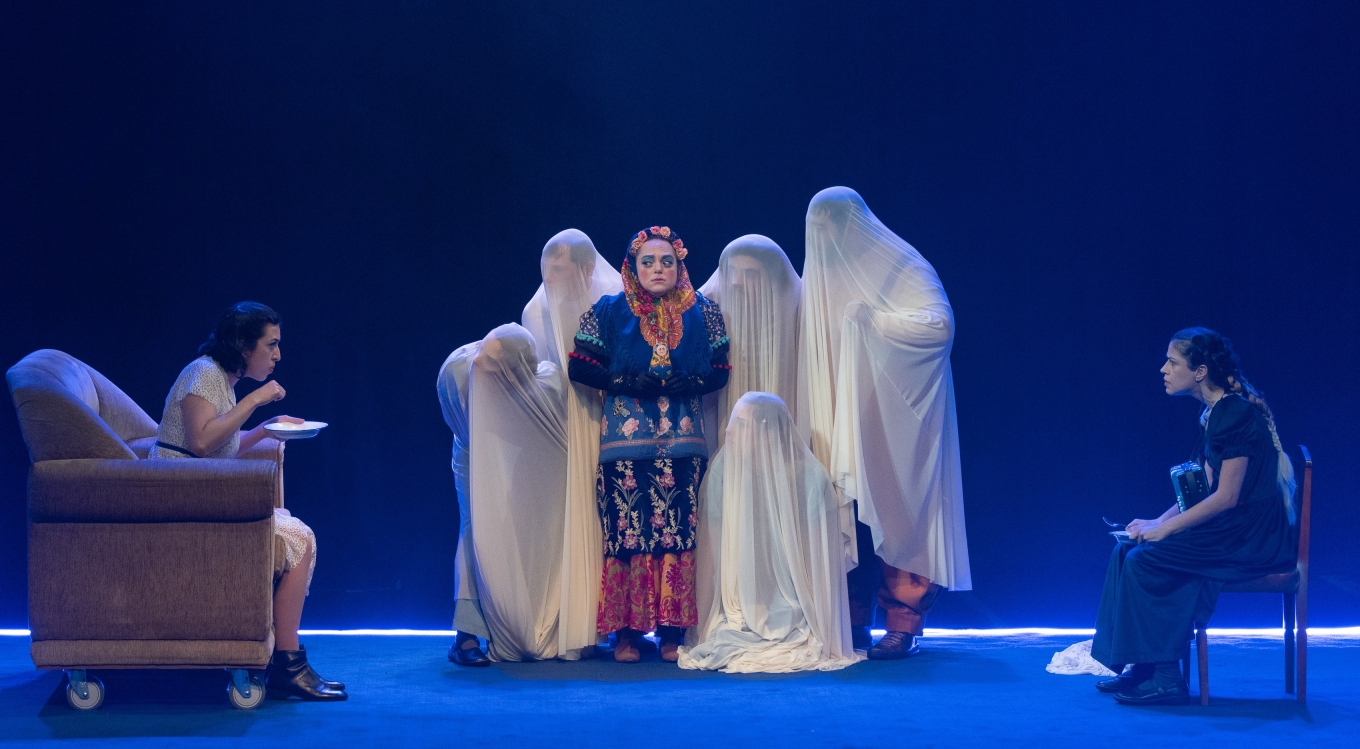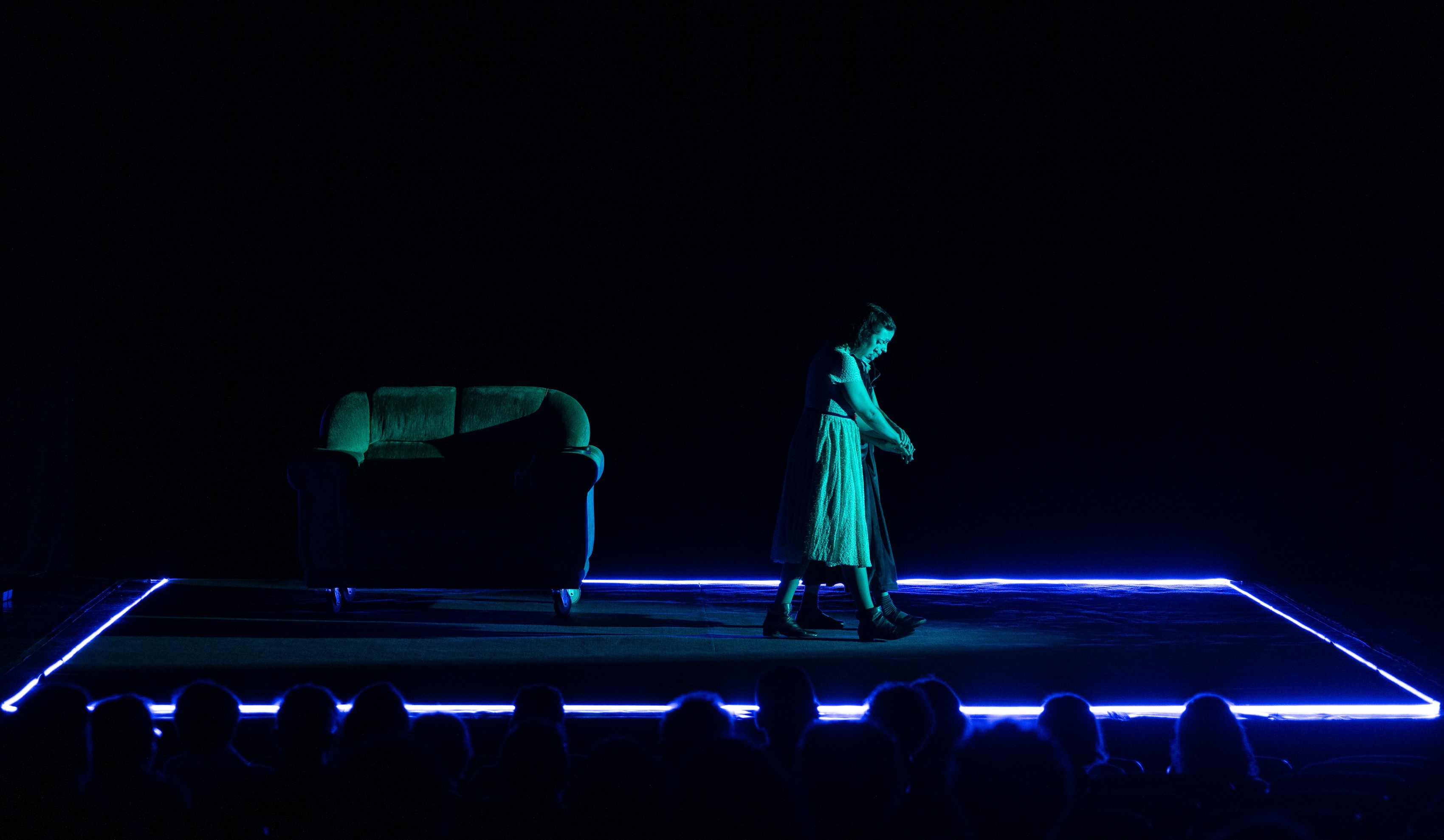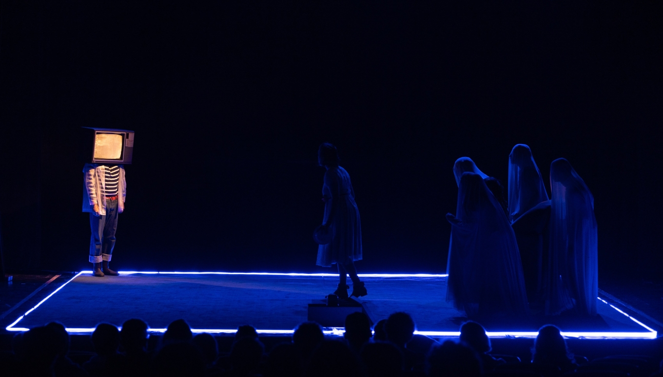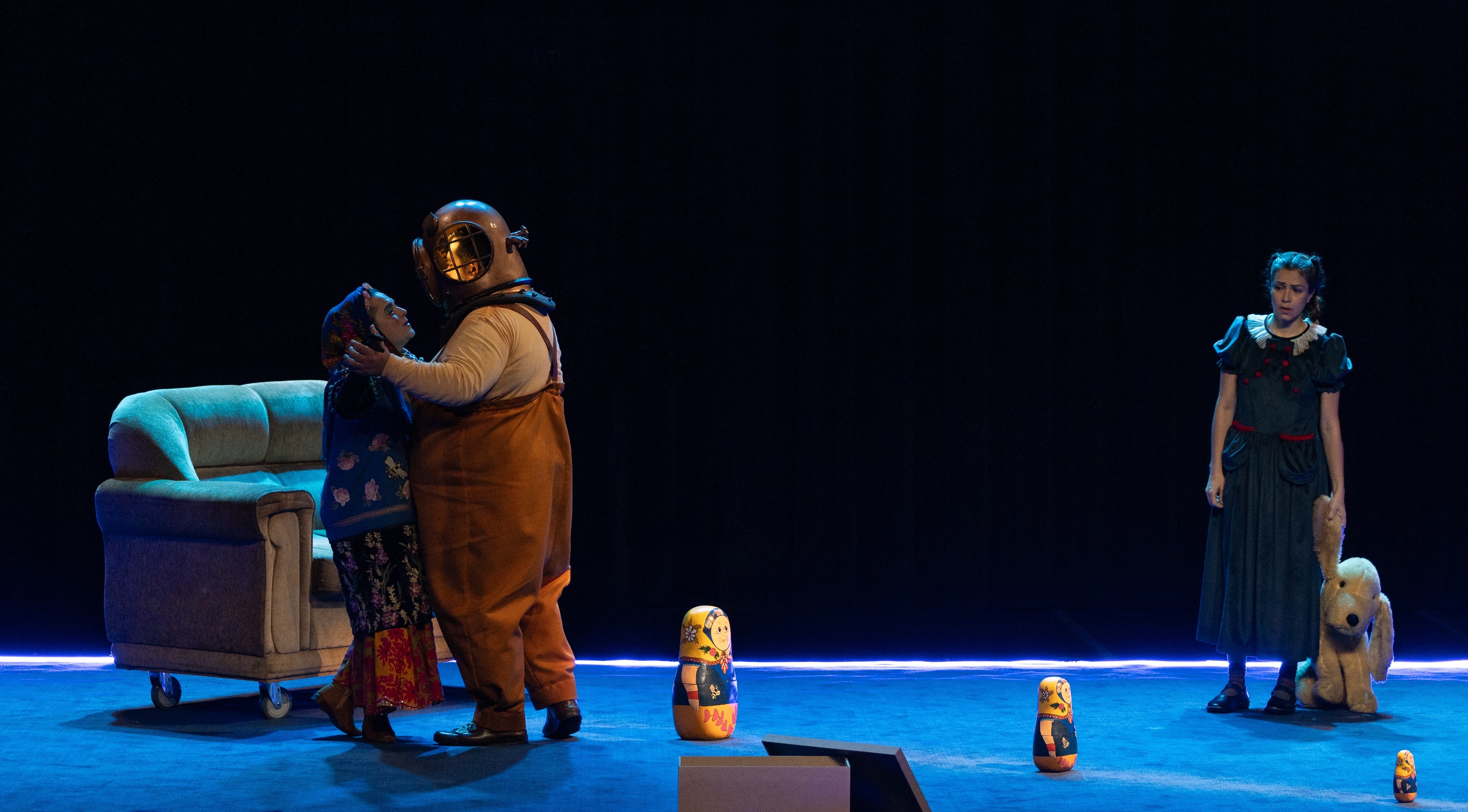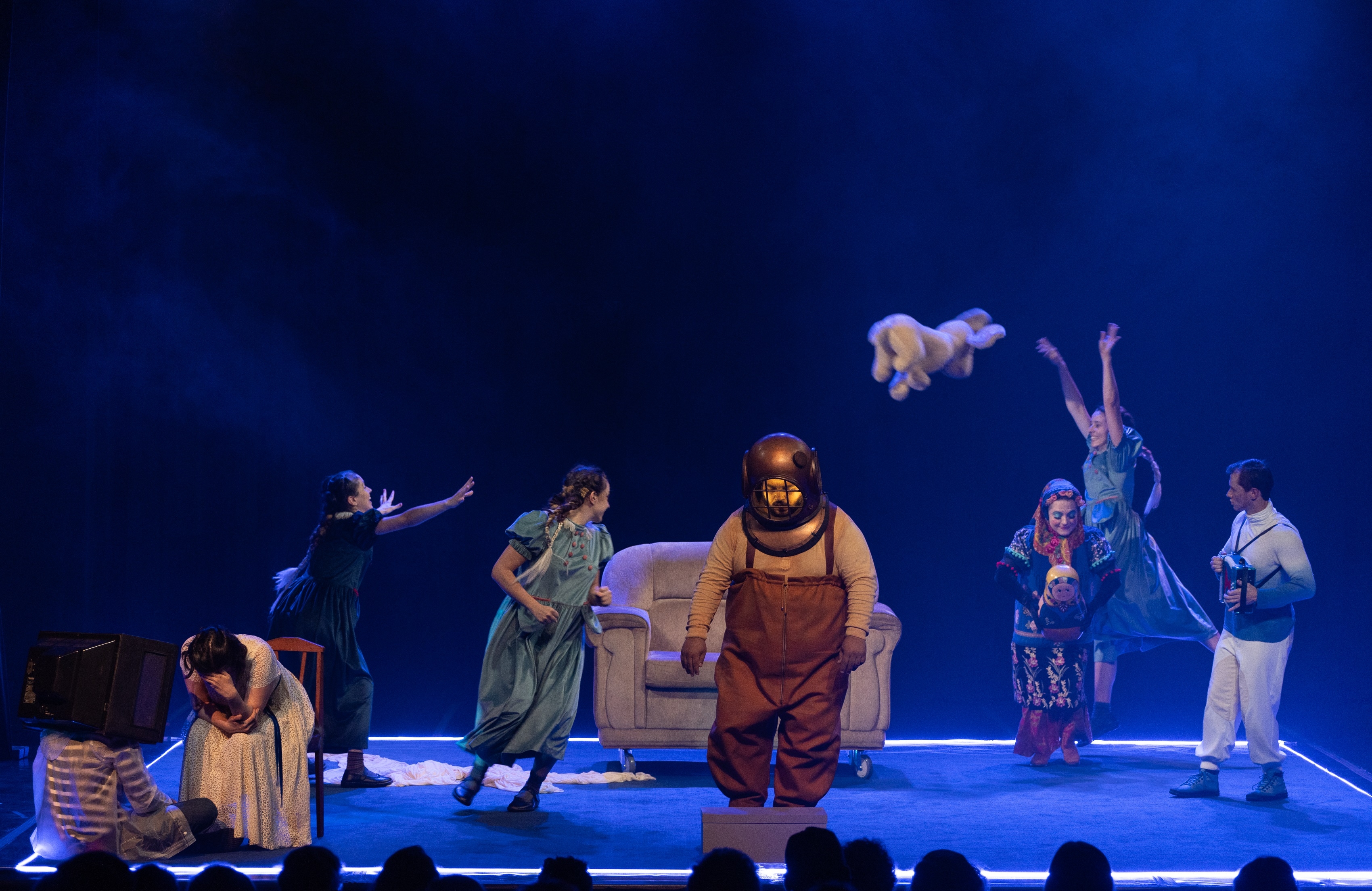 The initial staging requirement was that everything should take place within a rectangular area of 6mx5m. To create the atmosphere of an aquarium, the entire area was surrounded with blue neon LED strip. The lighting design project required careful choices: a carpet covered the entire stage area. Without filters, the light would make the set just an old and realistic house. It was necessary to make it fantastic and ghostly. For this purpose, the meticulous selection of filters included shades of white, blue, green, and amber.