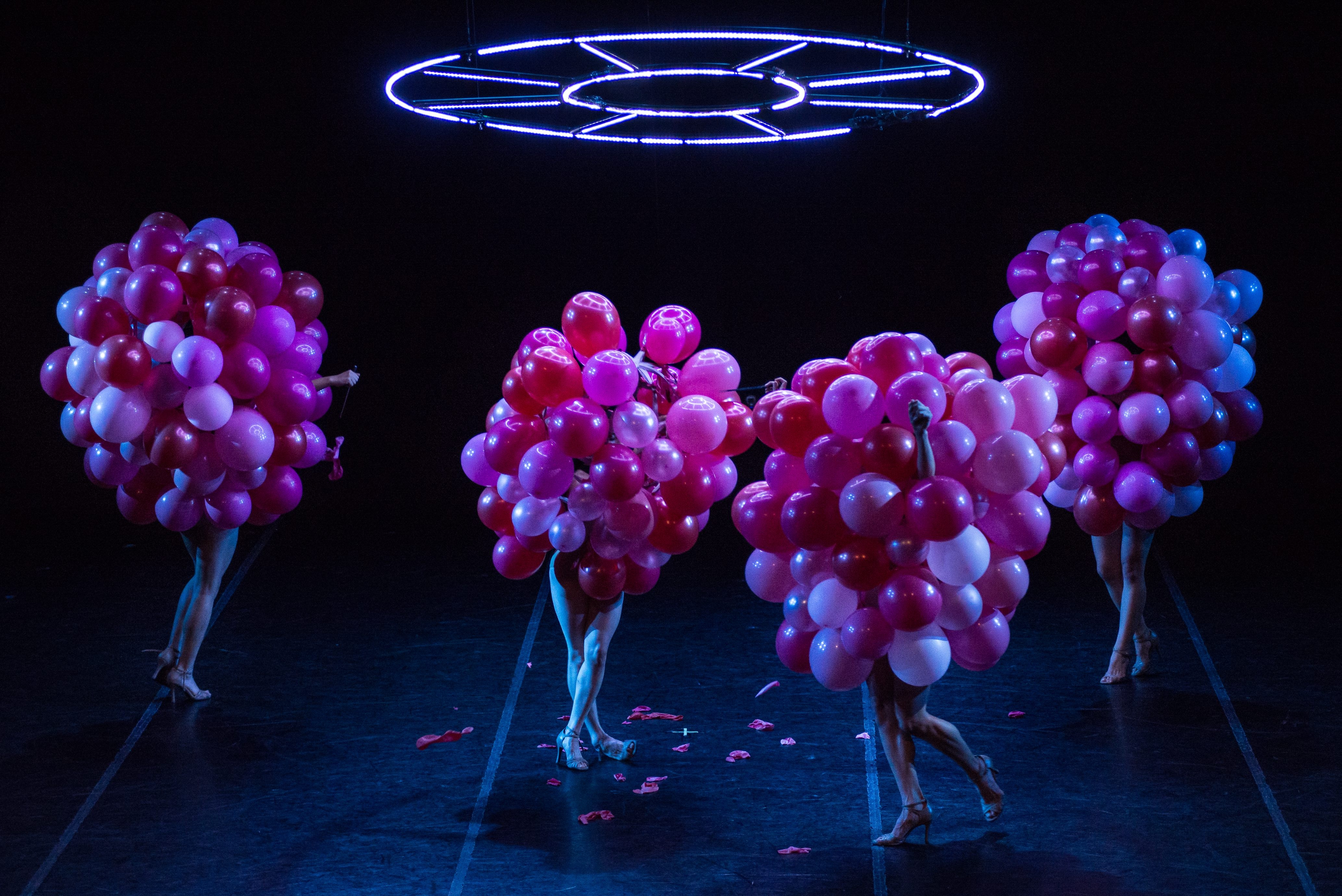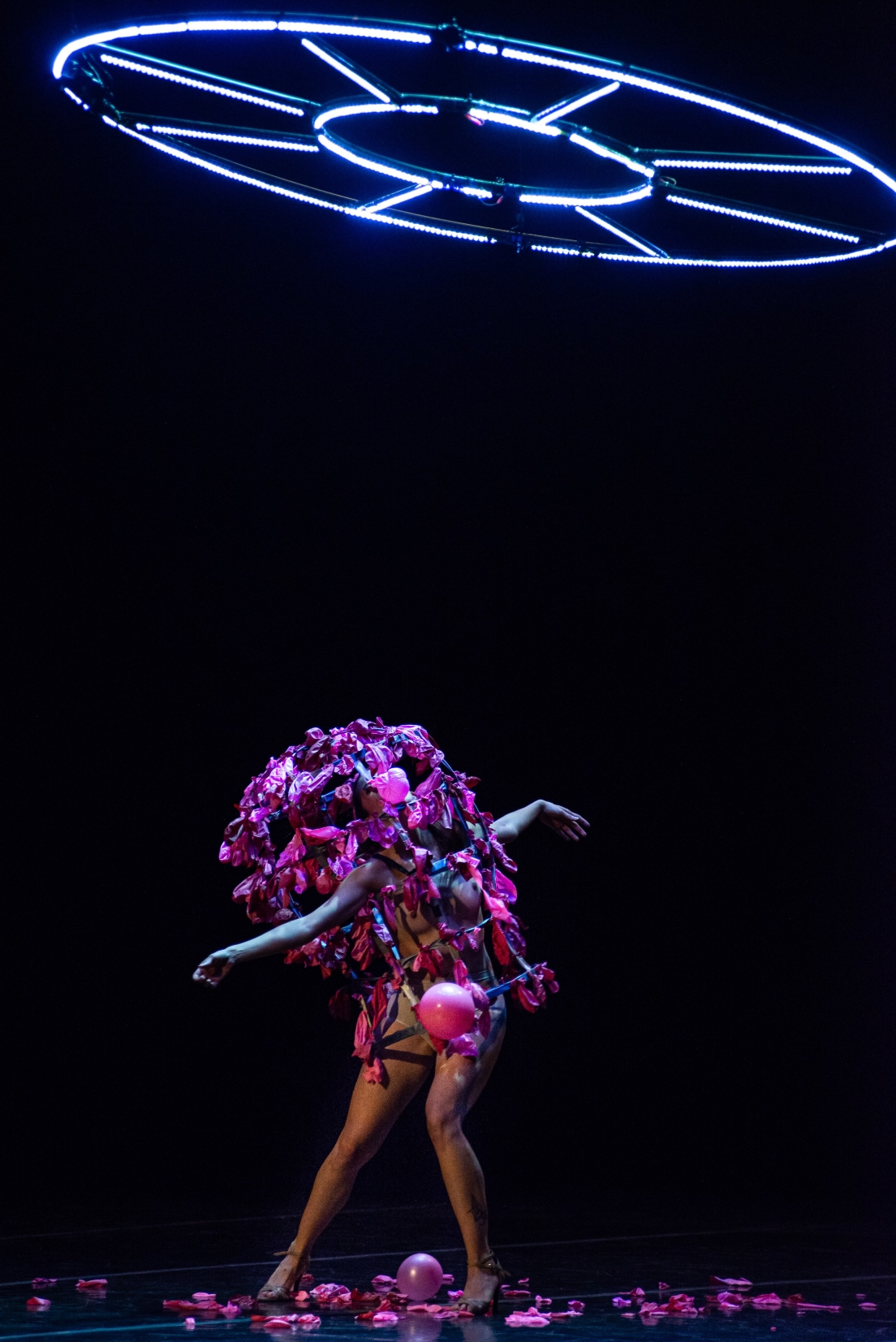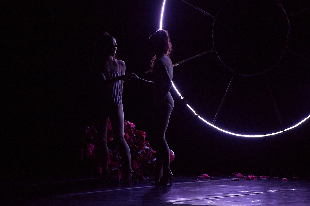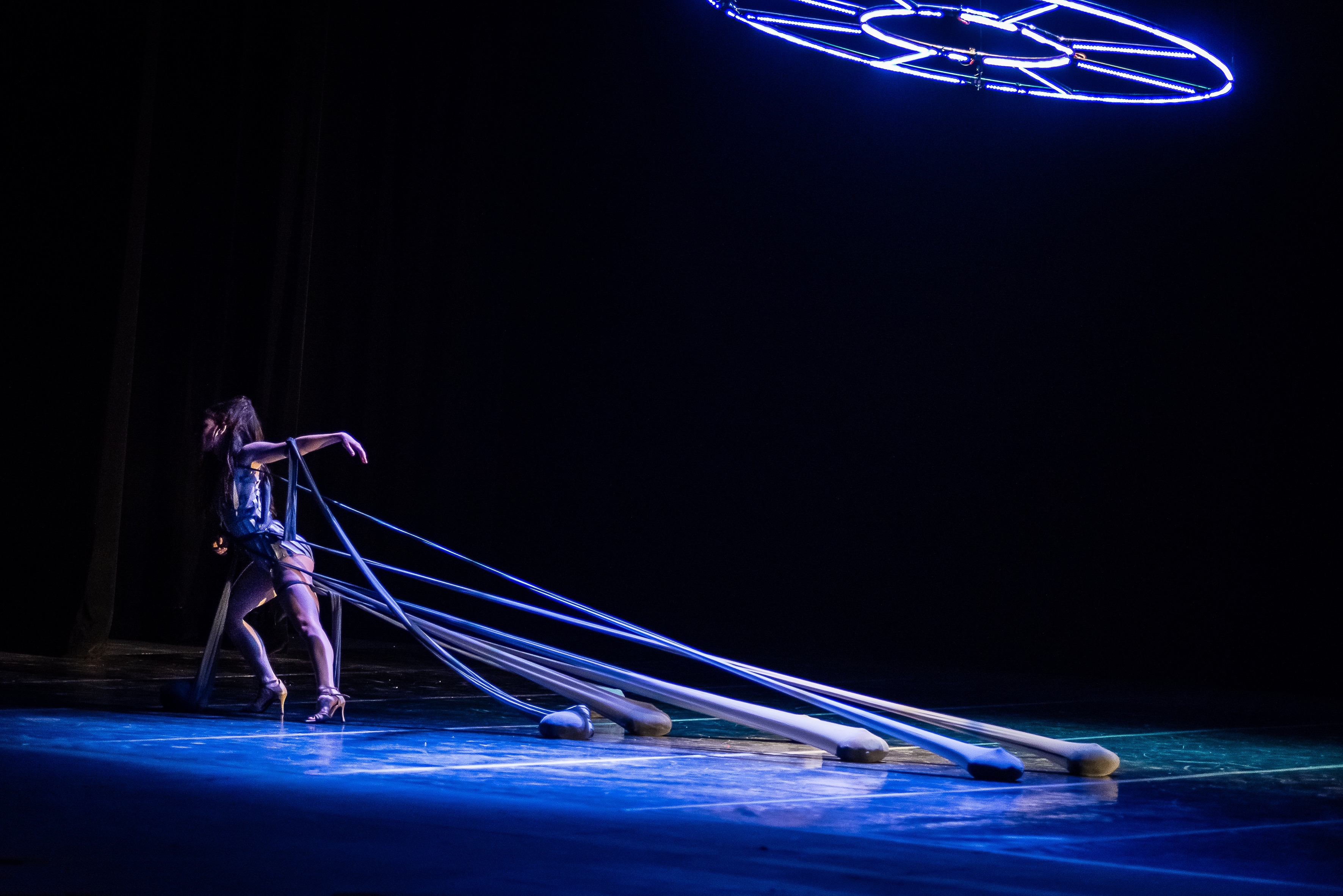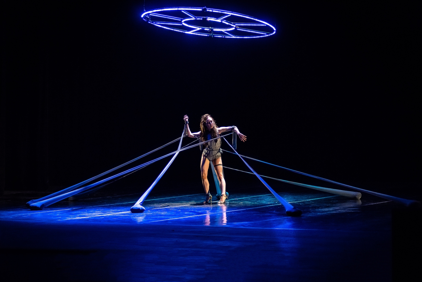 Through the scenic game resulting from the play with the object and the choreographic composition, the fragments of a woman are veiled and revealed; her psyche is exposed by corporal metaphors: the projection of beings of her own reflection in the moments of breakage of her life.