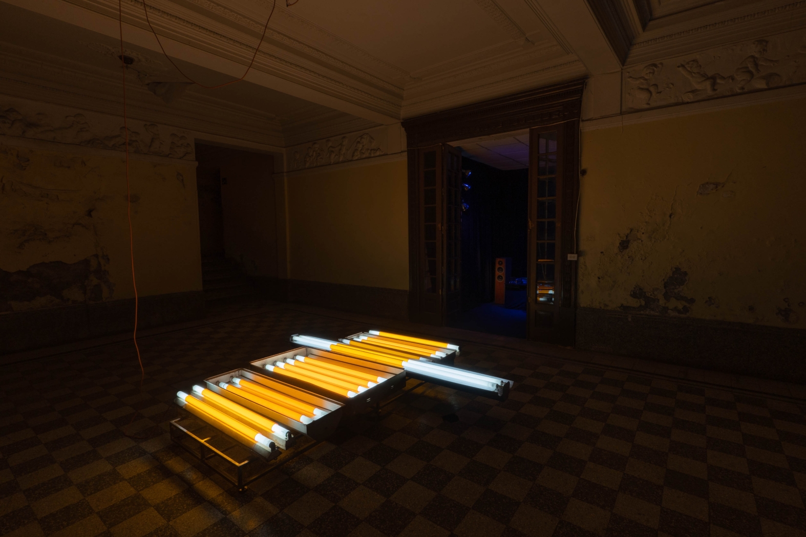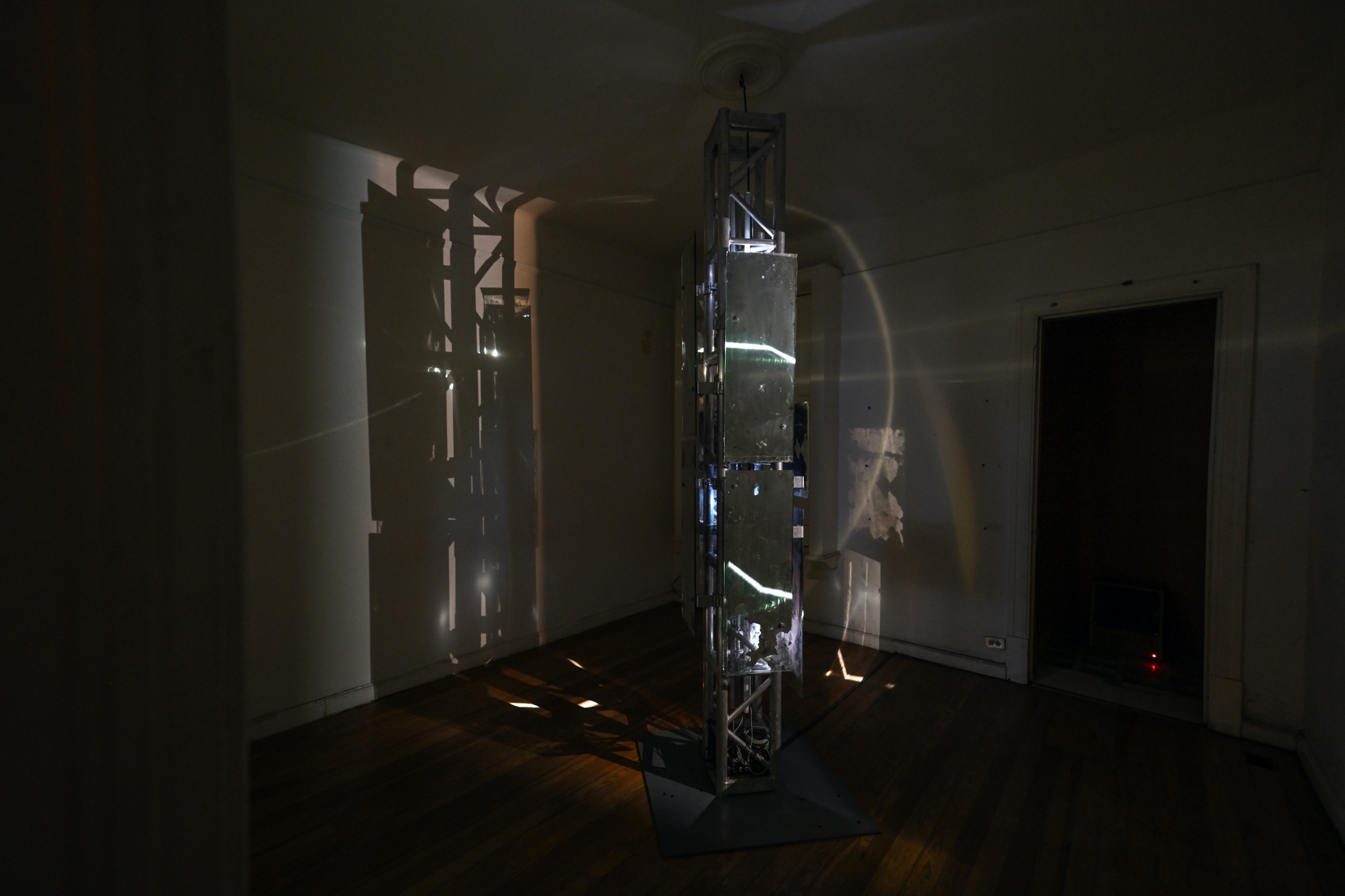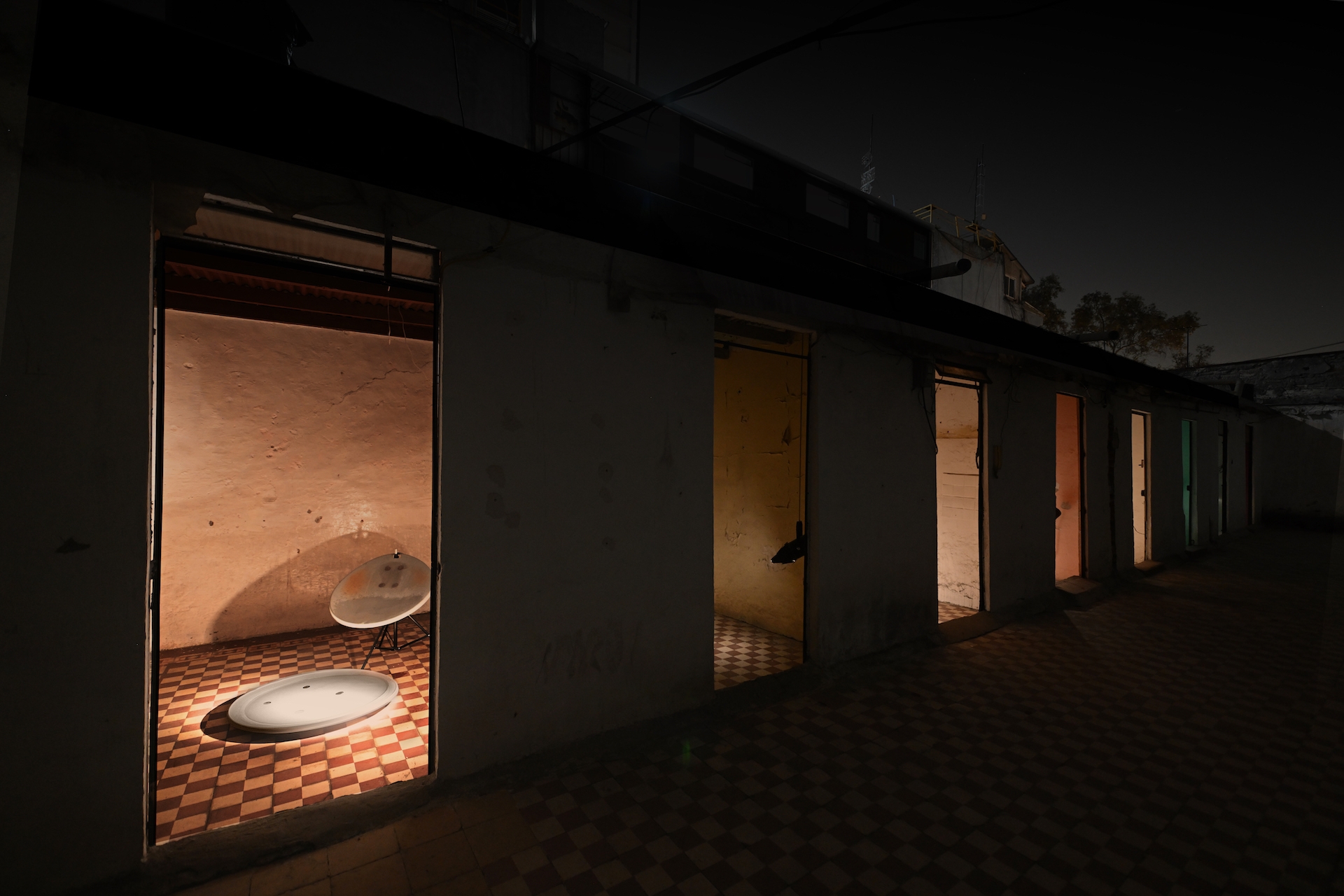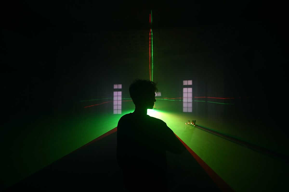The recovery and reuse of objects found on the site was essential to the construction of the light installations: from worn mirrors, satellite dishes or fluorescent tubes, to the interaction of light with the existing architecture, such as time-stained windows, a slanted room due to the subsoil sinking or the sun paths documented in the building and projected back to its walls.