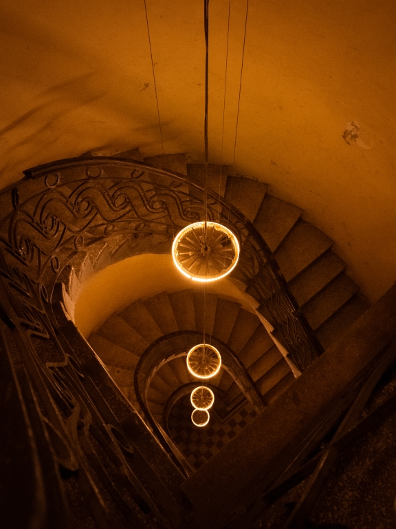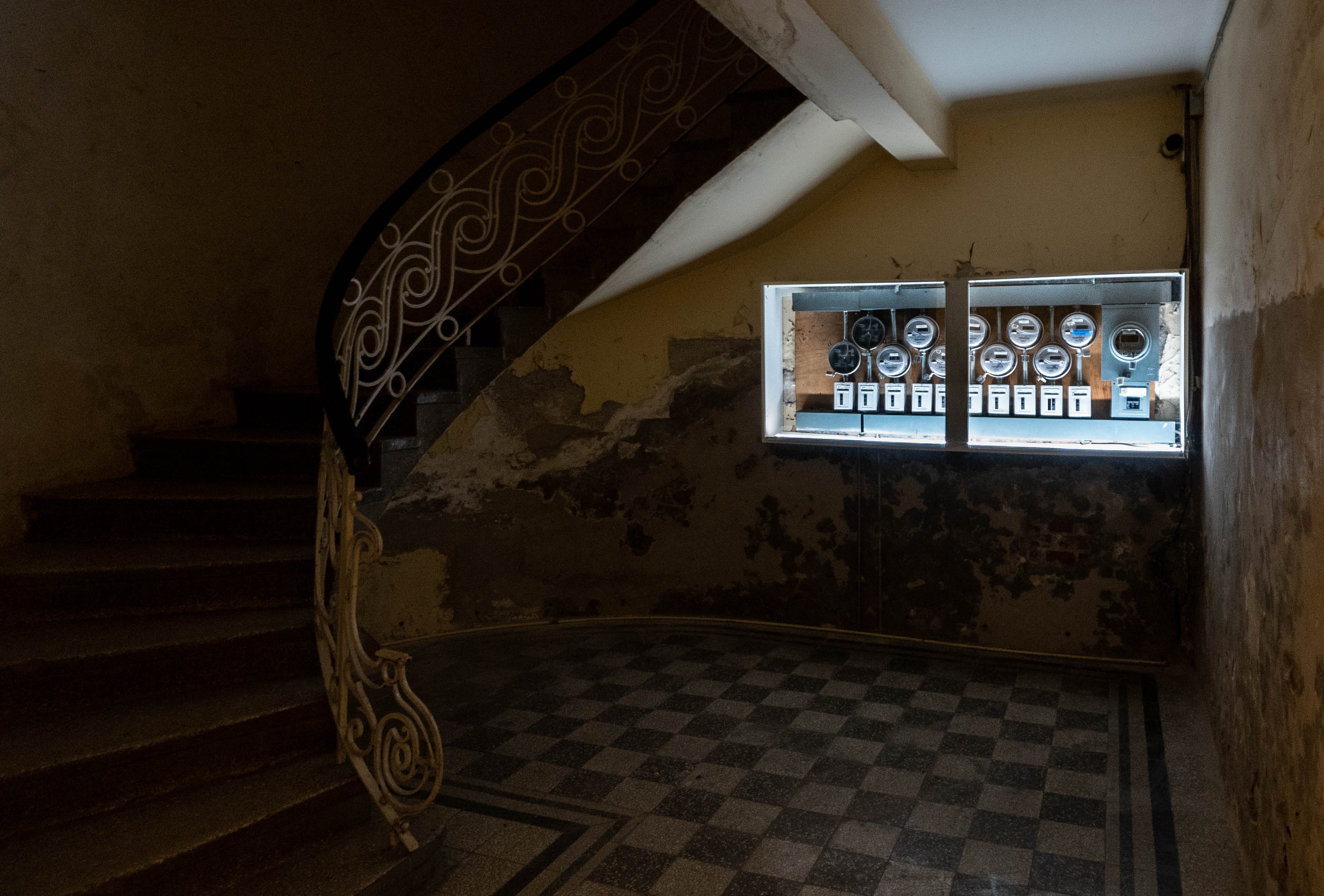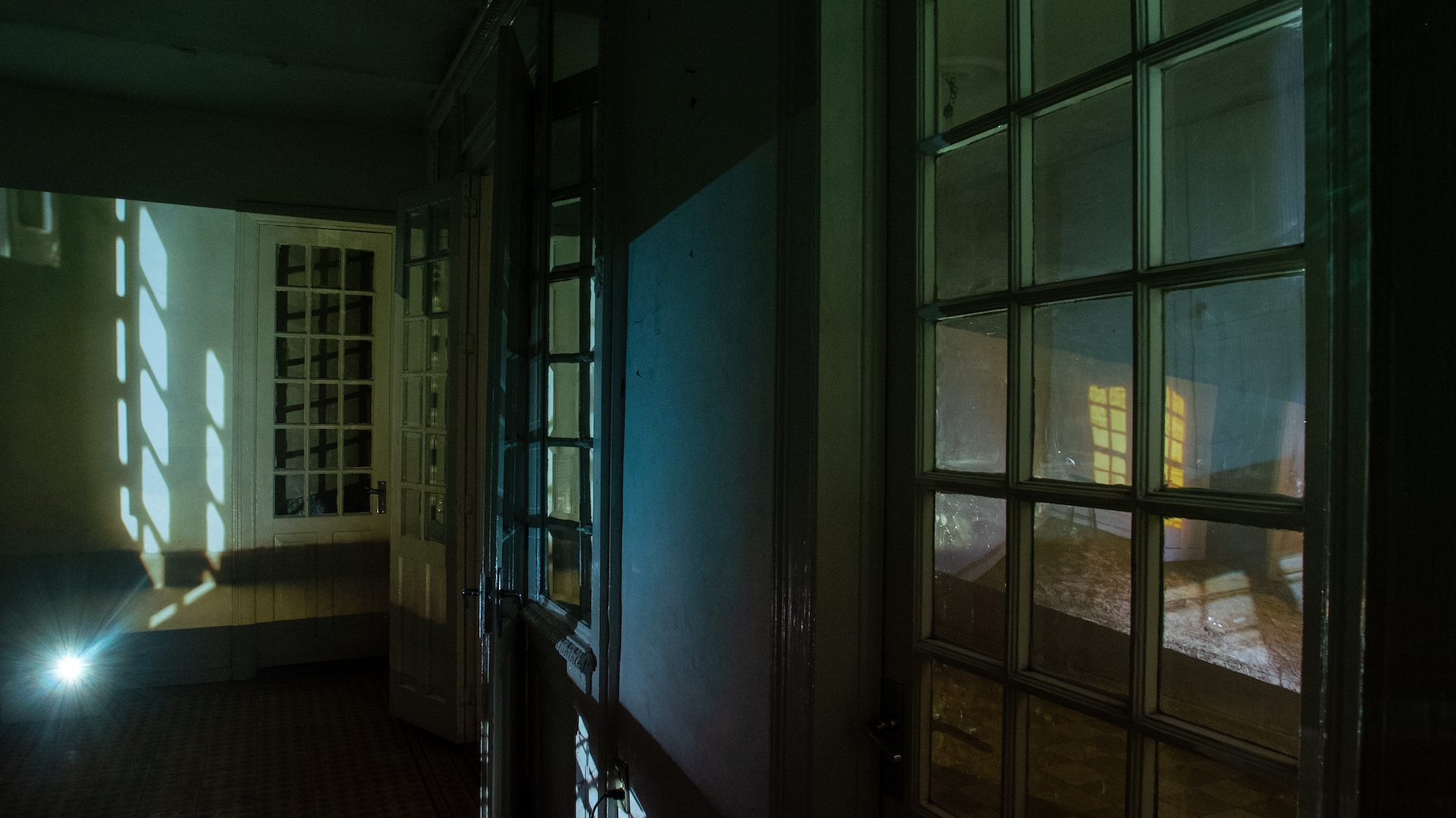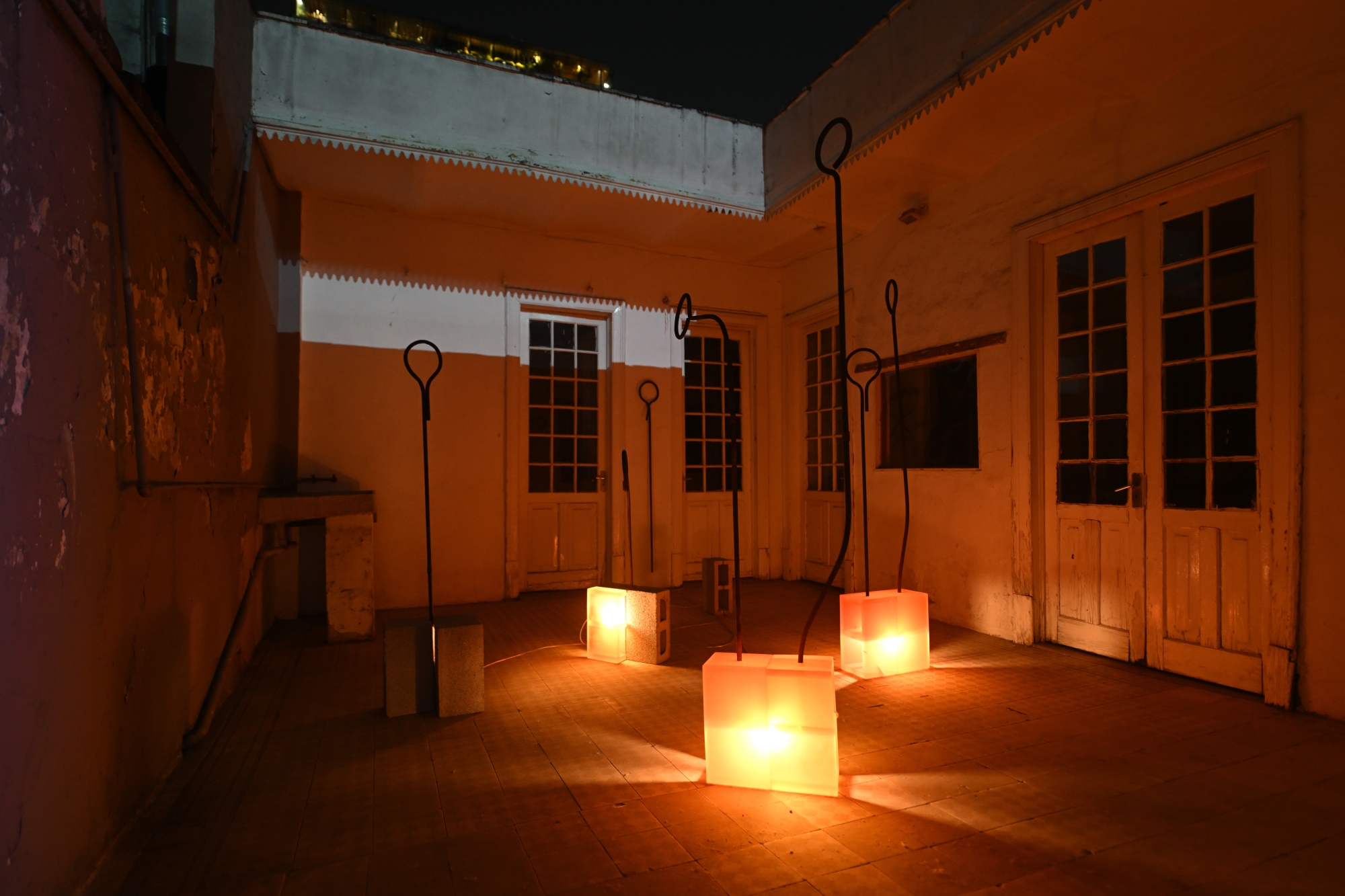 The recovery and reuse of objects found on the site was essential to the construction of the light installations: from worn mirrors, satellite dishes or fluorescent tubes, to the interaction of light with the existing architecture, such as time-stained windows, a slanted room due to the subsoil sinking or the sun paths documented in the building and projected back to its walls.
