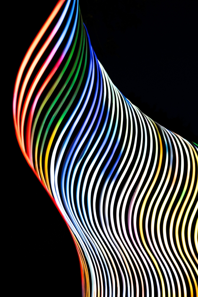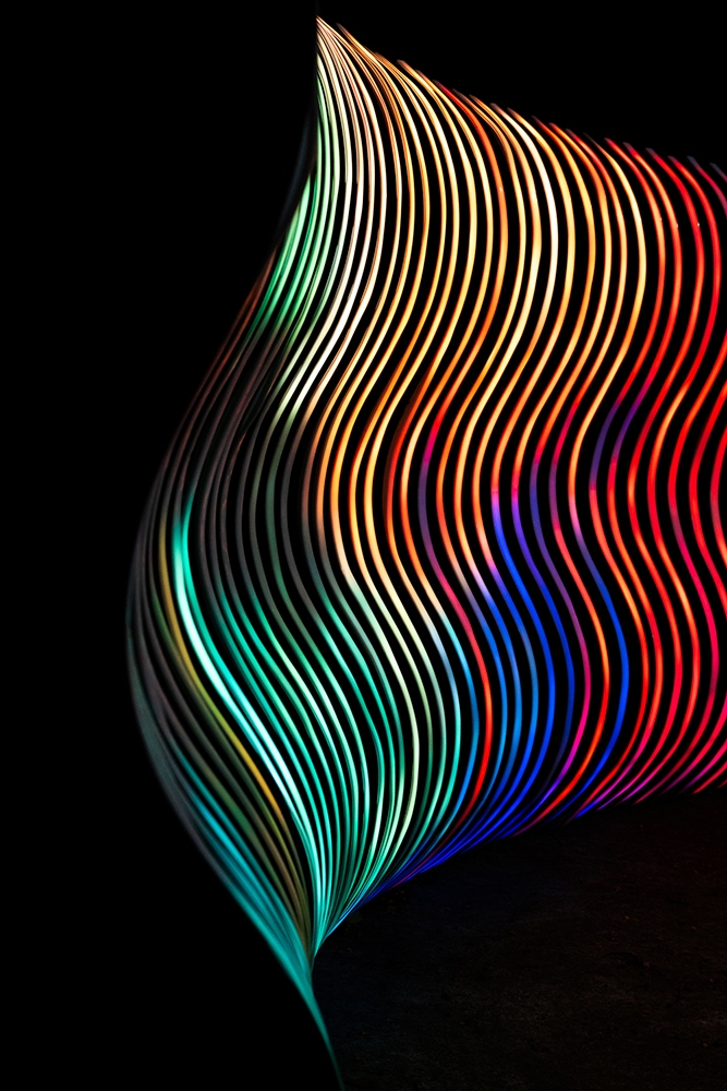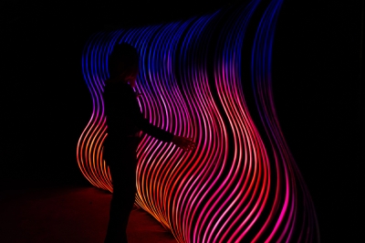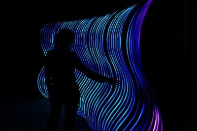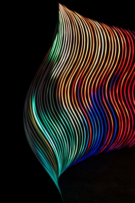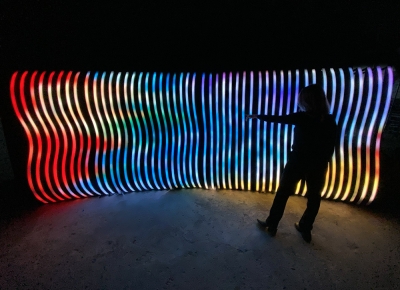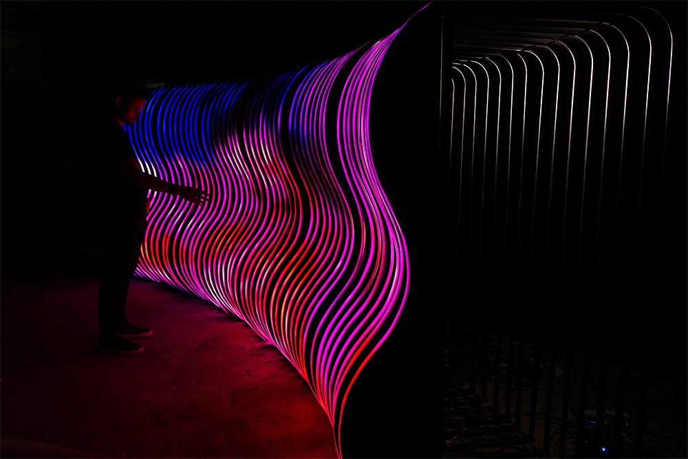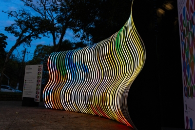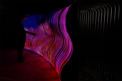 Inspired by curved, organic and fluid shapes, the sculpture's design was conceived in a modular way, with a metalwork structure that also references the transparency of the air. With the height of a person, and a width adaptable to the location where it will be installed, the artwork uses addressable LED strips lighting system, creating a display with sinuous shapes.