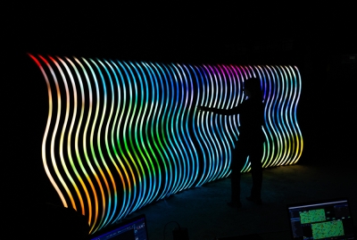 Users interactivity takes place through an interface (a tablet application), which allows the user to interact with the data, so that its manipulation will result in patterns of masses of colors projected onto the light sculpture.