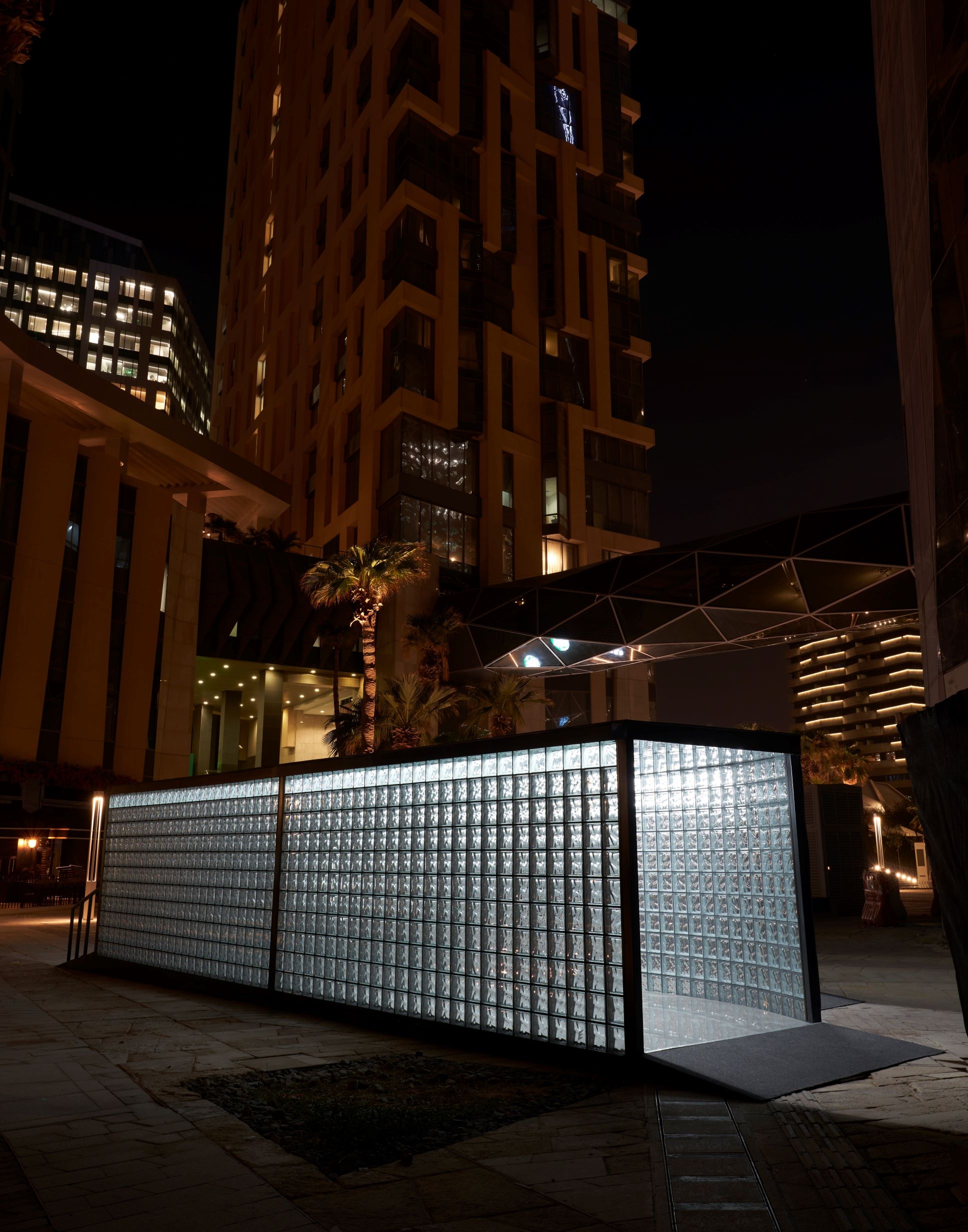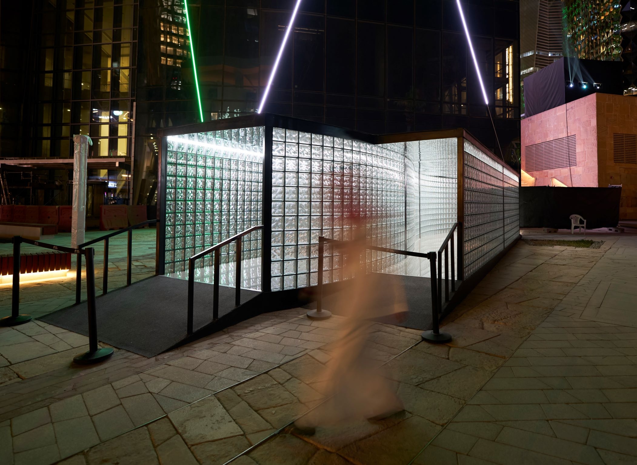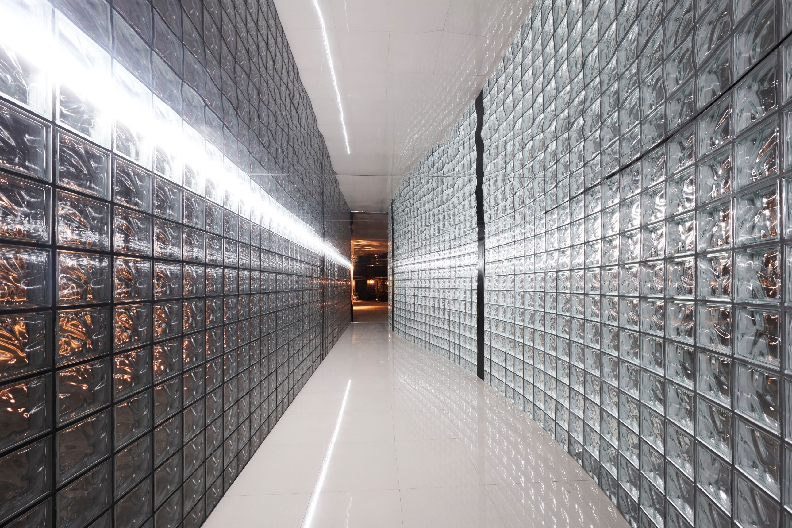 exploration. The structure of three parallel glass walls creates two intimate pathways that envelop a passage that is subtly illuminated in its metropolitan context. The primary component that makes up the installation is the glass block, which is used along the entire length of the walls. These walls are then further reflected on the infinity mirror effect of the floor and ceiling, creating a seemingly boundless passage of hazy glass blocks. Through Urban Flux invites visitors to contemplate their surroundings as they journey through a path where it is deliberately obscured. The various layers offer the viewer different degrees of distortion, making it a space of abstracted and ephemeral silhouettes, while the installation’s multi-layered experience recalls the transformative power of changing