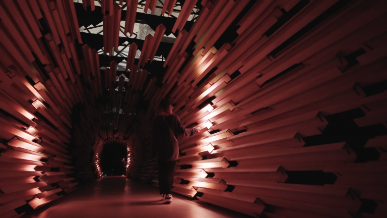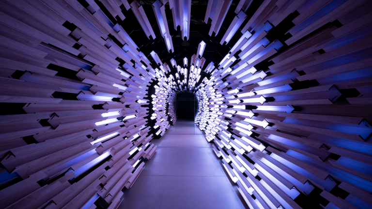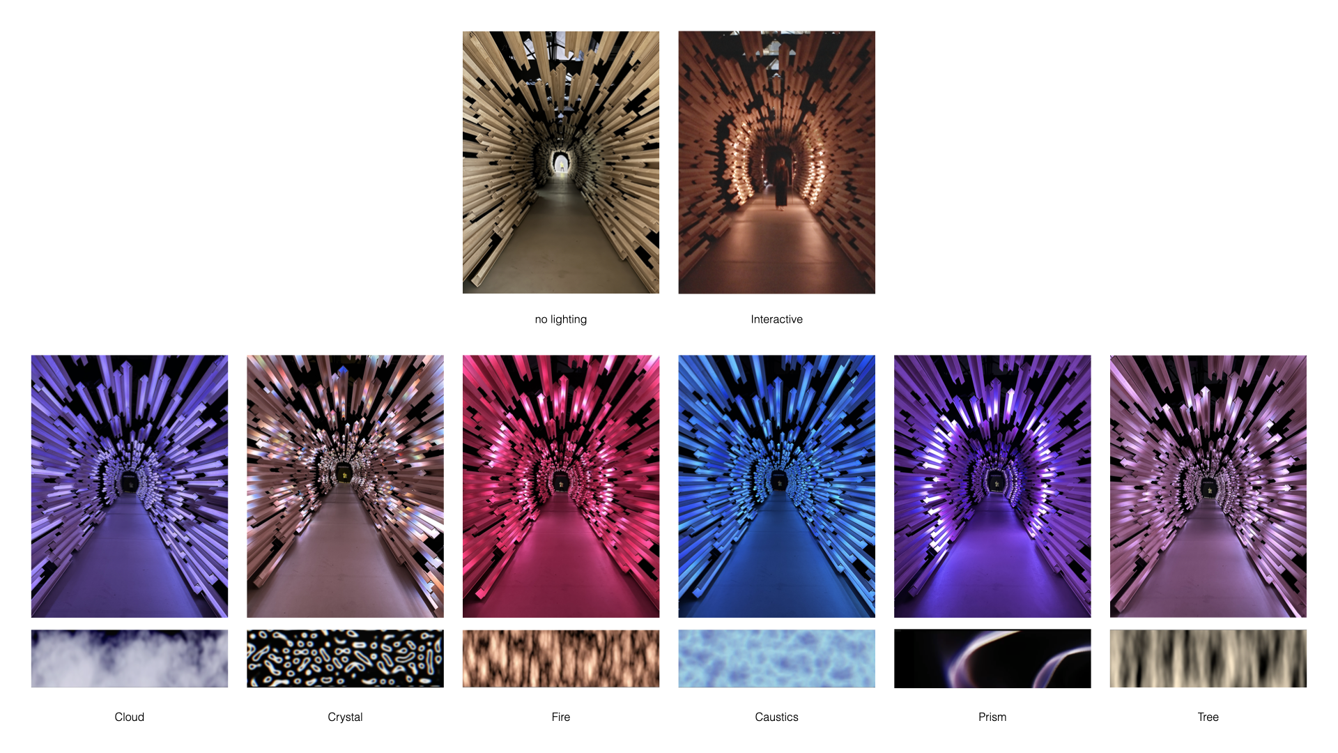 To envelop the entire corridor in soft, smooth light resembling a natural environment, 1.5-meter wooden indirect lighting units, incorporating Full-color LED Strips, were arranged in an arch. Each of these indirect lighting units was animated like imagery, altering the overall lighting of the space over time, infusing life into the environment and enhancing the richness of the visitors' experience.