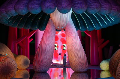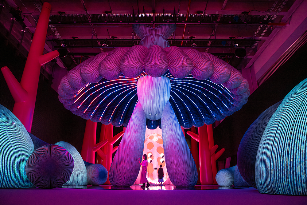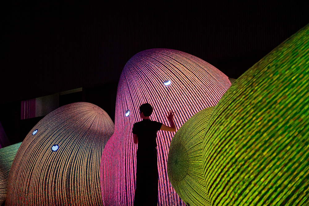 Visitors are asked to commit to the path – a tight and winding trail with subtle points of connection along the way – a glowing landscape of oversized, whimsical mountains that chant incantations and blink innocently from digital eyes.