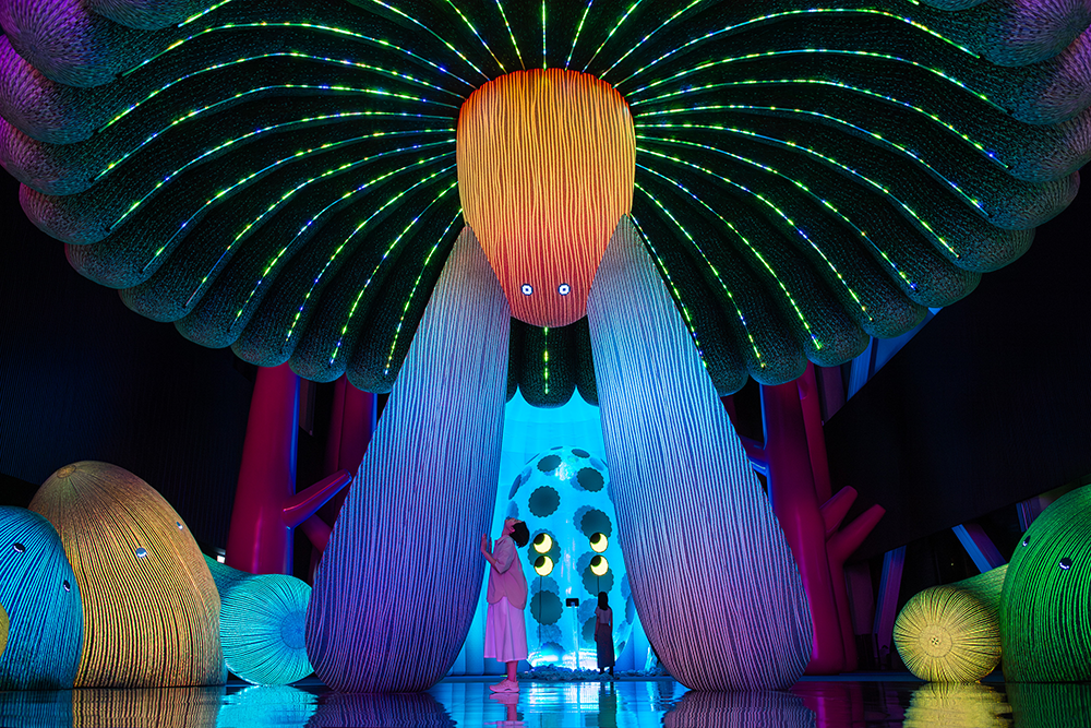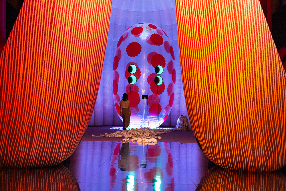Modern Guru is a translucent ovoid with four huge digital eyes, floating above a ceremonial ring of LEDs. From his mouth flows a ream of absurdist messages, and in a statement about the true nature of lived experience, a new message is delivered when visitors take a photo of Modern Guru – a missive produced only for those who seek to photograph life rather than live in the moment.