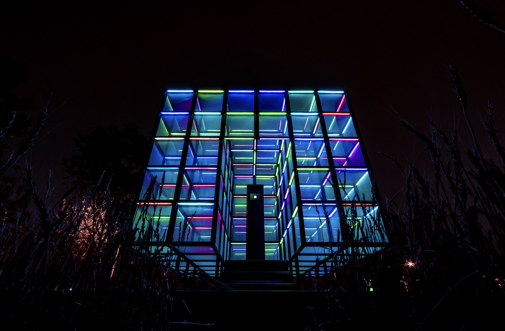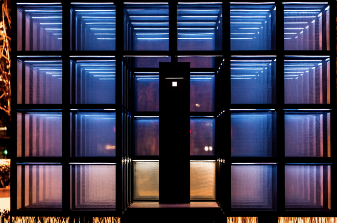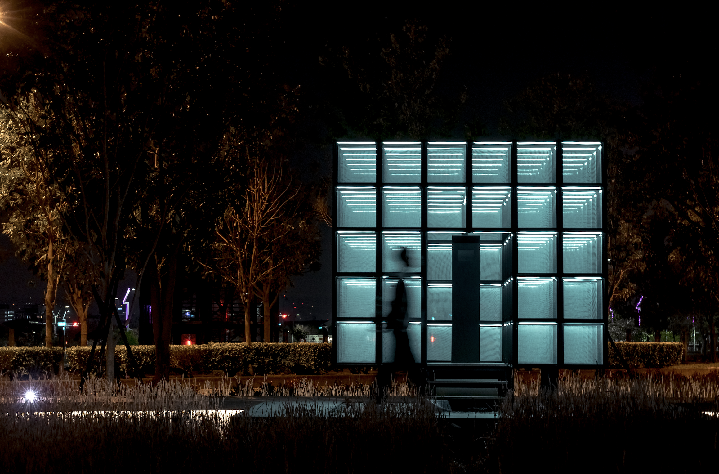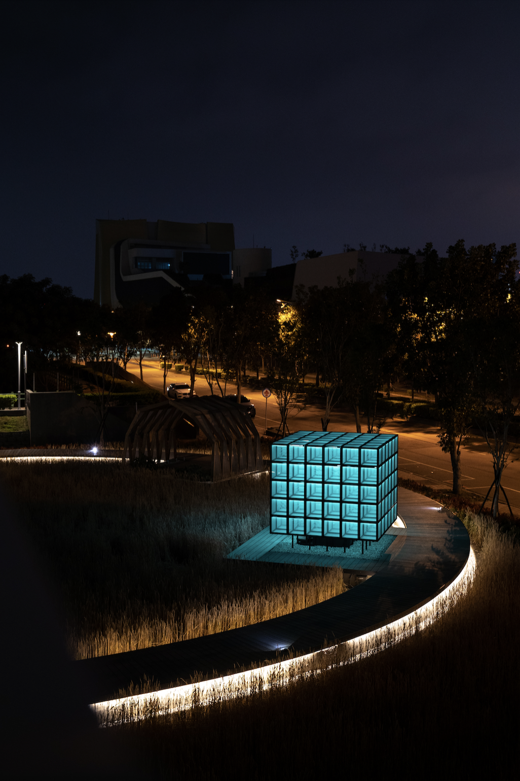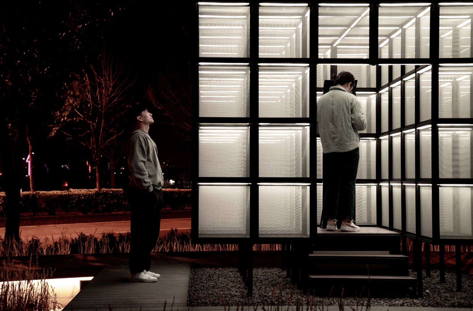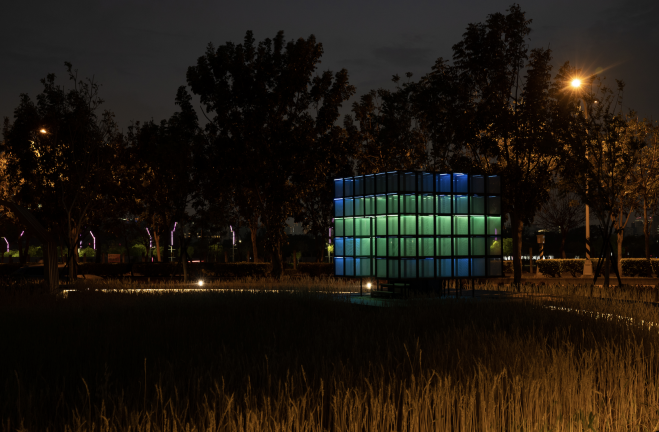 Mindscape Kiosk features a lattice structure made of aluminum pipes embedded with leds and mesh screens. The mesh screens capture environmental information, visualizing light, shadow, wind, rain and dust, enhancing the sensory experience of the local environment. During the daytime, it acts as a check-in collection box, and environmental information is instantly presented as subtle movements on the mesh screen. At night, the framework disappears, and the collective emotional state gradually overlays the mesh screens. It becomes a dynamic lightbox that continuously changes based on the information.