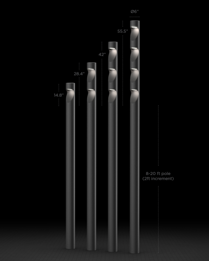Bollards are available in heights of 24”, 39”, and 46”. Designers may select up to two light modules per bollard, with lighting packages up to 4,191 lumens per module. Columns may be chosen with up to four modules per column, 4,809 delivered lumens per module and up to 20 feet in pole height. Columns and bollards are available with 15?, 30?, or 55? beam angle reflectors and Type III distribution.