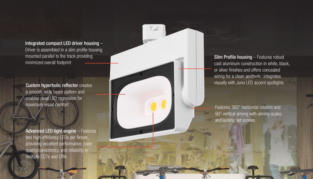 Entry DescriptionMatch lighting performance to the size of the space and desired effect with a choice of 7 lumen packages ranging from 1700lms to 6300lms, and available in 80 or 90 CRI; CCTS include 2700K, 3000K, 3500K, and 4000K. Blast the room perimeter for visual impact or dim it to your preference to create a more balanced space. This new Narrow Profile LED Wall Wash Track Fixture family presents itself with an integrated, compact LED driver housings that powers an advanced light engine composed of two high-efficiency LEDs (per fixture), providing excellent performance, color quality and consistency as well as reliability with multiples CCTs/CRIs. A custom, patented hyperbolic reflector creates a smooth, wide beam pattern and enables deep LED regression for maximum visual comfort; minimal aperture brightness fights glare, improving user comfort. In addition, an impeccably designed center of gravity maintains perfect balance regardless of fixture aiming and prevents track from tilting or twisting. Fixtures feature a 360° horizontal rotation and 90° vertical aiming, and it is designed with vertical aiming scales and locking set screws. They can also be aimed straight down to provide widespread ambient lighting. An array of accessories (9) ranging from louvers to snoots as well as barndoors and lenses are also available.