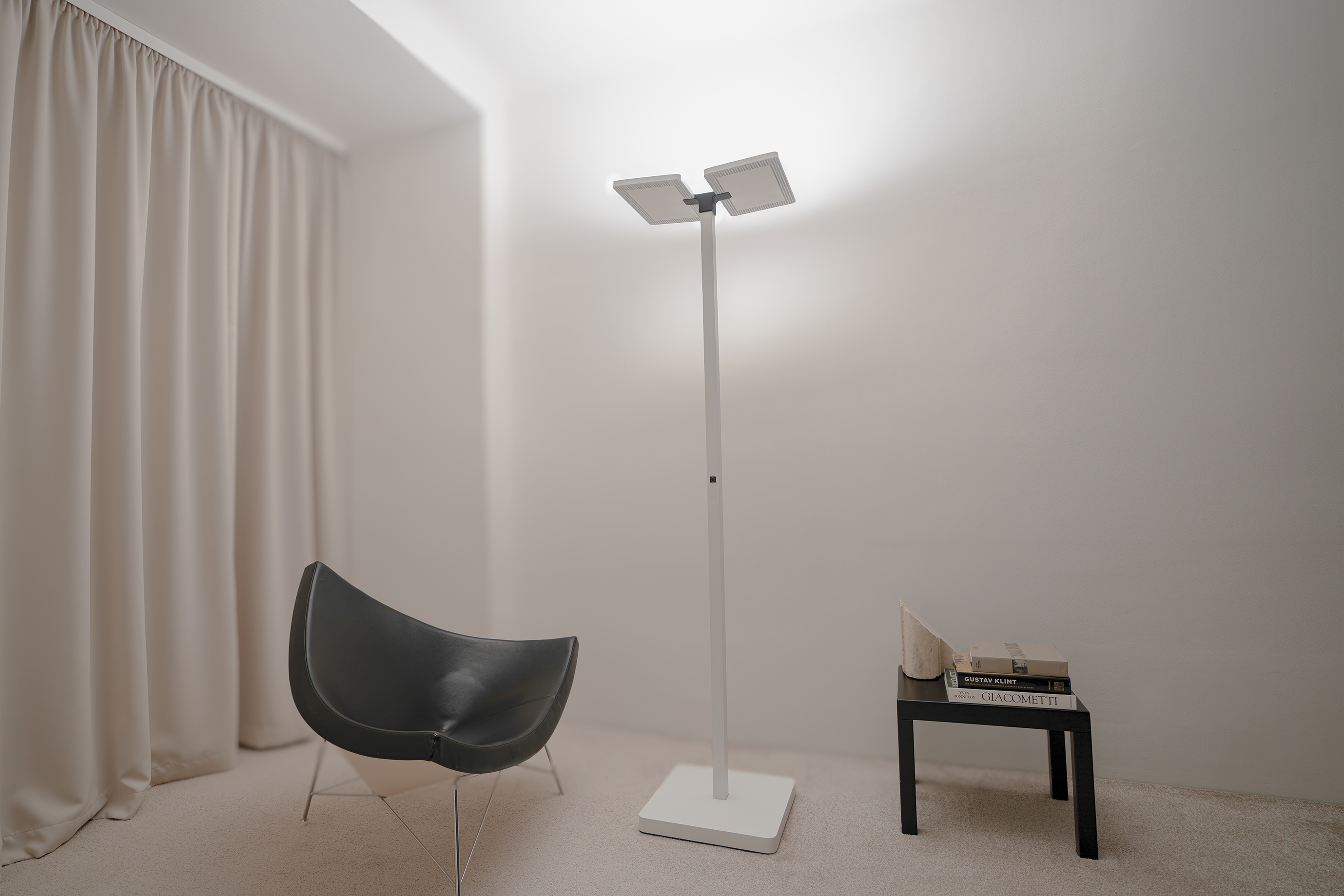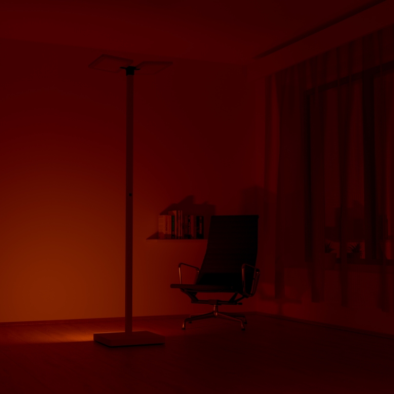 The daytime mode, provided by our LED modules, imitates natural sunlight and is patented for its unique balance and pro-cognitive properties of the spectrum and regenerative red component, which, among other things, protects our eyes from the risks of harmful blue light. The daytime mode shines indirectly on the ceiling, giving the impression of a clear sky. It stimulates the body towards activity and alertness, supports cognitive function and mood.