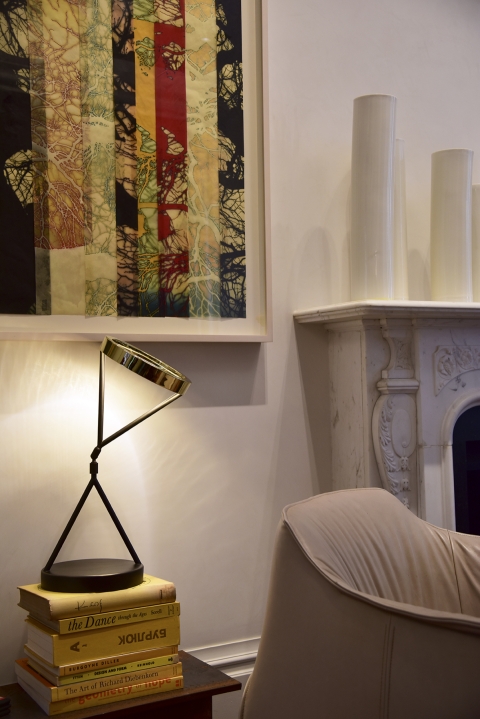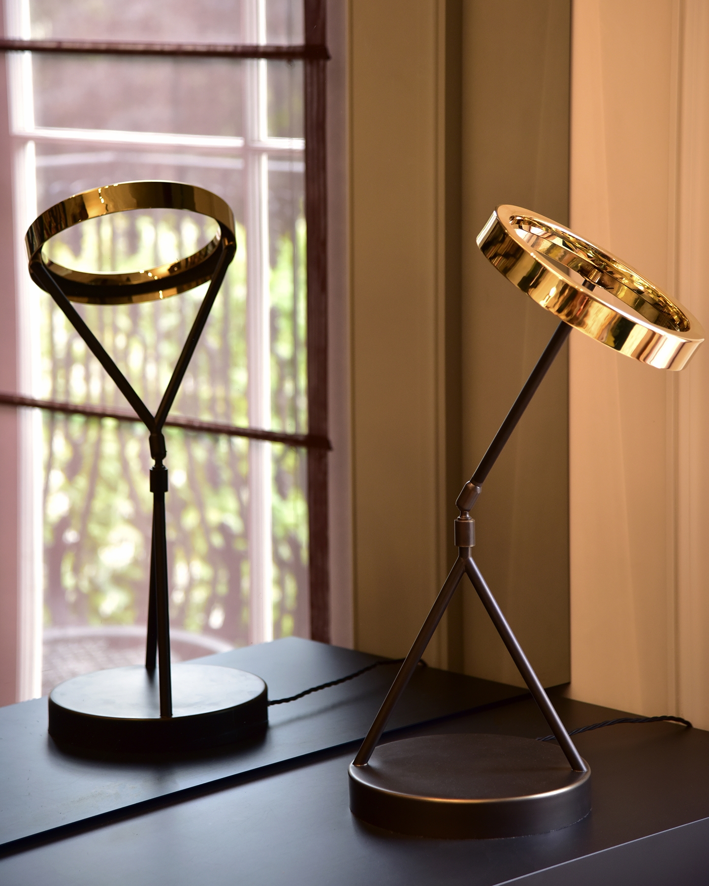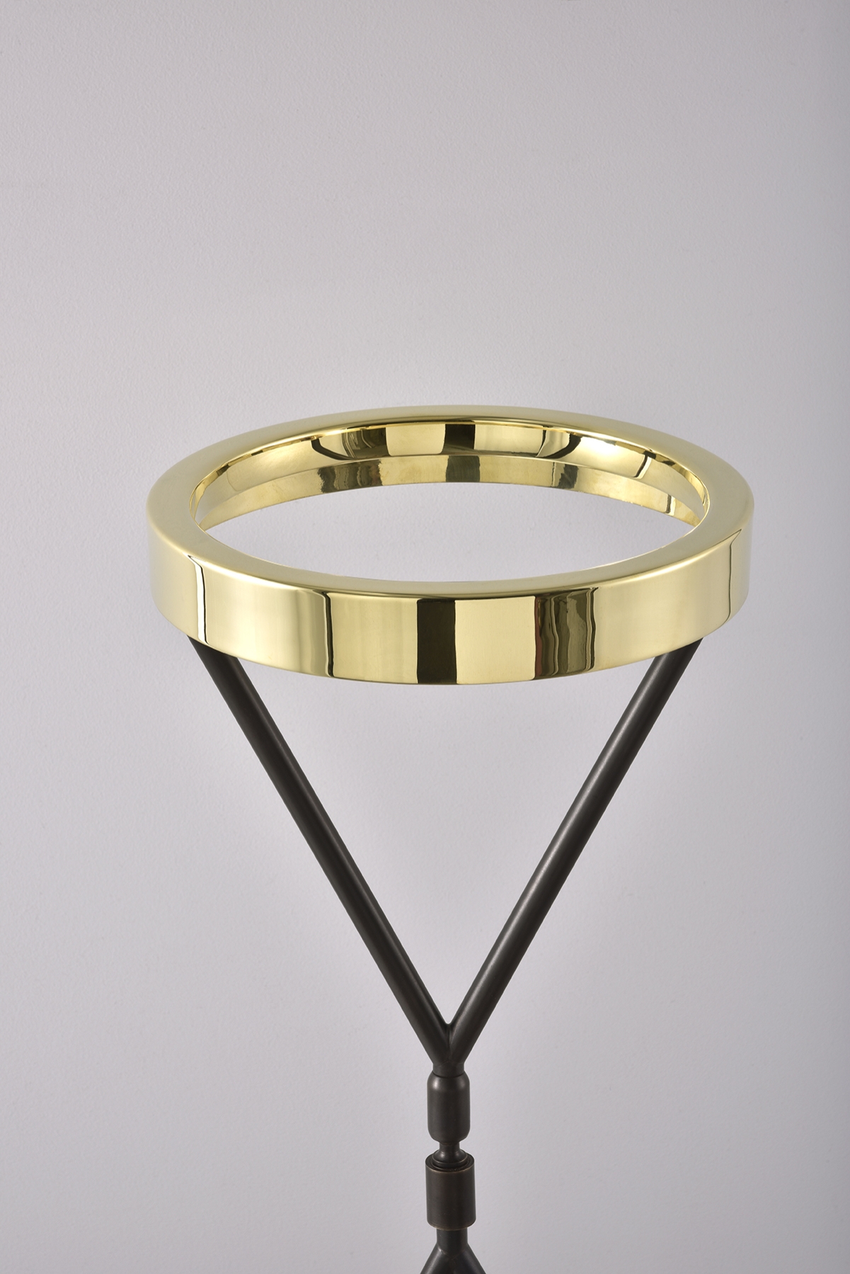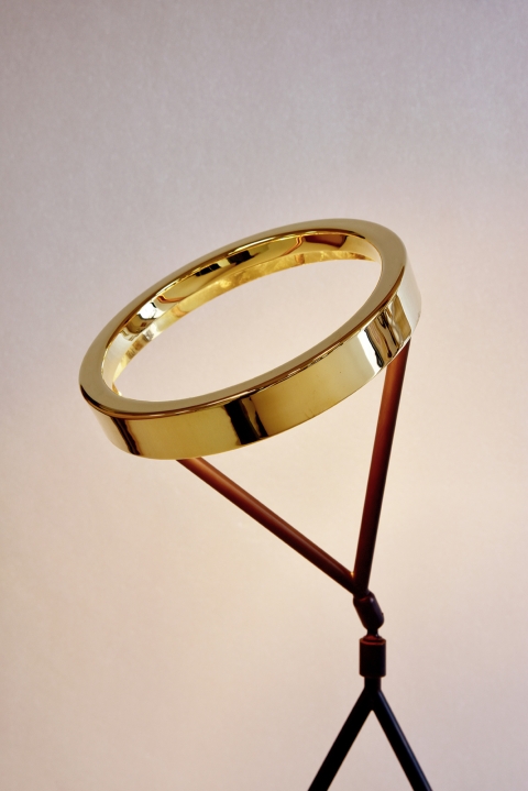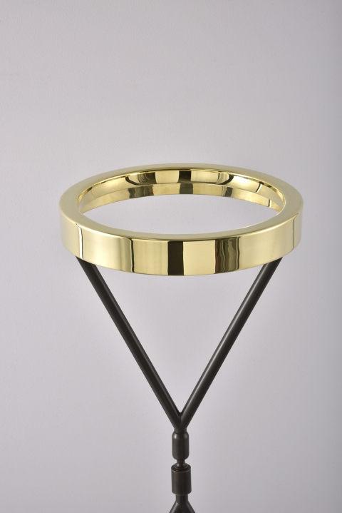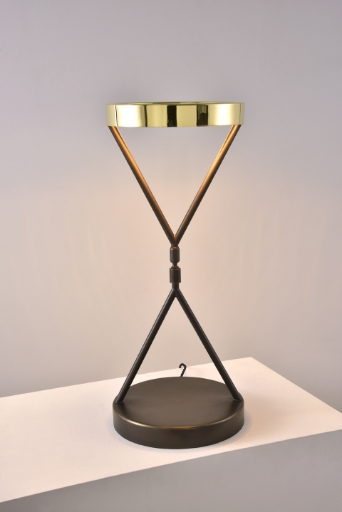 With a polished Brass finish to the top and Antique Bronze to the stem and base, the Eternity Light measures an impressive 550mm in height. The top of the lamp conceals an LED strip, creating a halo-like glow. The adaptability of the structure allows the light to either glow in a general diffused area or when tilted will provide a more focused light, making it ideal as a modern-day desk lamp or sculptural piece placed on a console table.