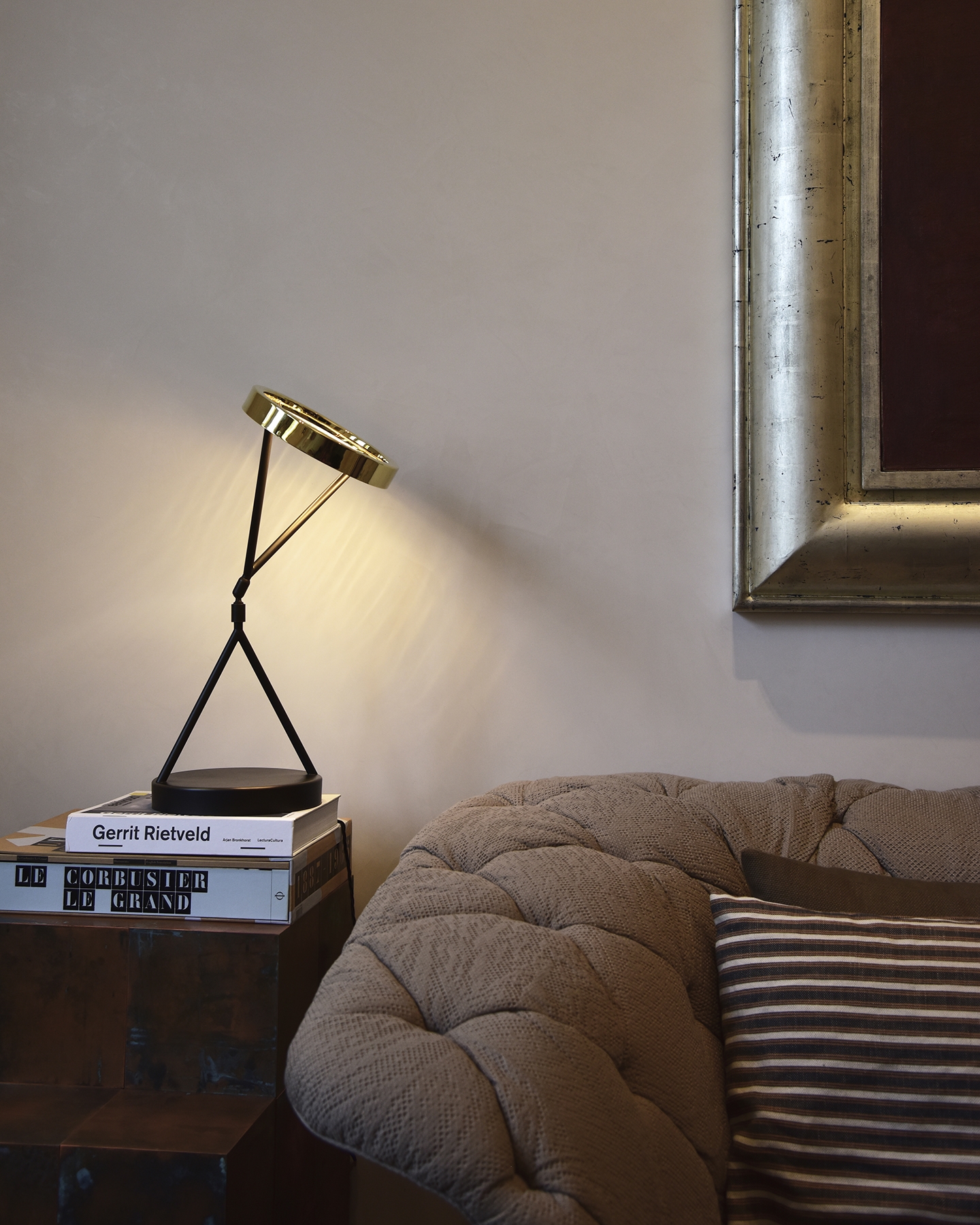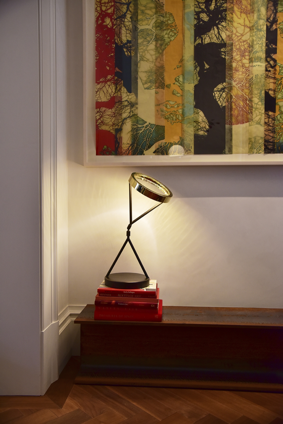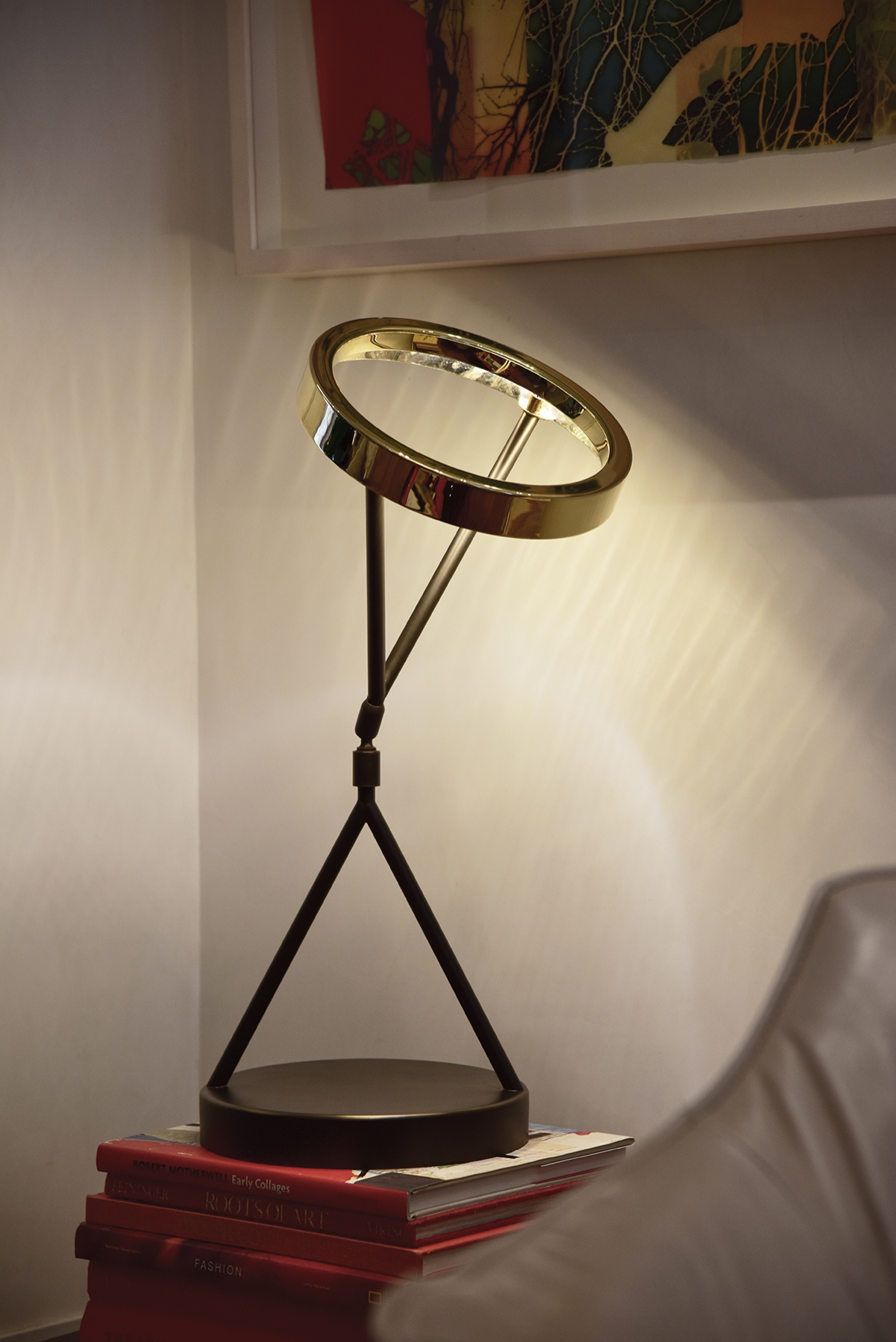 With a polished Brass finish to the top and Antique Bronze to the stem and base, the Eternity Light measures an impressive 550mm in height. The top of the lamp conceals an LED strip, creating a halo-like glow. The adaptability of the structure allows the light to either glow in a general diffused area or when tilted will provide a more focused light, making it ideal as a modern-day desk lamp or sculptural piece placed on a console table.