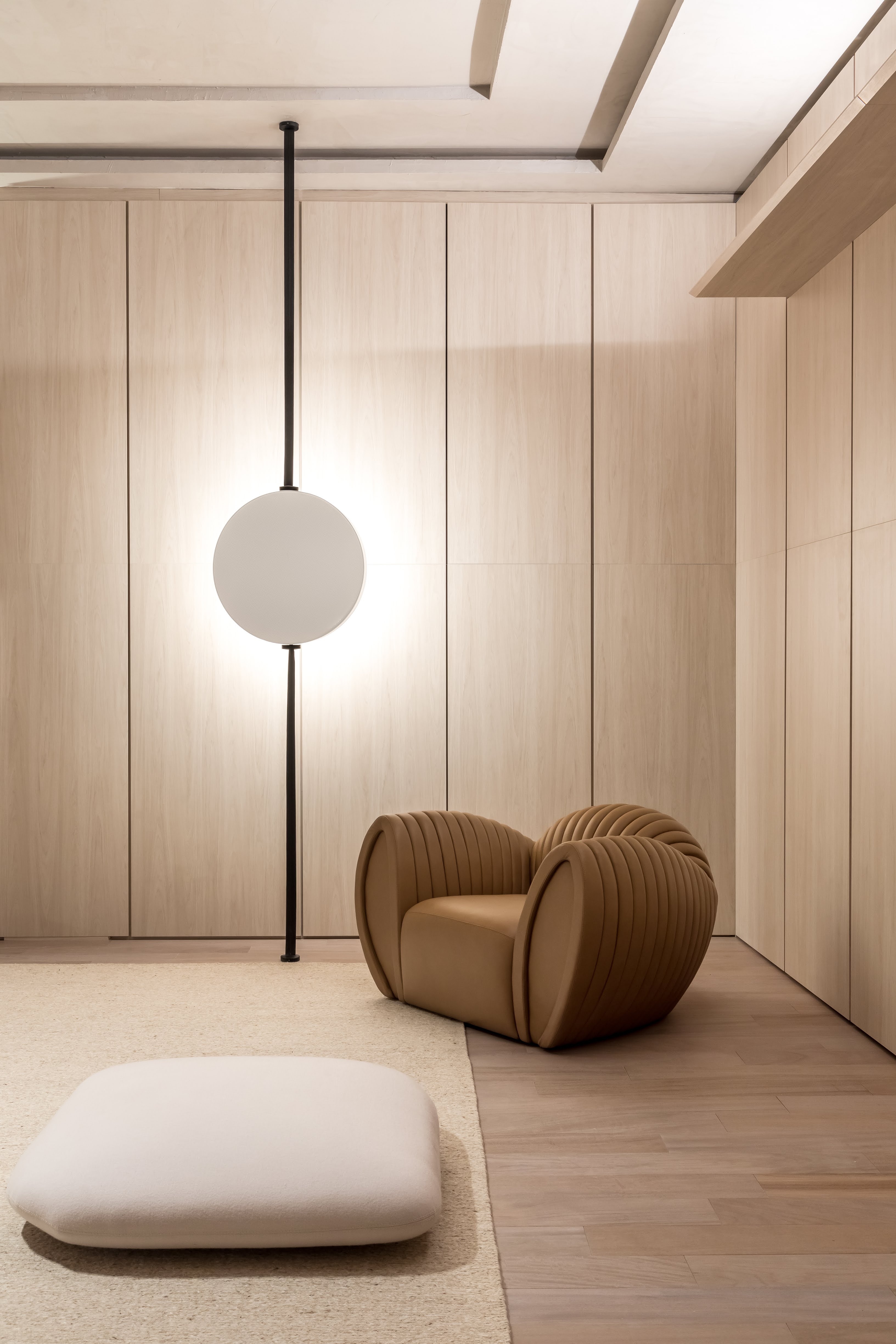 O couro sintético perfurado e o tecido difusor são materiais que conduzem o conceito criado pelo designer. Aplicados na parte superior e inferior da estrutura, respectivamente, proporcionam um maior conforto acústico ao ambiente.