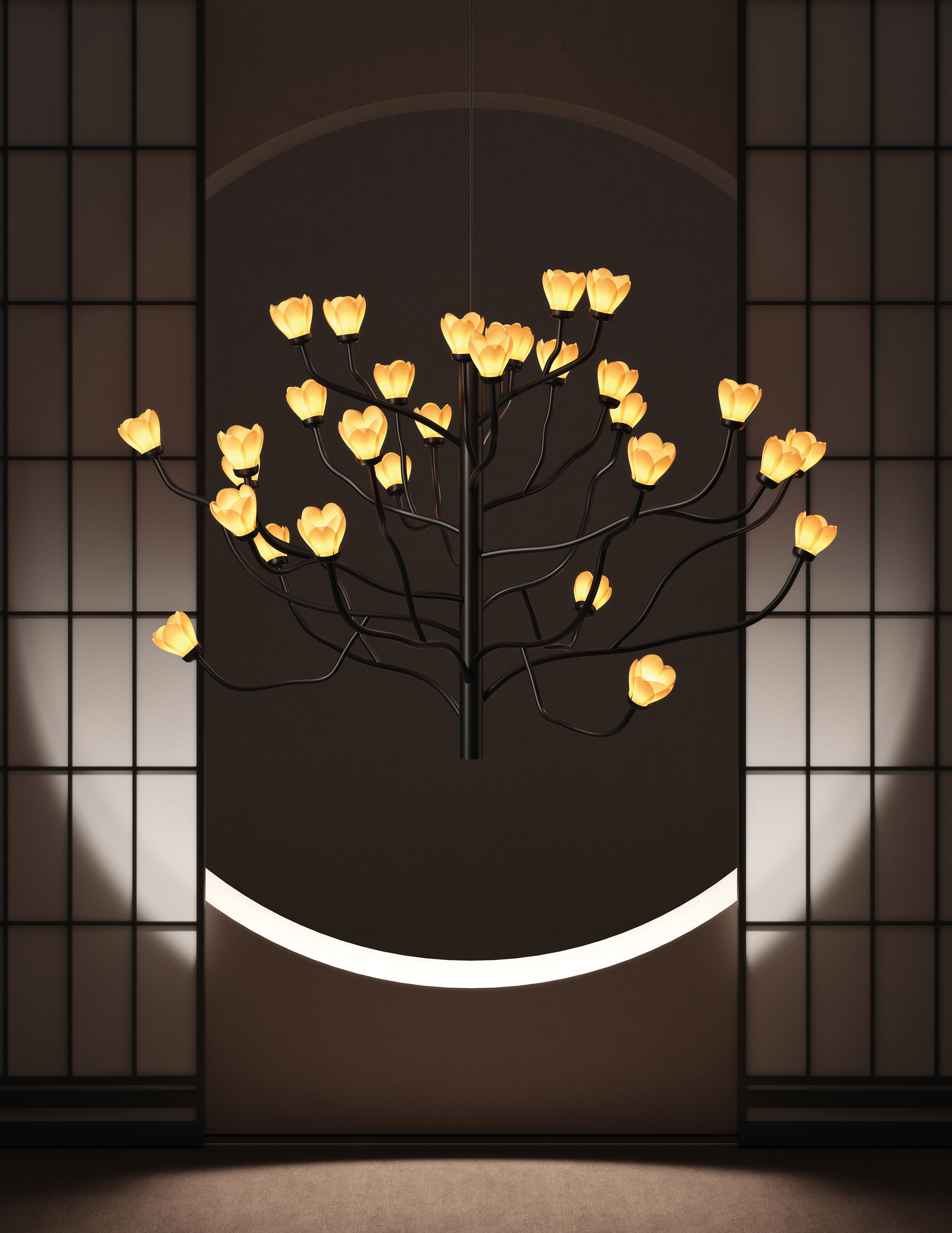 The flowers of the magnolia are attributed with meanings like nobility, while their slender exotic forms are believed to be among the most beautiful in nature. All the flowers that compose Mokuren are handmade with porcelain, a natural material made from a combination of three locally sourced minerals: quartz, feldspar and kaolin, mixed with water. The warm light that filters through the translucent porcelain of its petals generates an enveloping illumination.