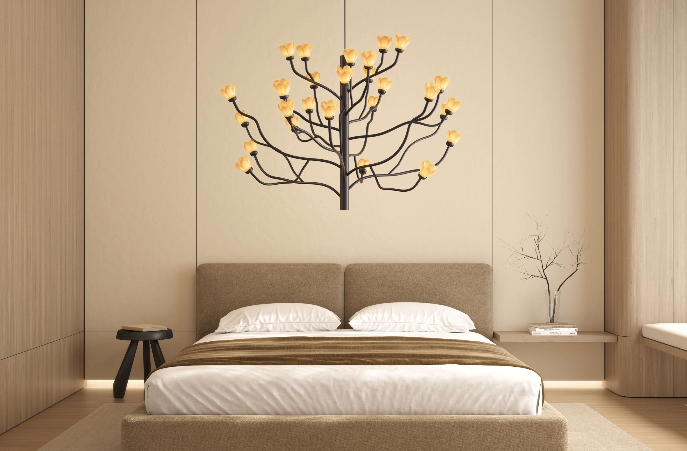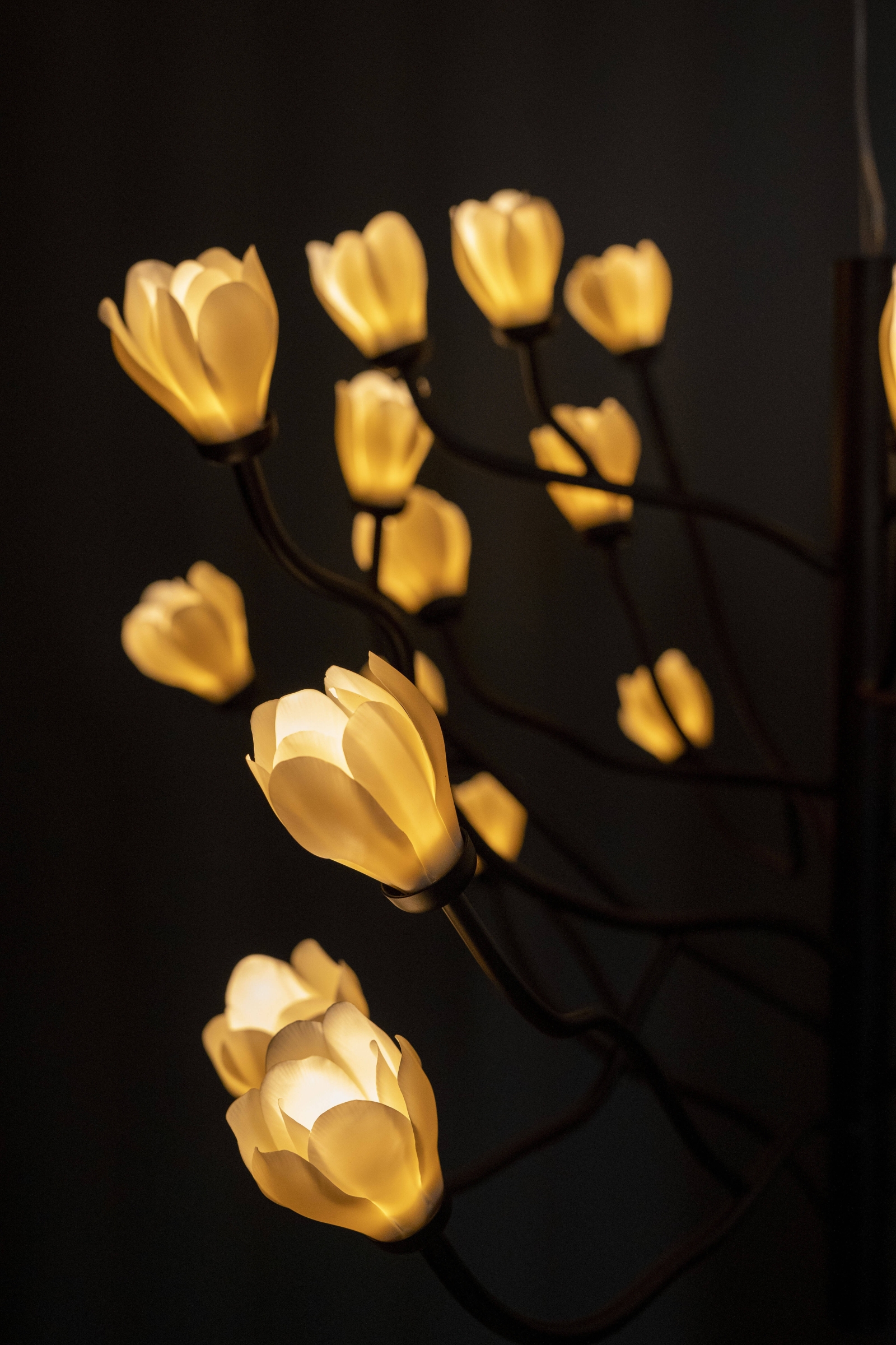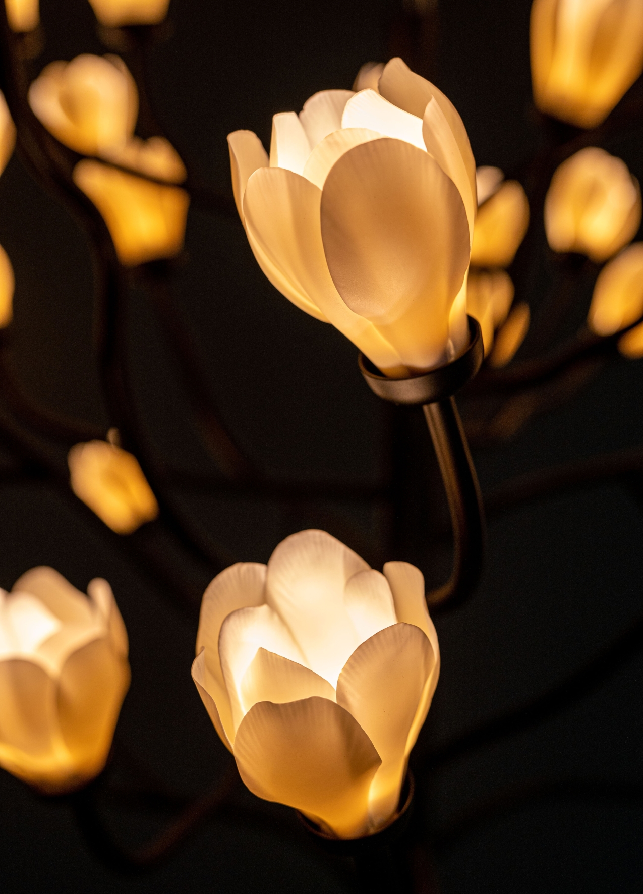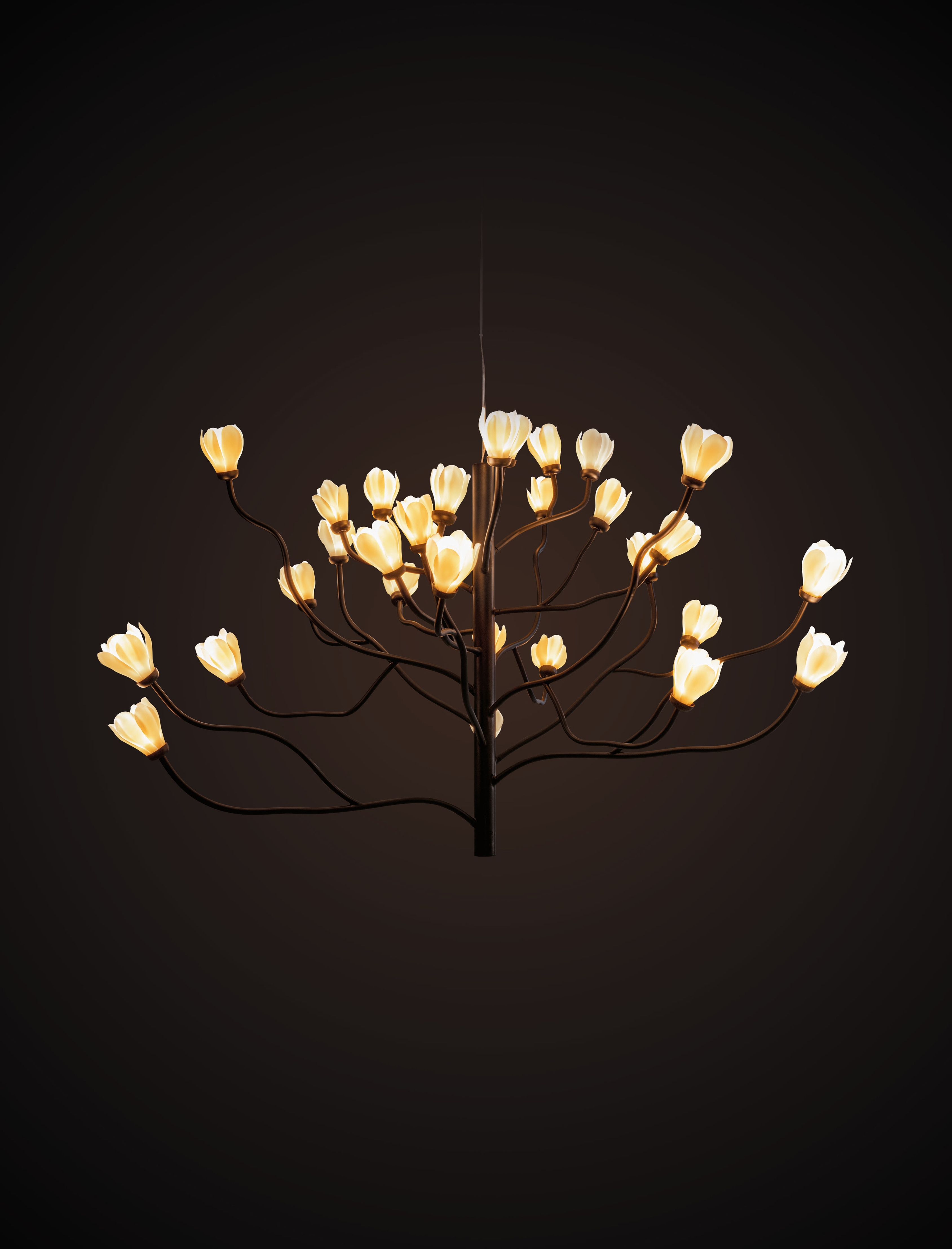 In contrast, the black-lacquered aluminum structure, as complex as it is poetic, represents the branches of the magnolia, one of the Earth’s oldest flowering plants. Its LED lighting can be regulated in intensity.