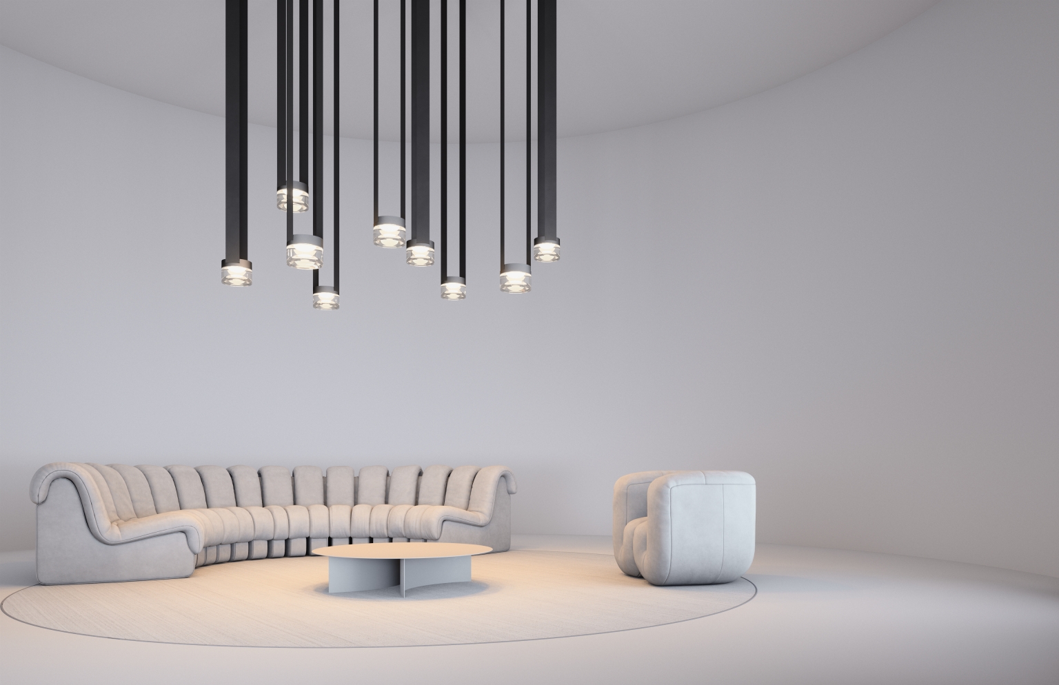 Precision machining from a block of solid glass gives the Tangram-Cut pendant its striking, jewel-like feel. Internal frosting and a distinctive concave bottom help to diffuse light from the 8-inch diameter luminaire. The unique aesthetic is suited to luxurious environments such as high-end hospitality settings. Designers can choose a clear or frosted finish and a range of outputs; depending on the selected combination, Tangram-Cut delivers from 1,216 to 2,500 lumens.