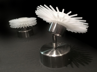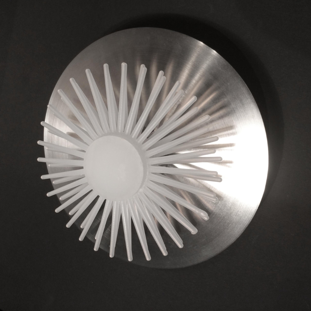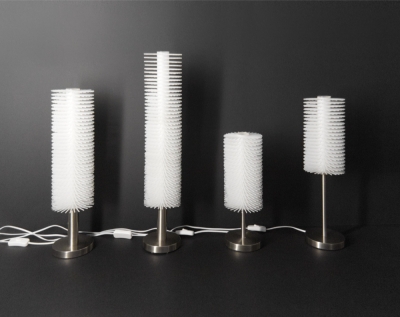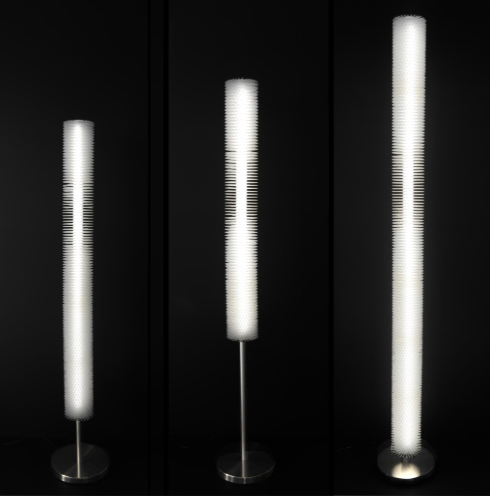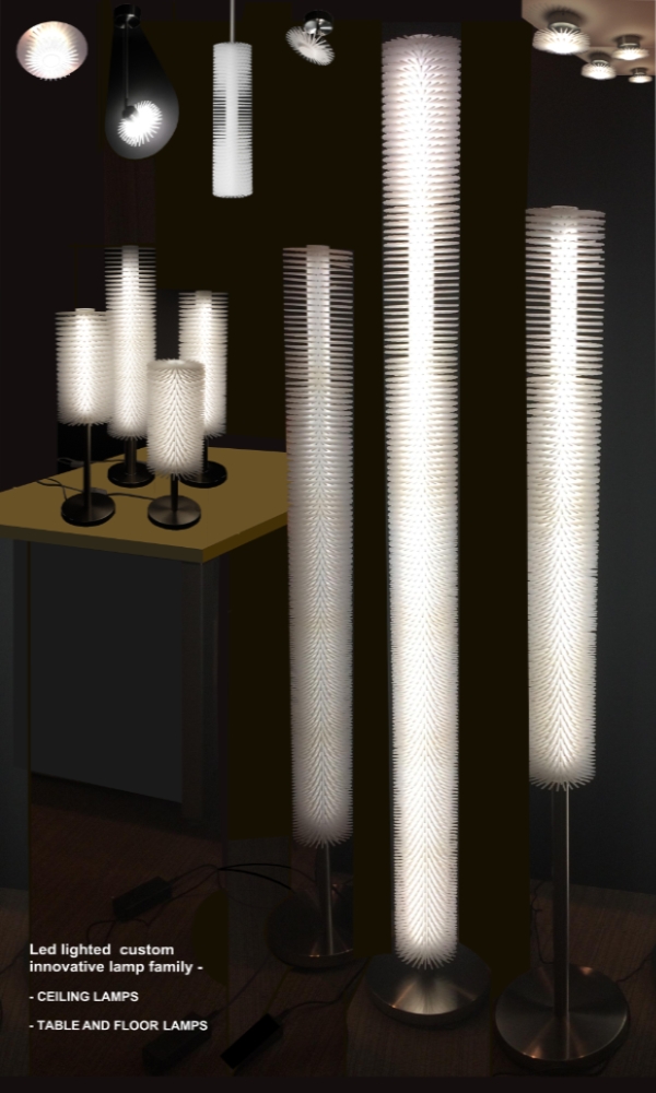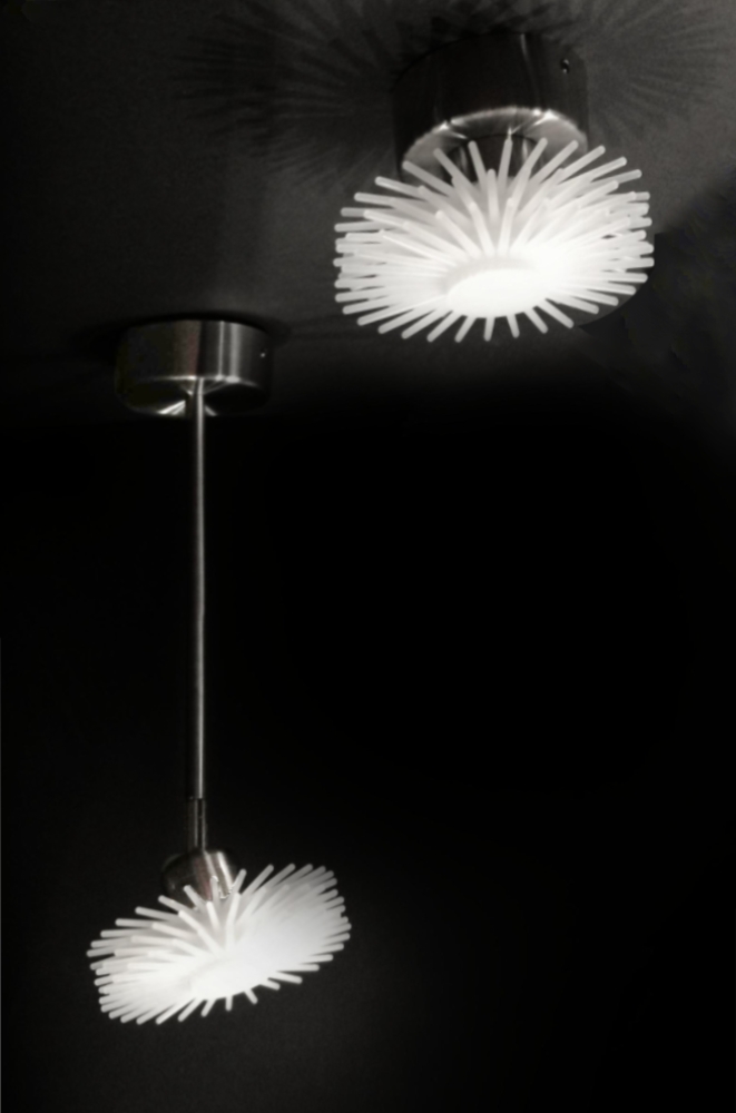 Entry DescriptionThe LED star flower lamp family is made by stringing spiky white polystyrene discs on a plexiglass support tube. The cylinder has 125 mm diameter and 12 mm high polystyrene disks, the toothed rings form a dense cylinder with spikes by rotating the next element. By queing the elements , we get a differing long lighting cylinder . The lighting cylinders with a stainless base plate are made with stainless steel pipes of different diameters and lengths, different heights, from which different lamps can be made: vertical hanging lamp: D125x975mm; horizontal hanging lamp D125x970x745mm; Floor lamps D250 mm, total height 1260; 1560; 1740 mm, with lighting cylinders of different heights. The pressed discs of the table lamps are D110 mm, their total height is 627; 510 and 396 mm. The adapter is hidden on the ceiling in a cylindrical or rod-shaped stainless steel junction box. The 2- or 3-part discs are rotated by 90° and screwed to the base element with a turned stainless steel connector, or flower-like lamps with hinged stems are obtained. The lighting cylinders of the hanging, standing and table lamps have 12 W 4000 K LED strips on both sides of a 20x20 mm square aluminum tube. The point lamps are Luxeon TX Star 1 W, 4000 K LED; LED DC TRANSFORMER 1-4W, they work with SELV transformer. Their dimensions: D 125 x 68-78; 150; 378 mm; lamp 2,- 275; 3,- 424 mm, with reflector D 170x78 mm.