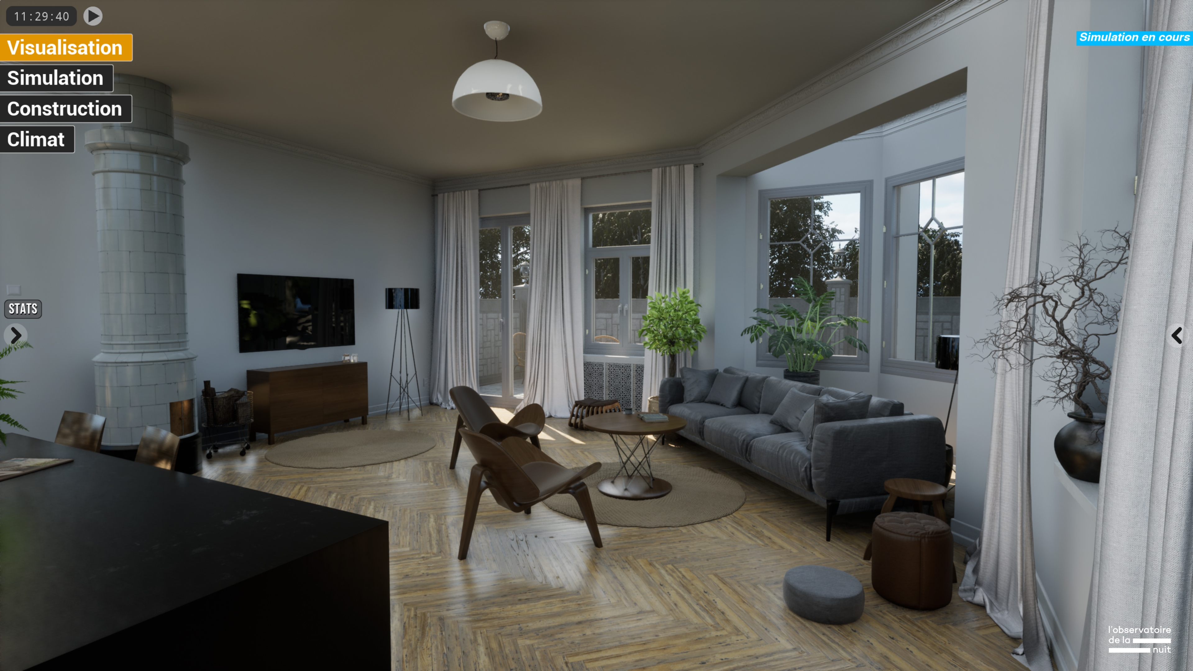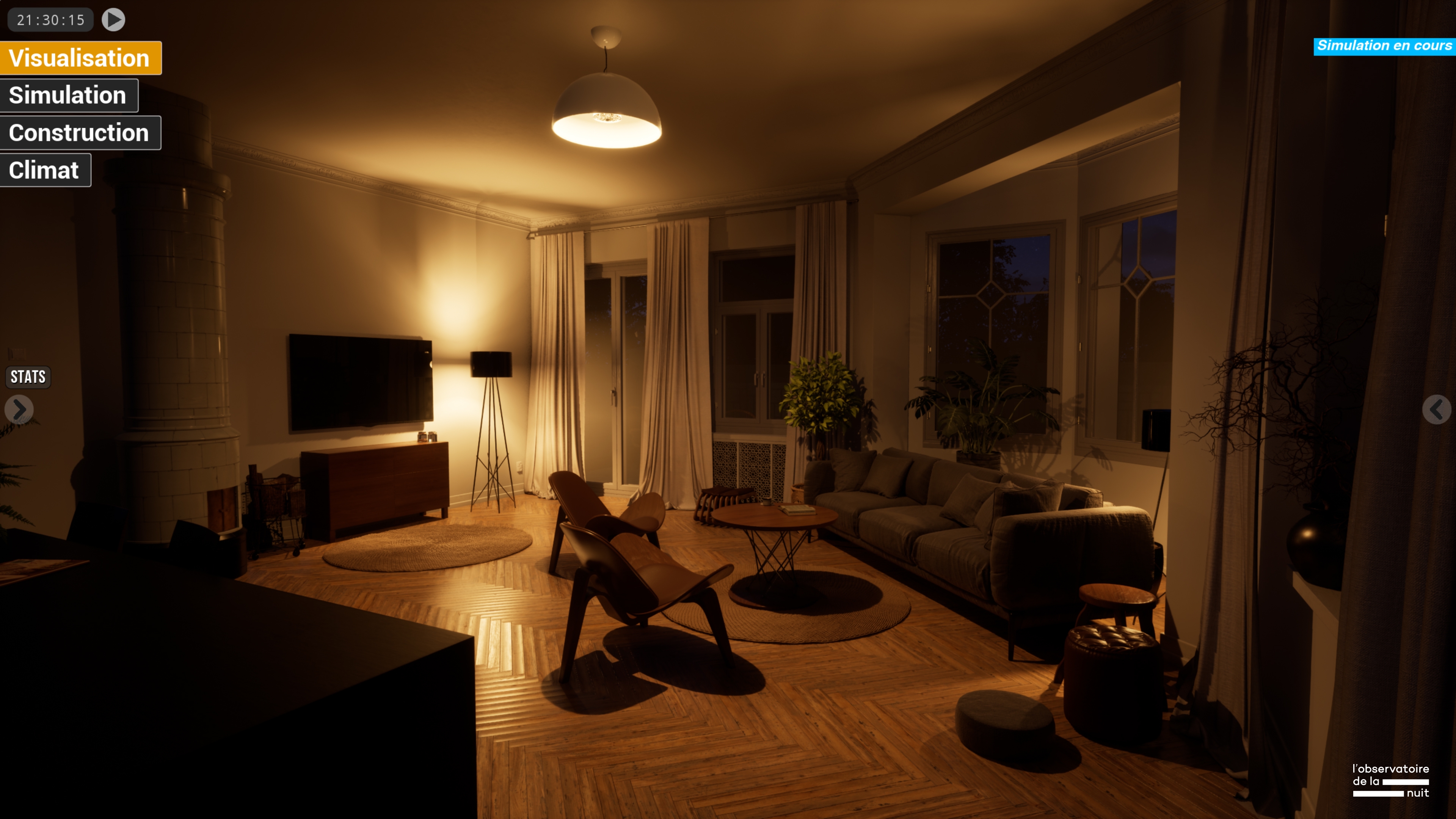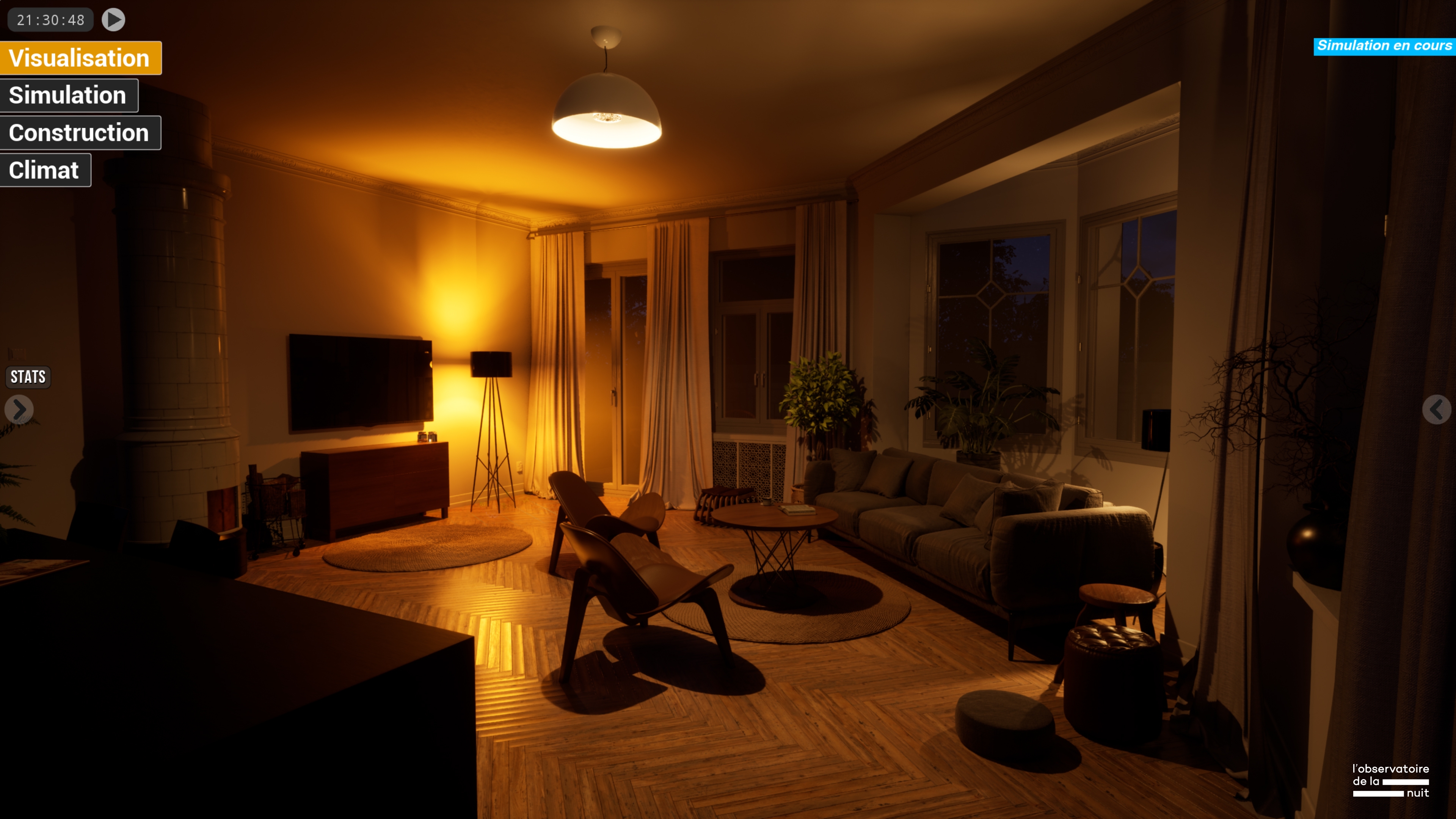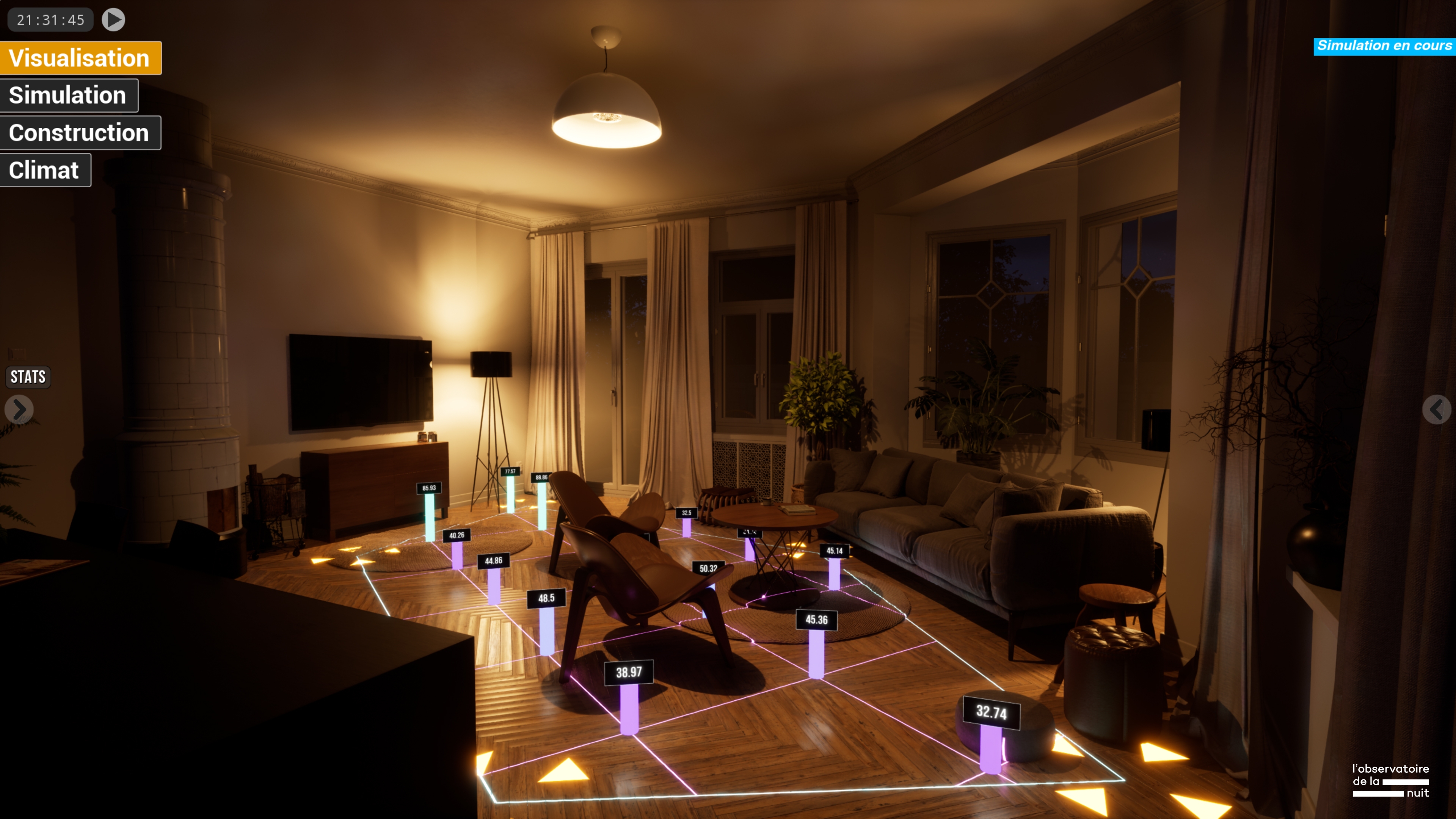 Obscura It is an immersive interface that simulates artificial lighting environments in real time, based on real geographical, environmental, and material data. It allows to reconstitute specific geographical, urban, and interior environments and to simulate, analyze and improve artificial lighting practices.