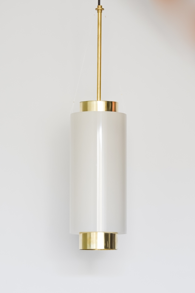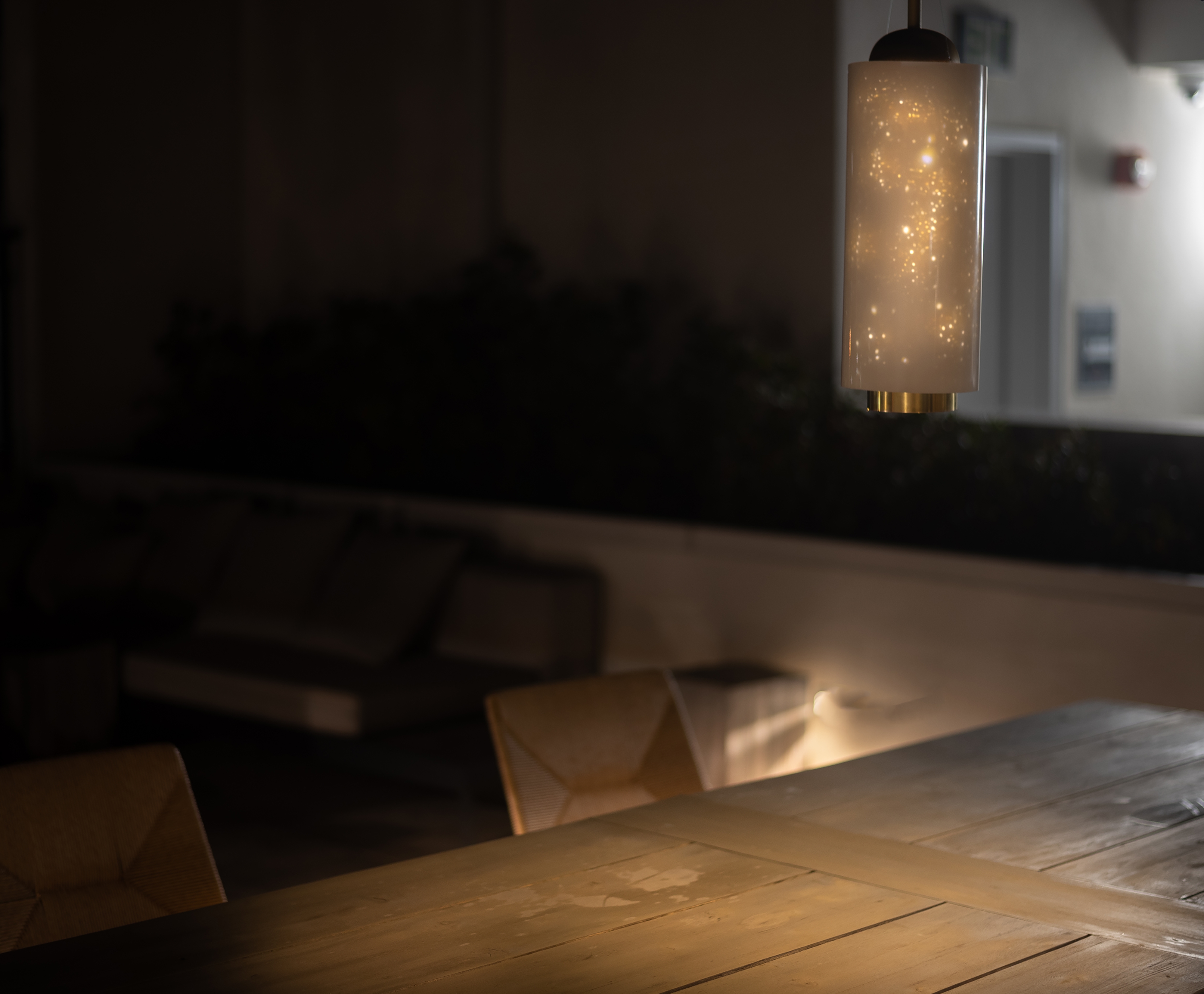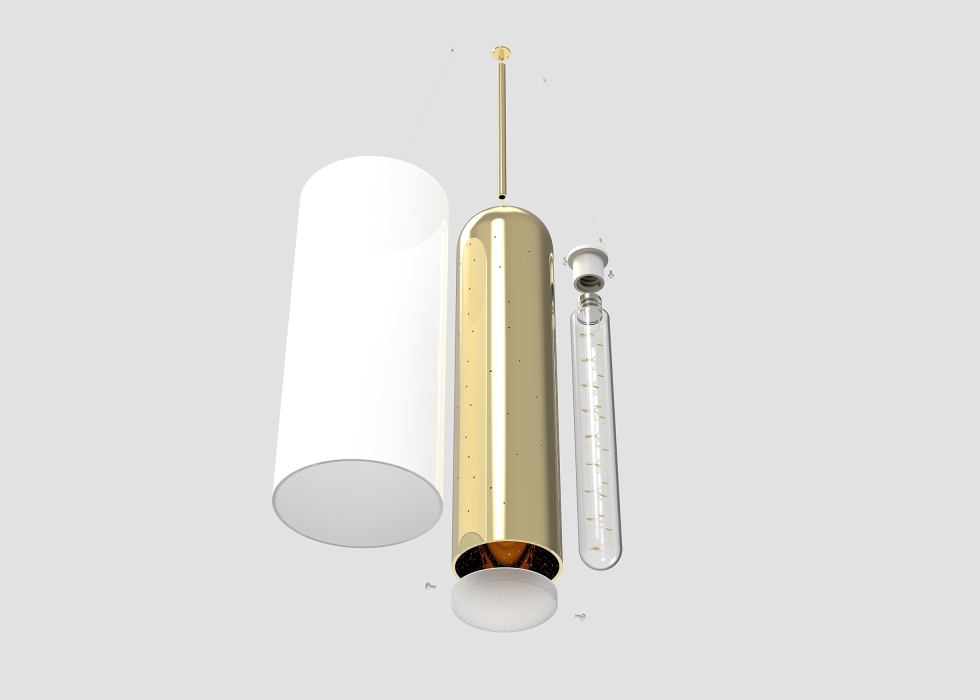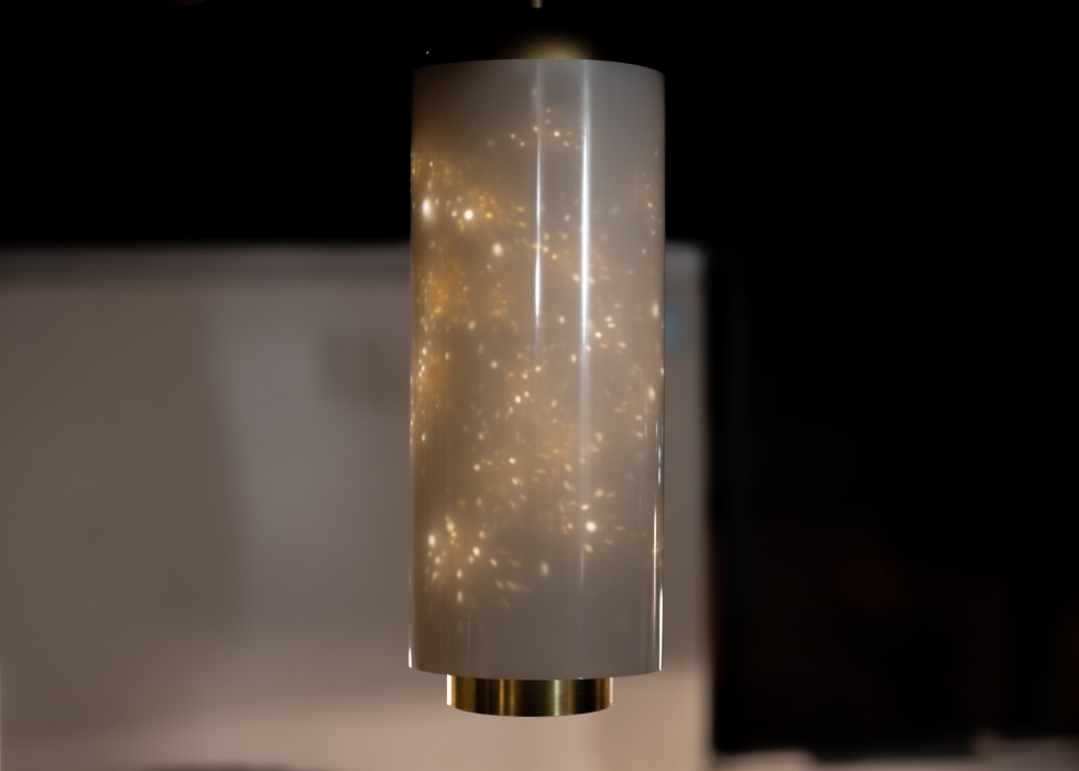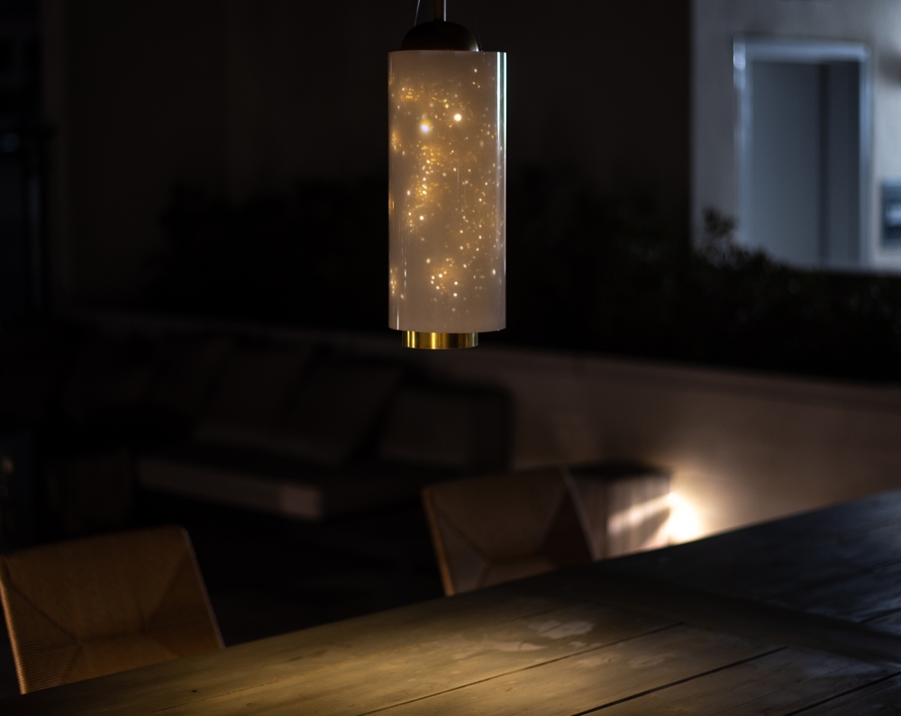The inner perforated brass tube projects starry light effects onto the outer recycled polyethylene tube. The brass tube is fixed in place, while the outer polyethylene tube hangs from the top of the light fixture and moves subtly and elegantly with the breeze. The subtle movement in the polyethylene tube allows the star projection to flow, creating a magical and transforming starry night, while the downlight provides a steady light source for general usage.